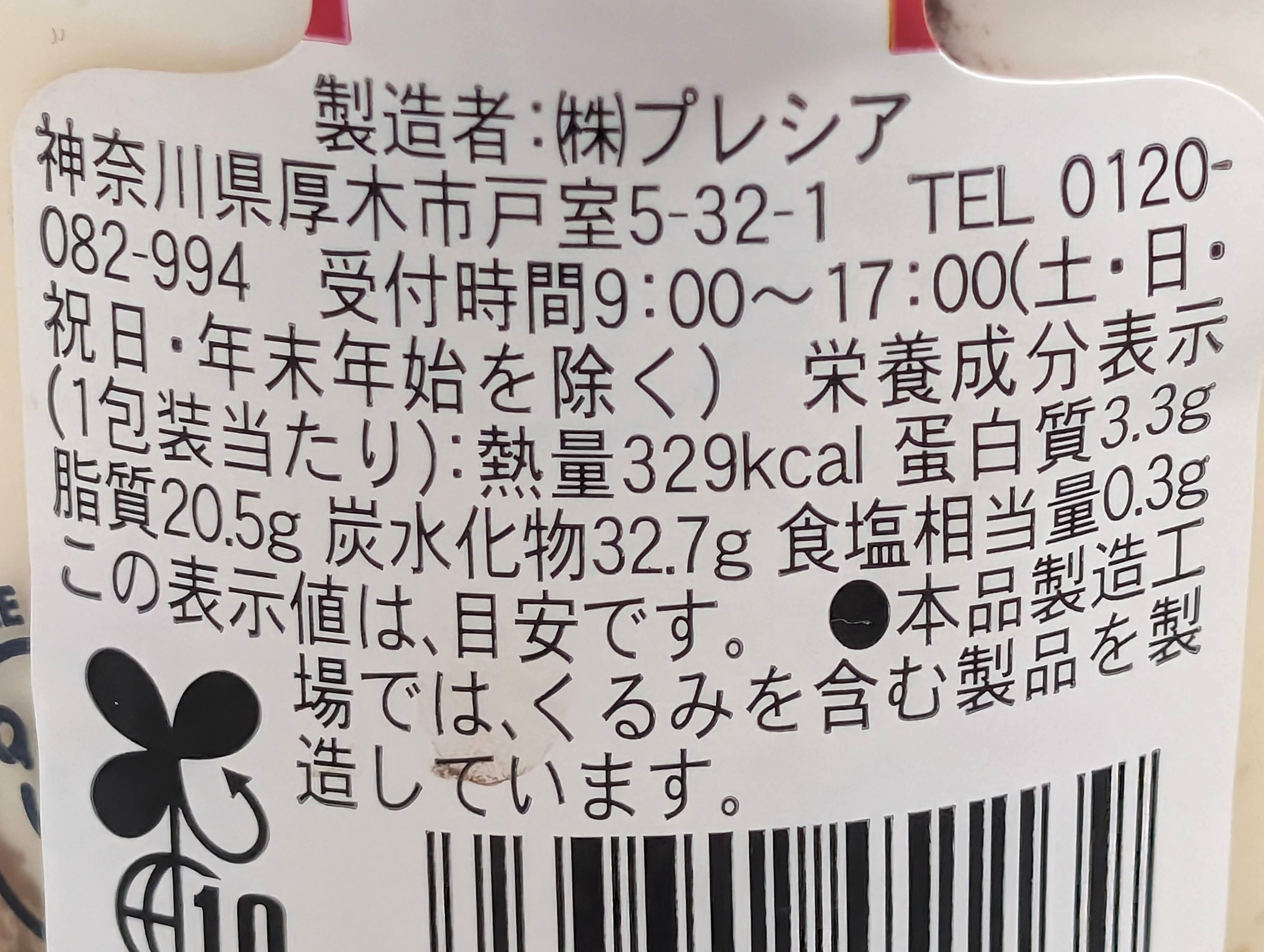 | 栄養成分表示 (1包装当たり) | 熱量 329kcal、蛋白質 3.3g、脂質 20.5g、炭水化物 32.7g、食塩相当量 0.3g (この表示値は、目安です) |