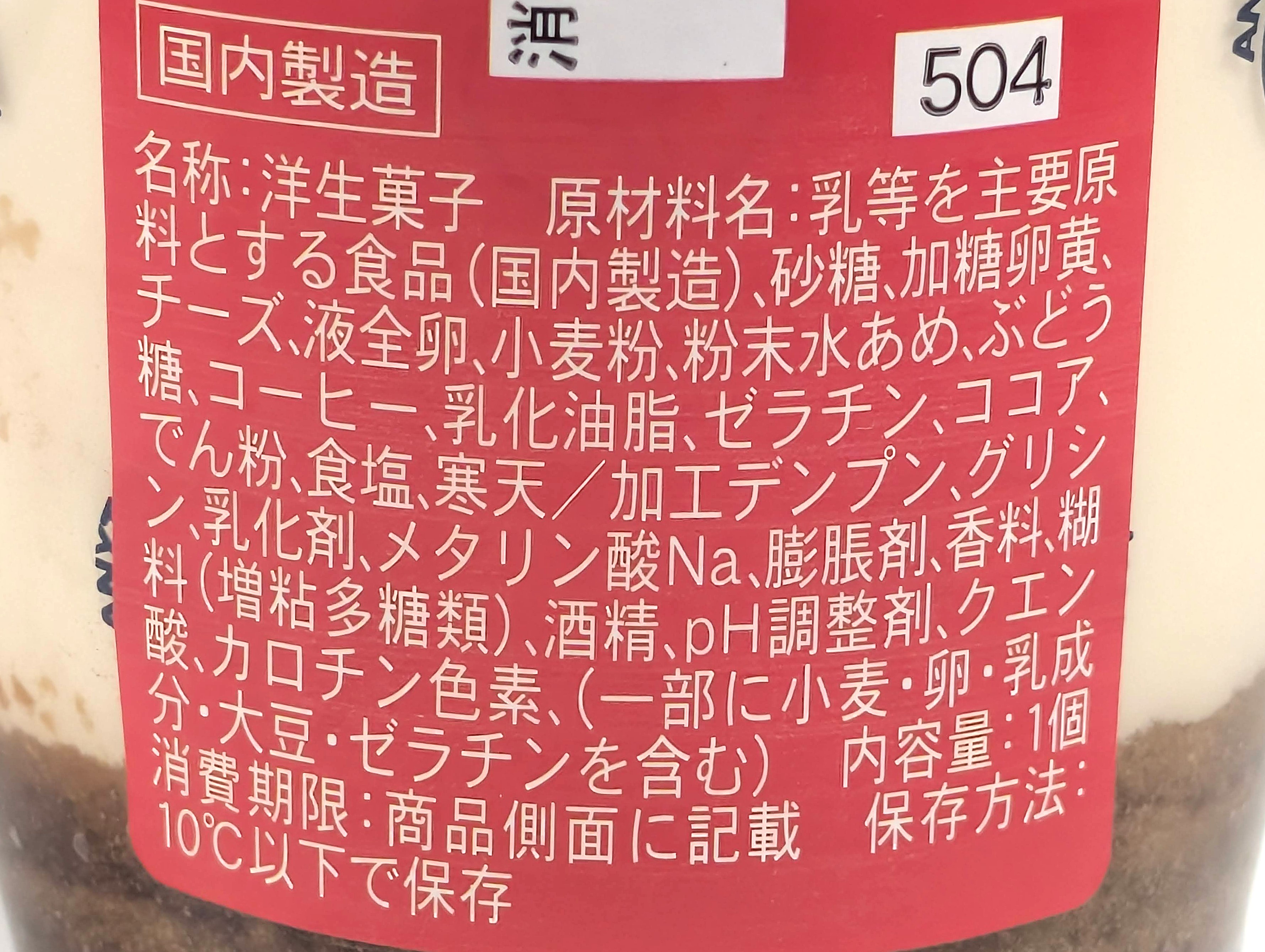 | 原材料名 | 乳等を主要原料とする食品(国内製造)、砂糖、加糖卵黄、チーズ、液全卵、小麦粉、粉末水あめ、ぶどう糖、コーヒー、乳化油脂、ゼラチン、ココア、でん粉、食塩、寒天/加工デンプン、グリシン、乳化剤、メタリン酸Na、膨脹剤、香料、糊料(増粘多糖類)、酒精、pH調整剤、クエン酸、カロチン色素、(一部に小麦・卵・乳成分・大豆・ゼラチンを含む) |