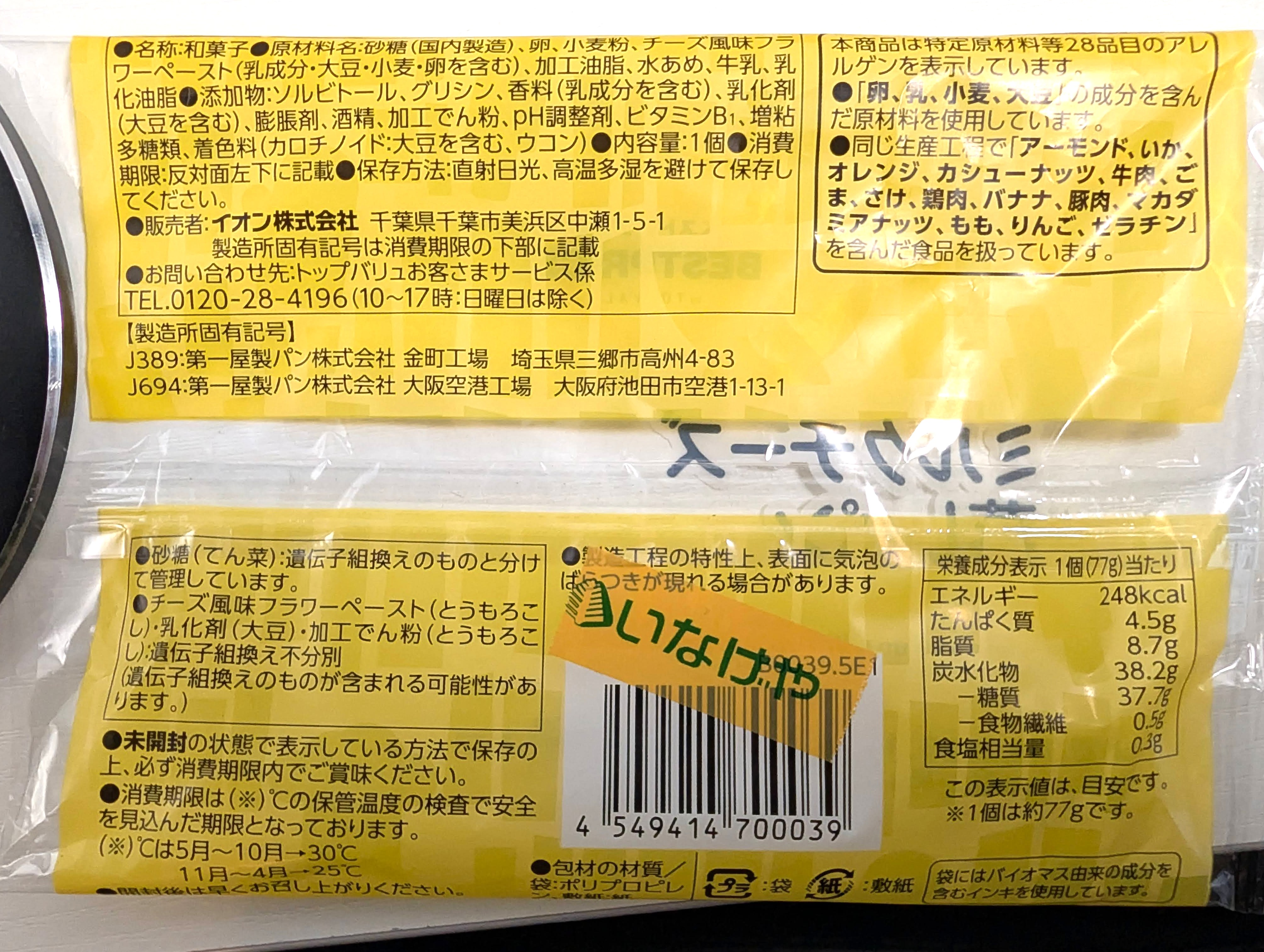 | 原材料名 | 砂糖(国内製造)、小麦粉、チーズ風味フラワーペースト(乳成分・大豆・小麦・卵を含む)、加工油脂、水あめ、牛乳、乳化油脂/添加物ソルビトール、グリシン、香料(乳成分を含む)、乳化剤(大豆を含む)、膨脹剤、酒精、加工でん粉、pH調整剤、ビタミンB1、増粘多糖類、着色料(カロチノイド、大豆を含む、ウコン) |