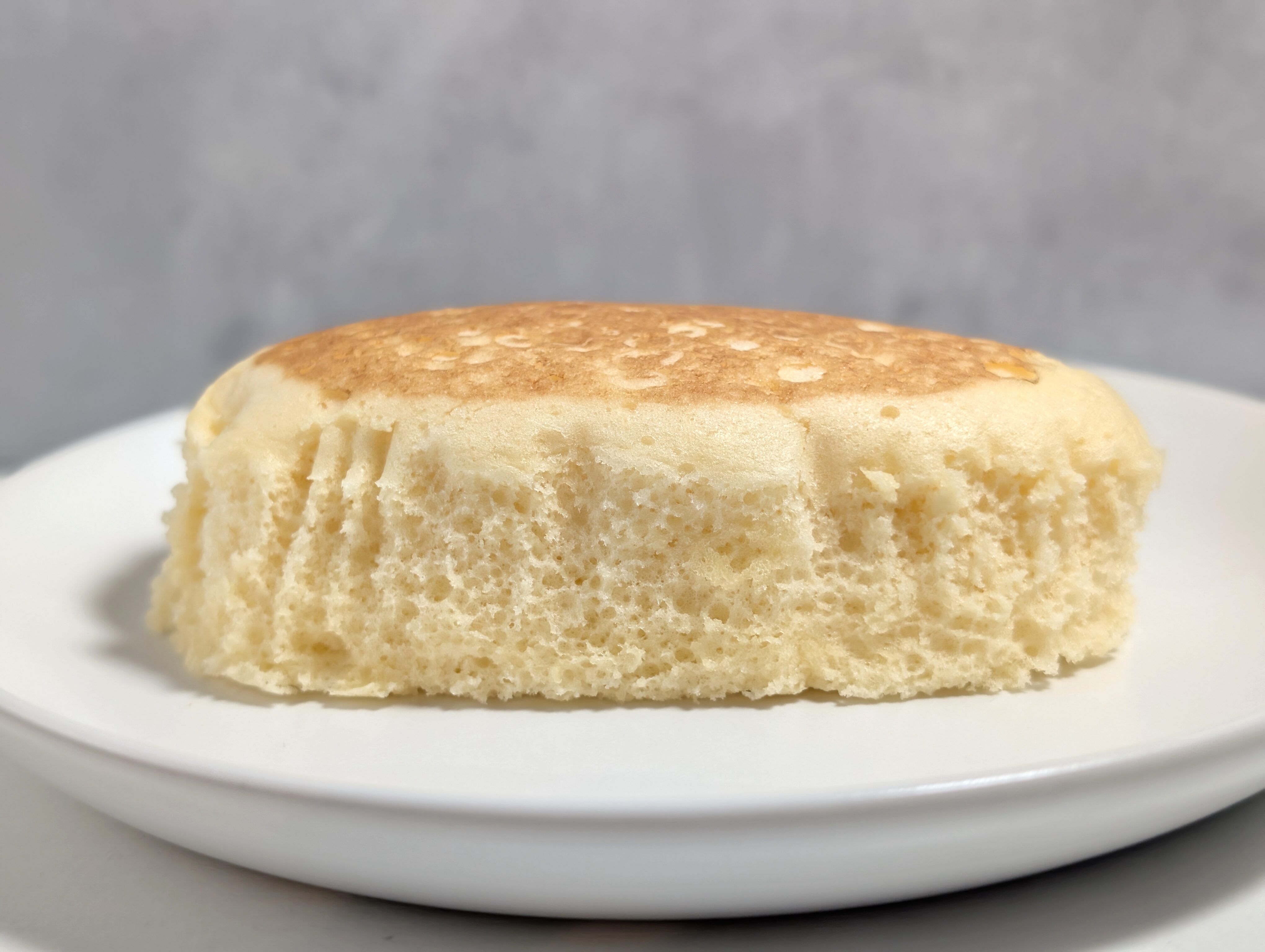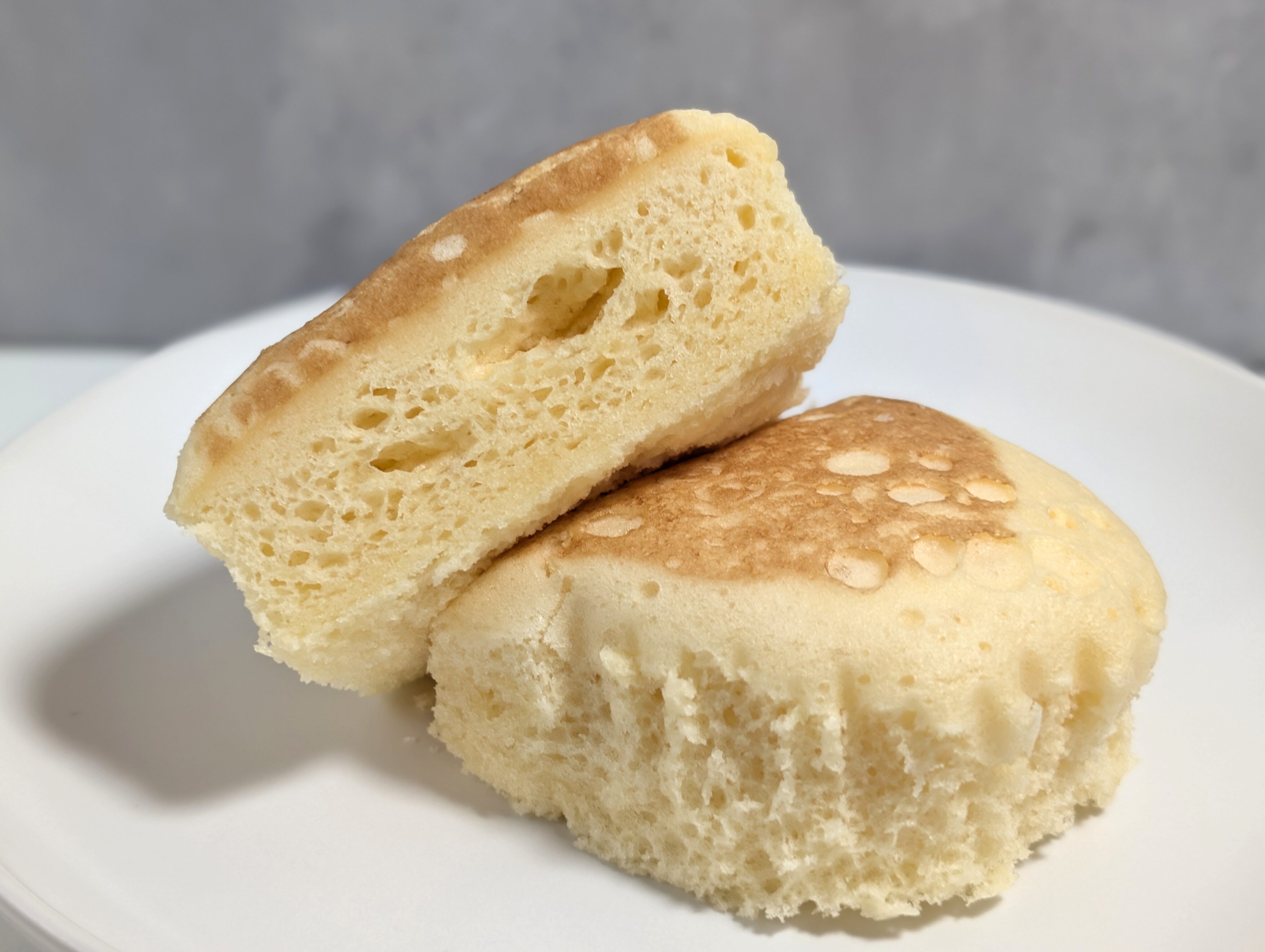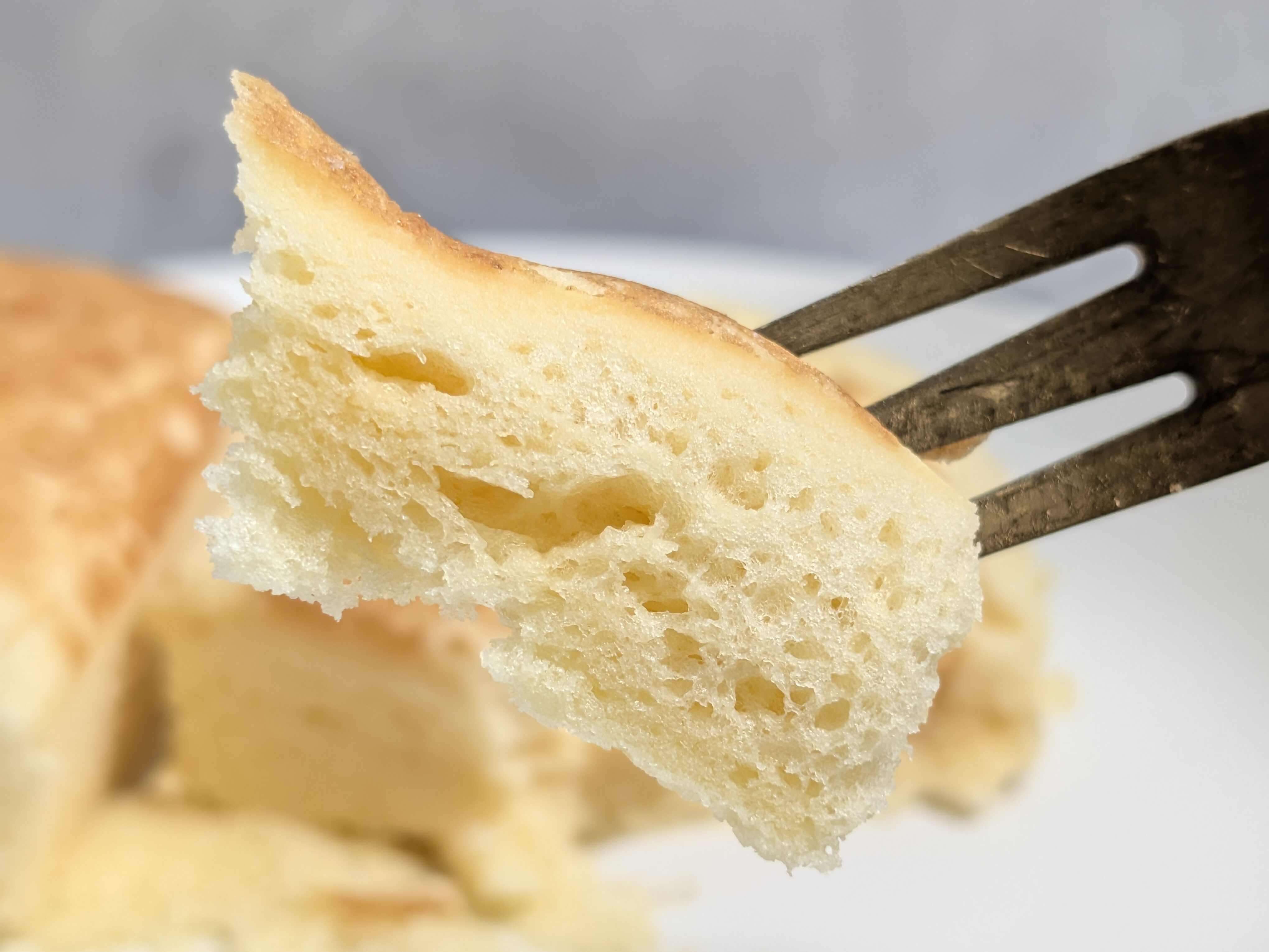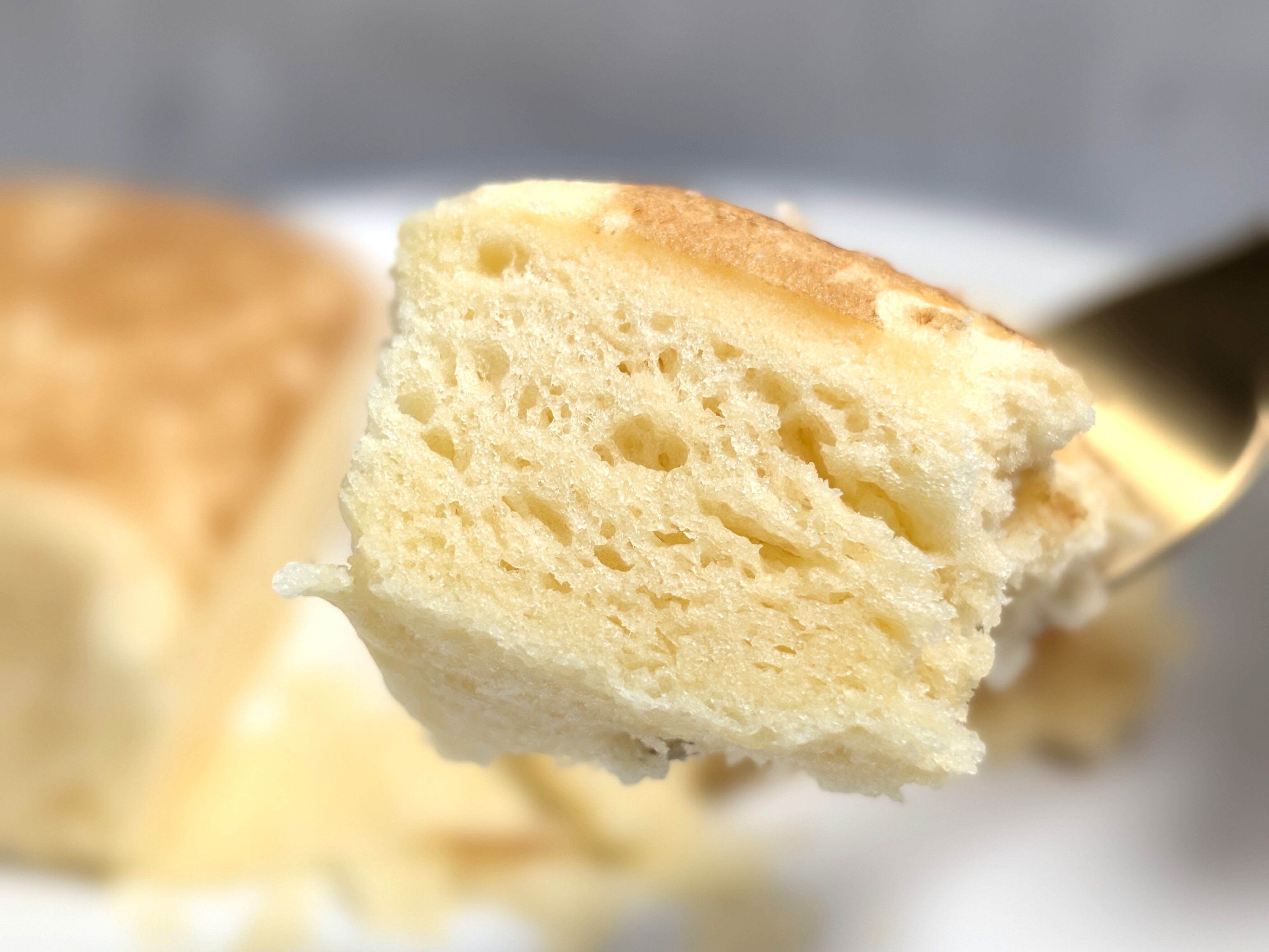 断面を確認すると、一般的なチーズ蒸しケーキに見られる極小の気泡ではなく、大きな気泡がみられます。やはりケーキよりは「パン」に近い質感です。