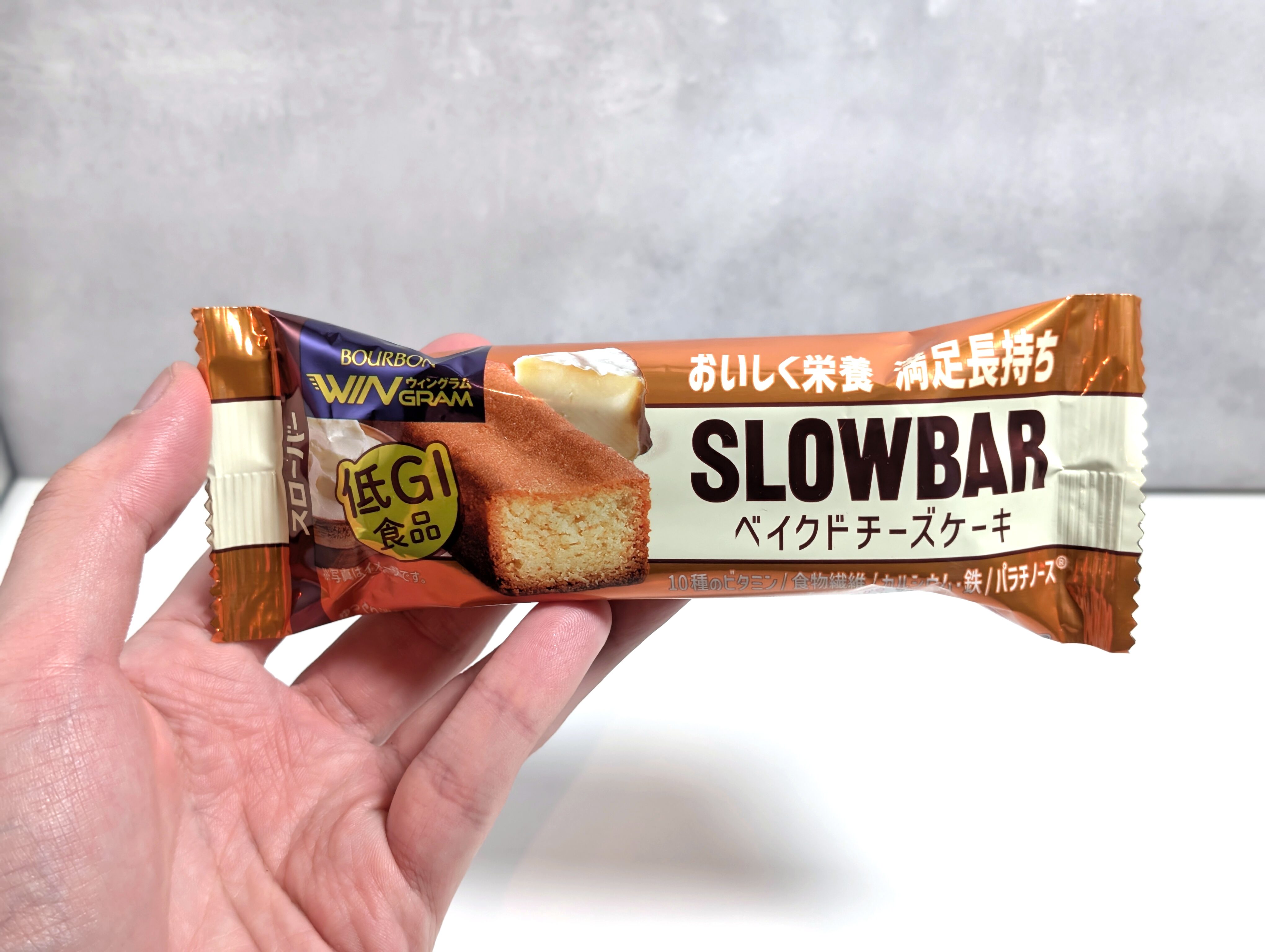 スローバーは「一本満足バー」や「ソイジョイ」のような手軽に栄養補給ができる、いわゆる「栄養補助食品」の一種です。10種のビタミン、食物繊維、カルシウム・鉄を補給できるのに加え低GIが特徴となっています。今回はベイクドチーズケーキ味を購入しましたが、チョコレートクッキー、チョコバナナクッキー、ココナッツミルクなどが他にあります。