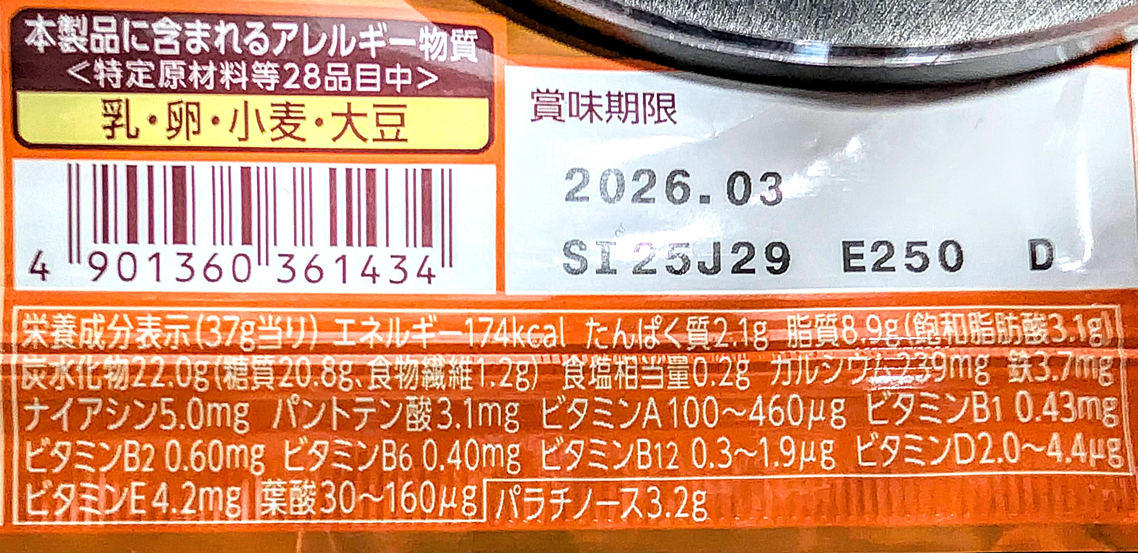 | 栄養成分表示 (1本(37g)当り) | エネルギー 174kcal、たんぱく質 2.1g、脂質 8.9g(飽和脂肪酸 3.1g)、炭水化物 22.0g(糖質 20.8g、食物繊維 1.2g)、食塩相当量 0.2g、カルシウム 239mg、鉄 3.7mg、パラチノース 3.2g ※ビタミン類省略 |