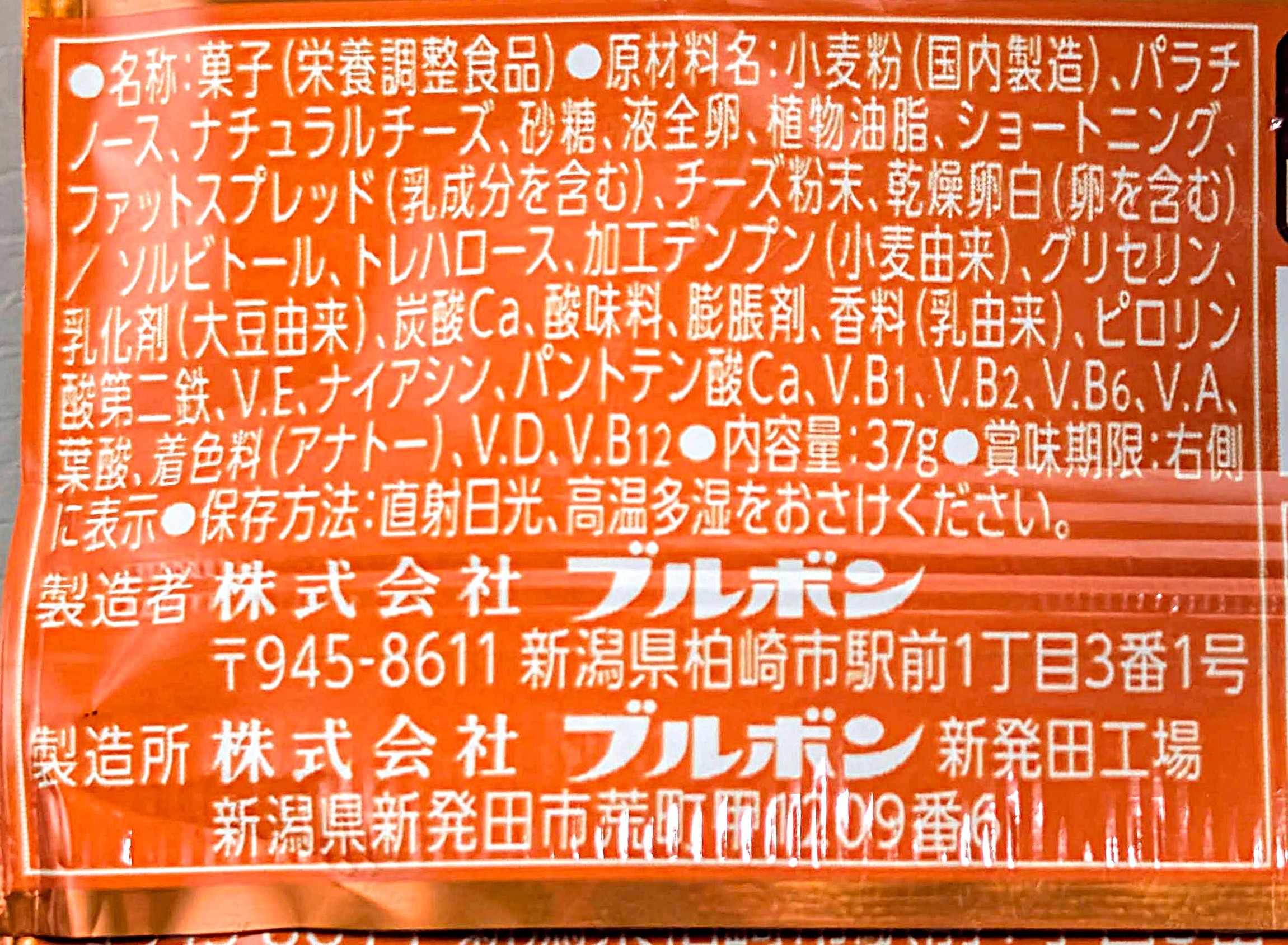 | 原材料名 | 小麦粉(国内製造)、パラチノース、ナチュラルチーズ、砂糖、液全卵、植物油脂、ショートニング、ファットスプレッド(乳成分を含む)、チーズ粉末、乾燥卵白(卵を含む)/ソルビトール、トレハロース、加工デンプン(小麦由来)、グリセリン、乳化剤(大豆由来)、炭酸Ca、酸味料、膨脹剤、香料(乳由来)、ピロリン酸第二鉄、V.E、ナイアシン、パントテン酸Ca、V.B1、V.B2、V.B6、V.A、葉酸、着色料(アナトー)、V.D、V.B12 |
