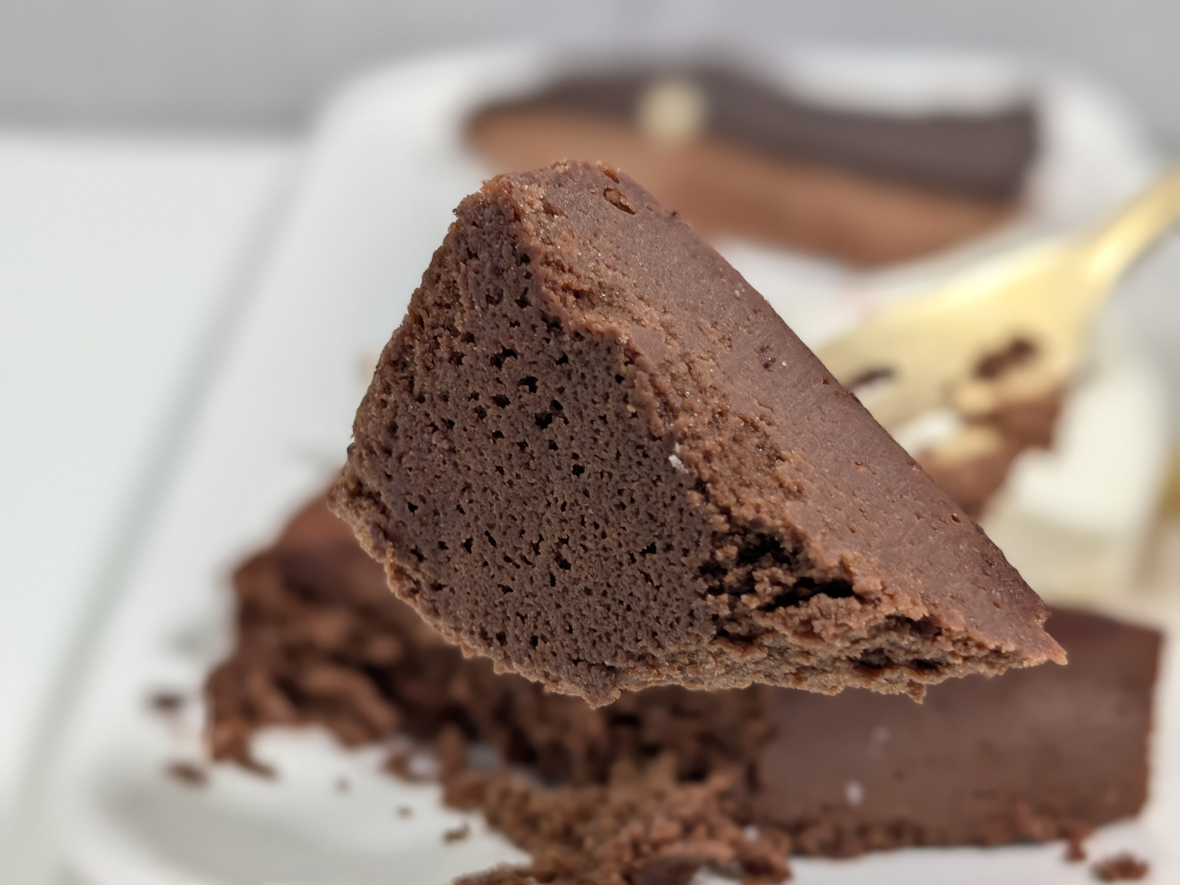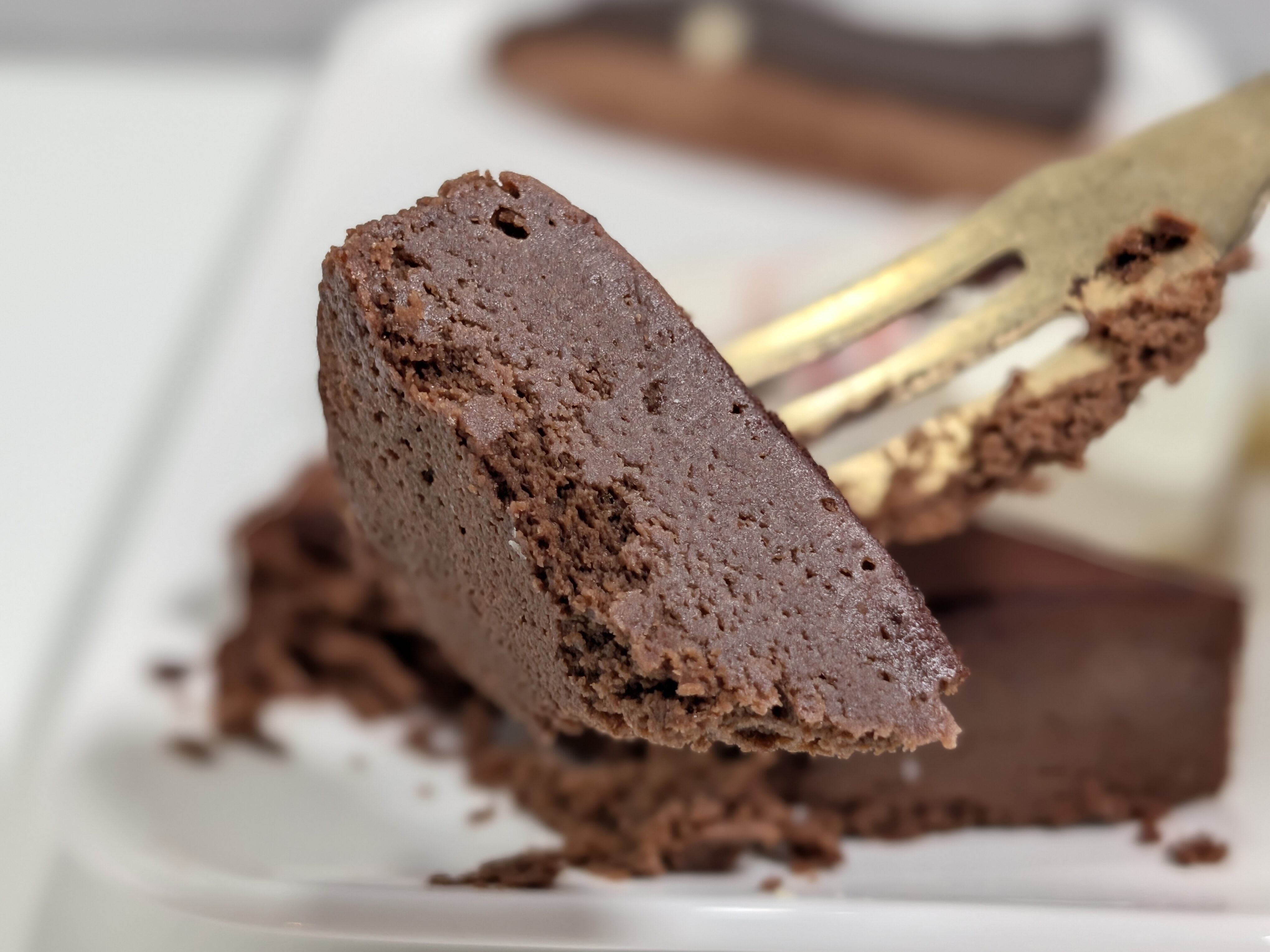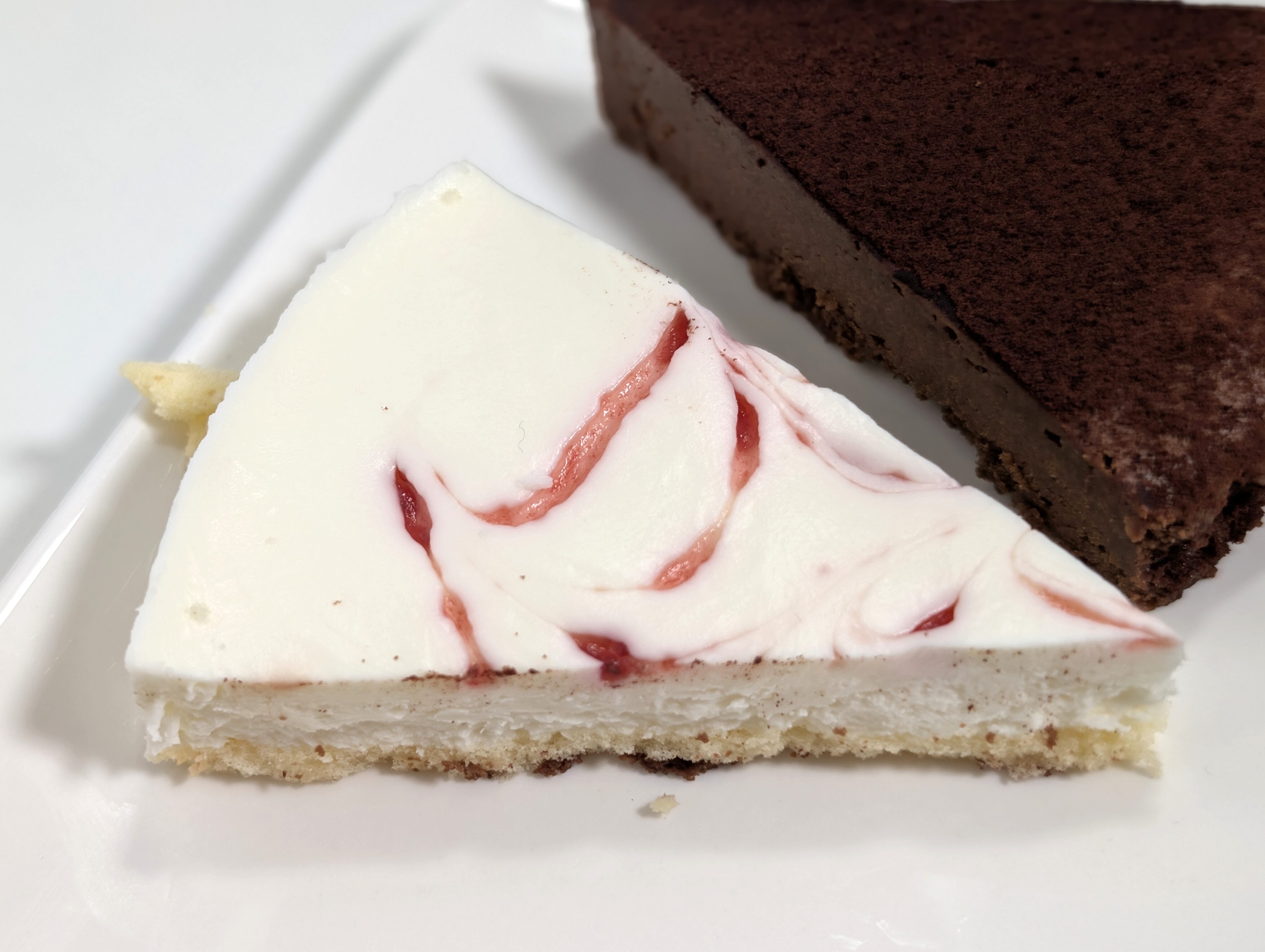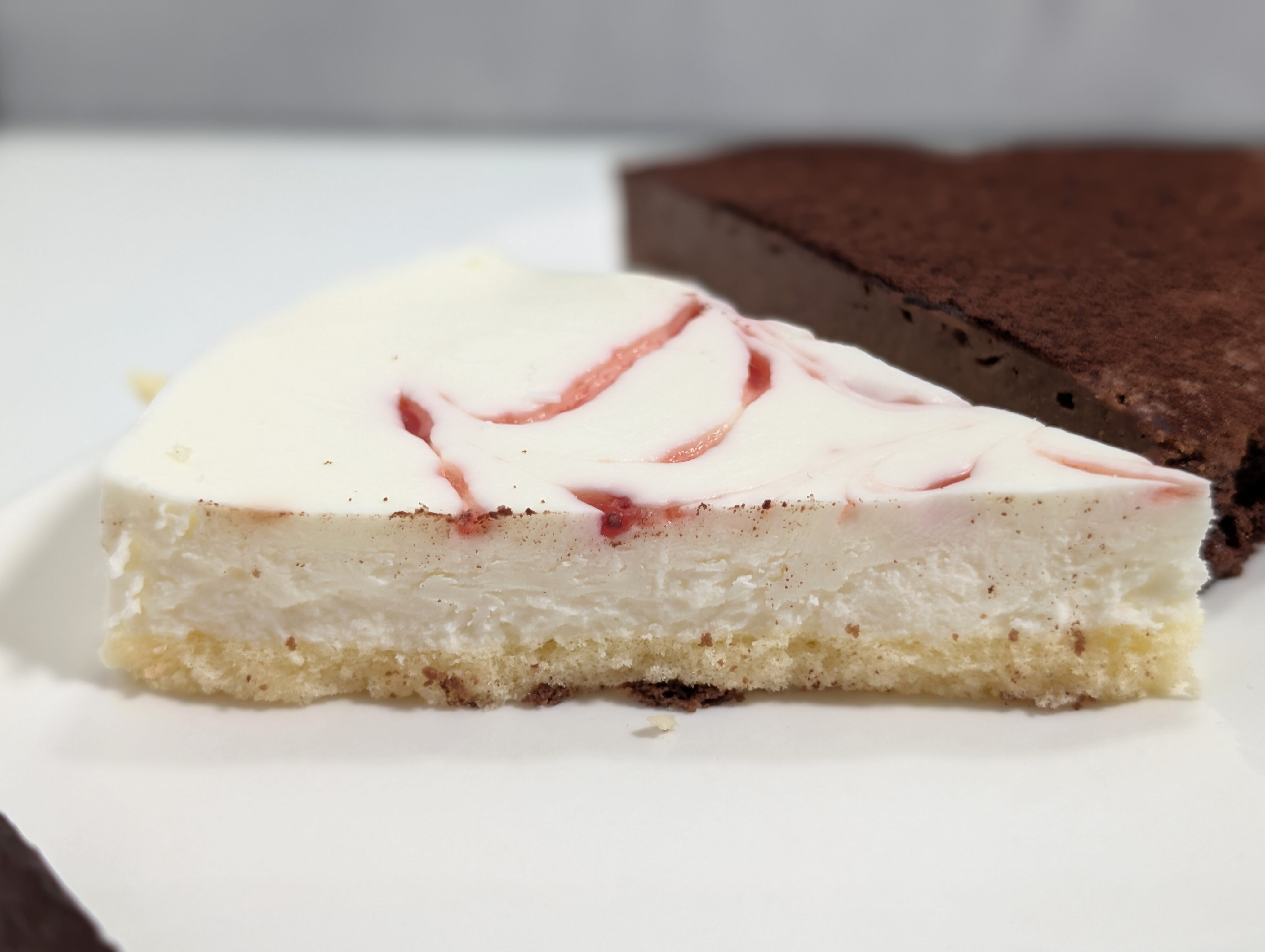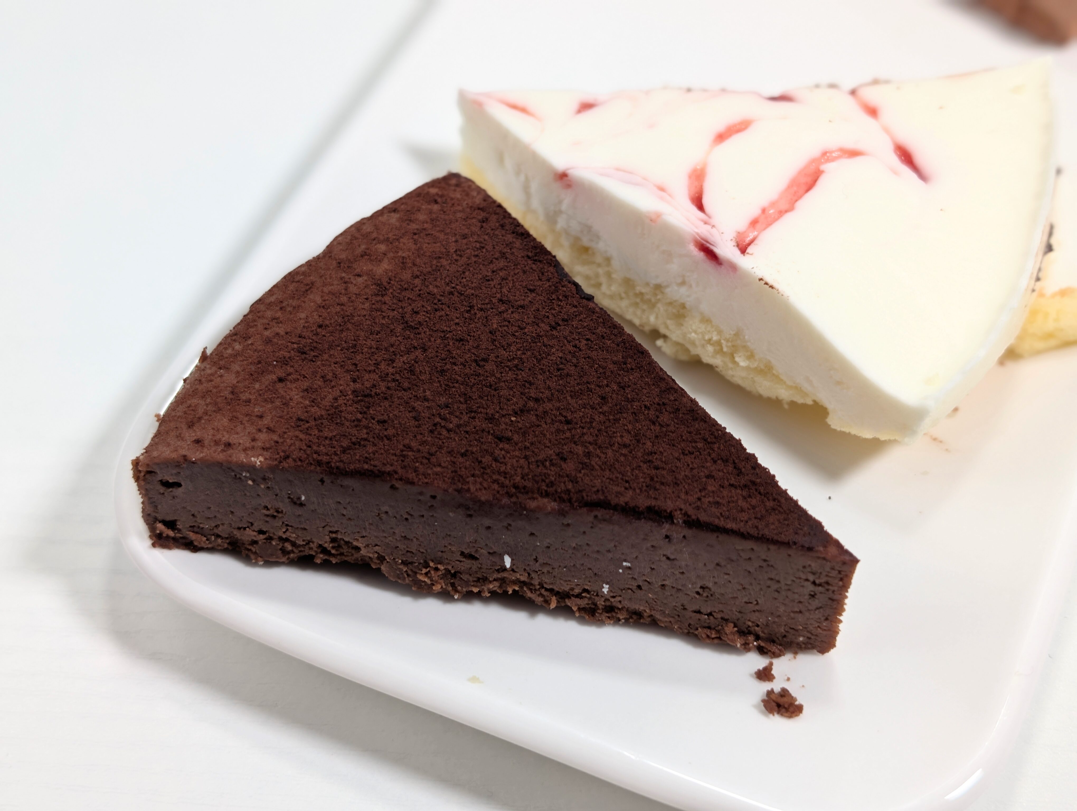 ムースはしっとり、つるっとしたとろける食感で、そこにスポンジのふわふわが加わります。いわゆる口どけを楽しめるほか、ミルキーな風味とチョコのビターな味がいい具合にマッチ。先のチョコケーキに比べると軽めの舌触り、控えめなコクで、全体的に食べやすい味でした。