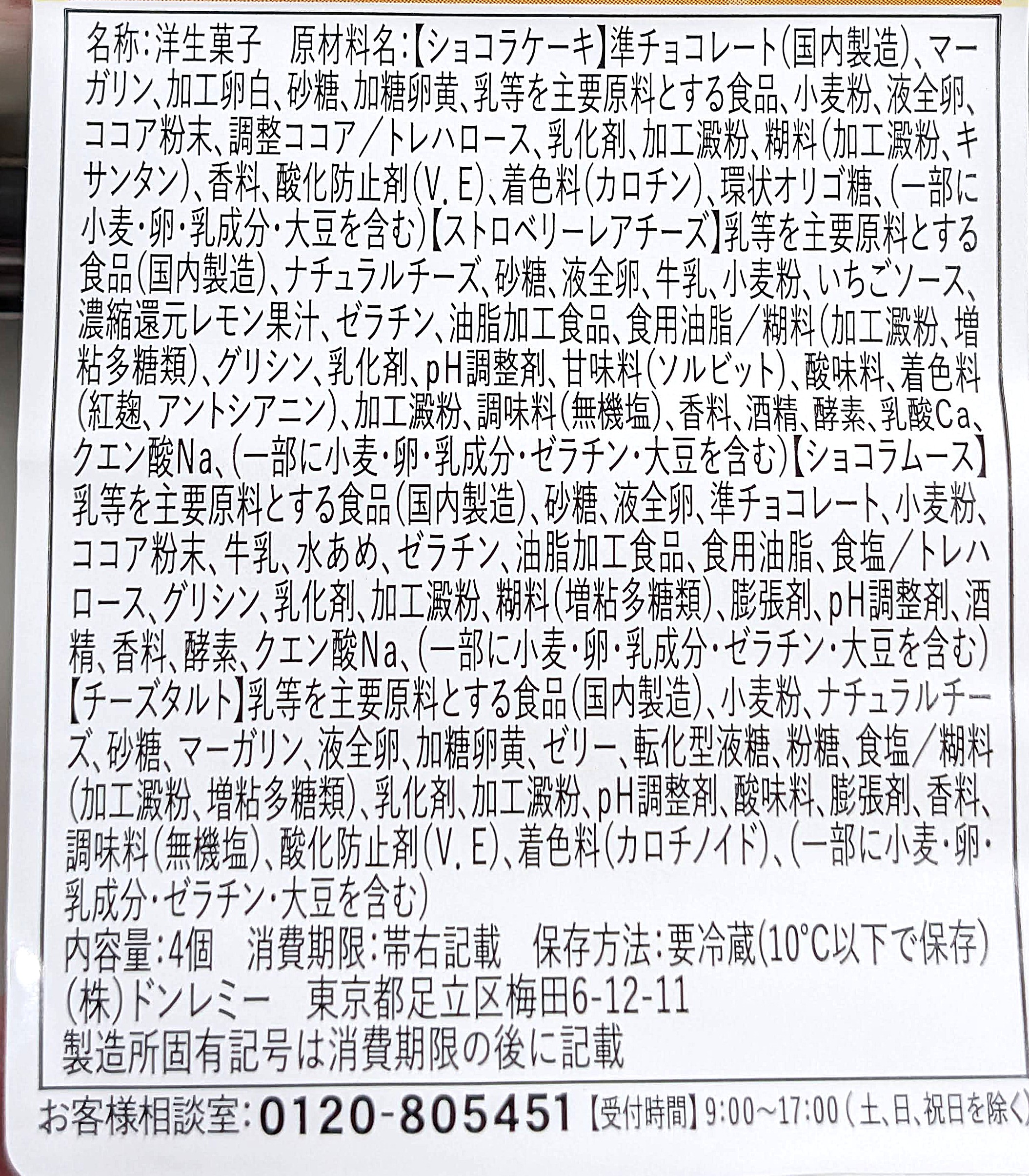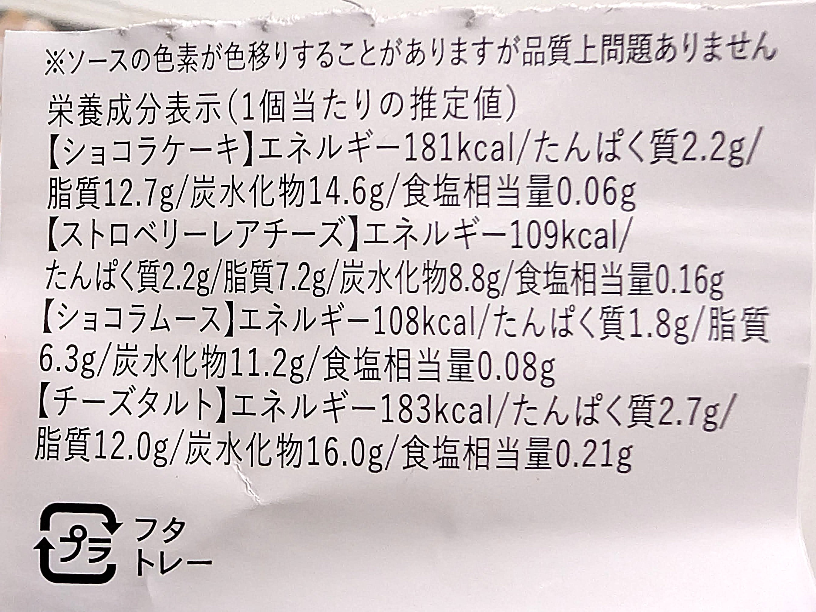 | カロリー | ショコラケーキ 181kcal、ストロベリーレアチーズ 109kcal、ショコラムース 108kcal、チーズタルト 183kcal(合計581kcal) |
