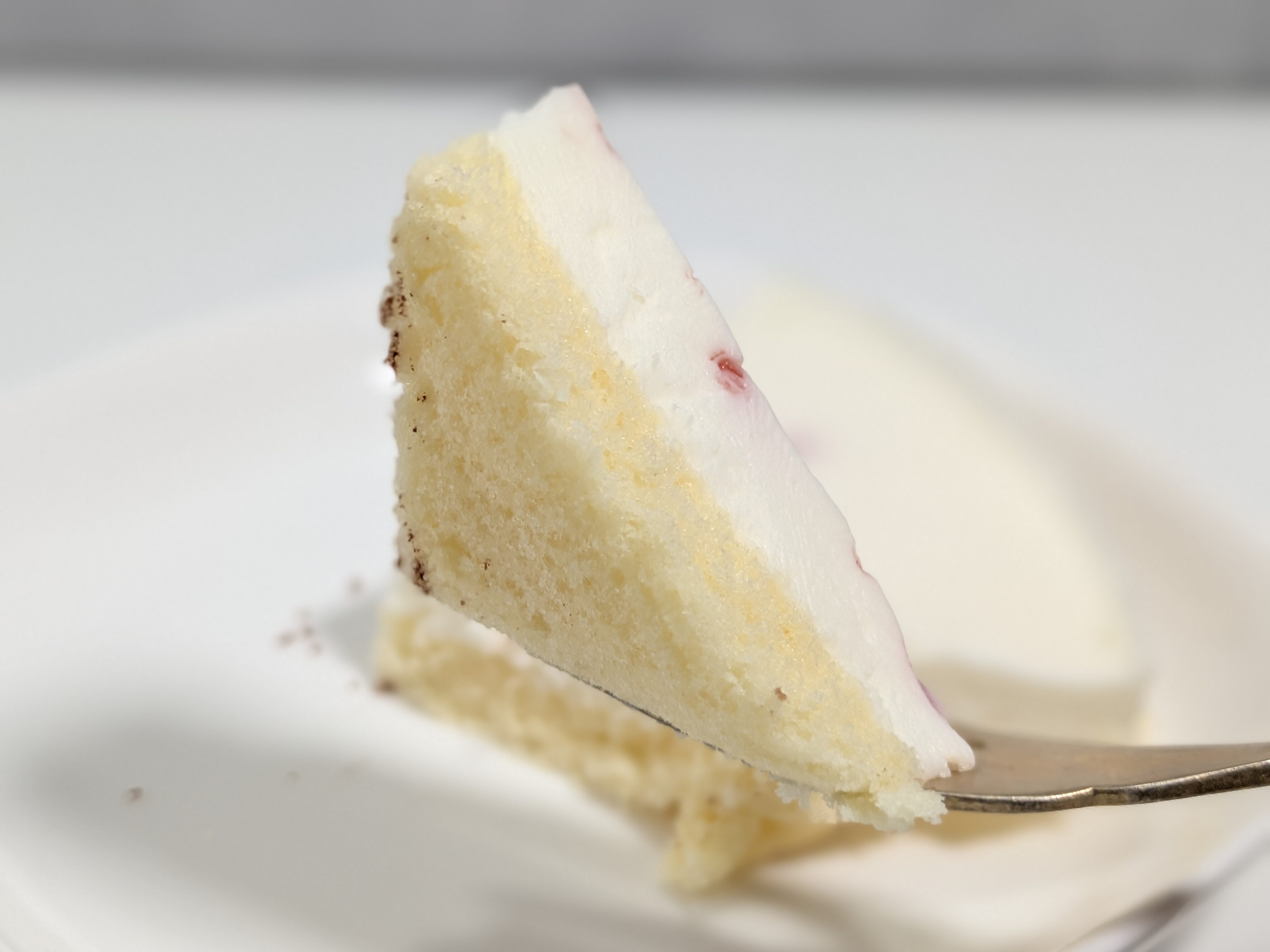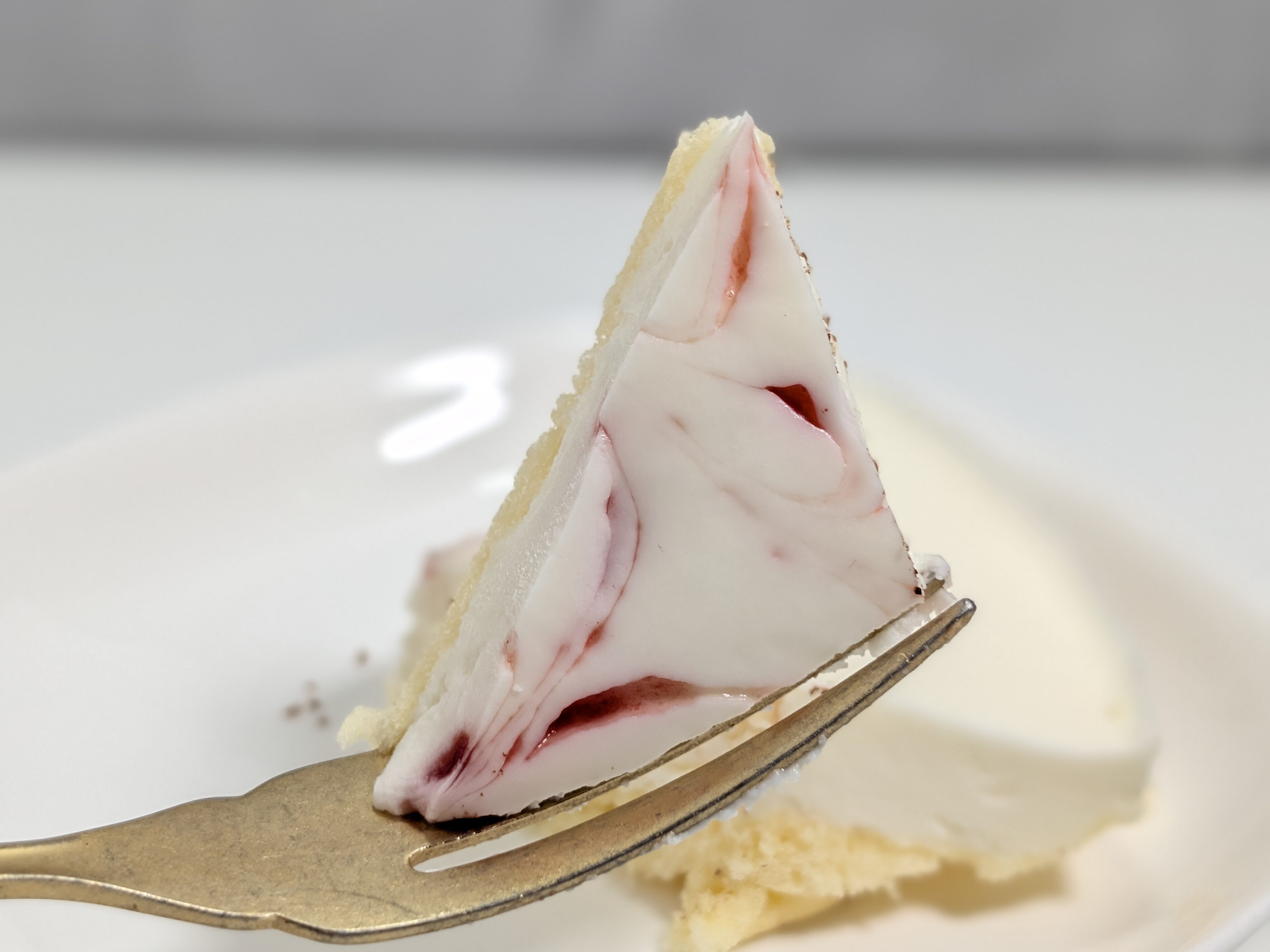 ミルキーな風味とナチュラルチーズのコクがあるほか、スポンジ生地の甘味も加わります。ベリーの主張はそれほど強くはありませんでしたが、そのアクセントが意外とおいしさを決めているような気もします。強い酸味やクセのあるチーズの風味がない、とても食べやすい味のレアチーズケーキでした。