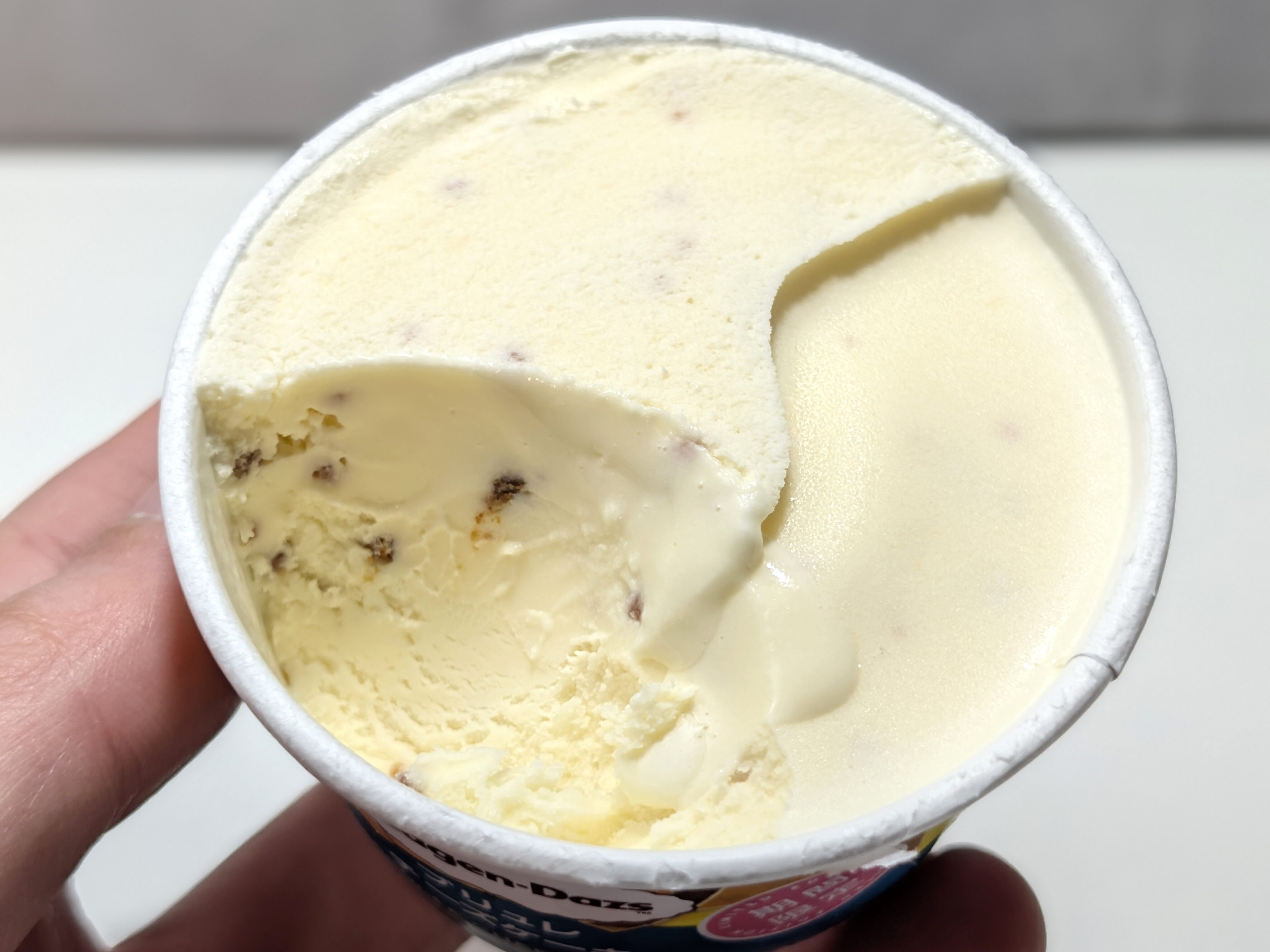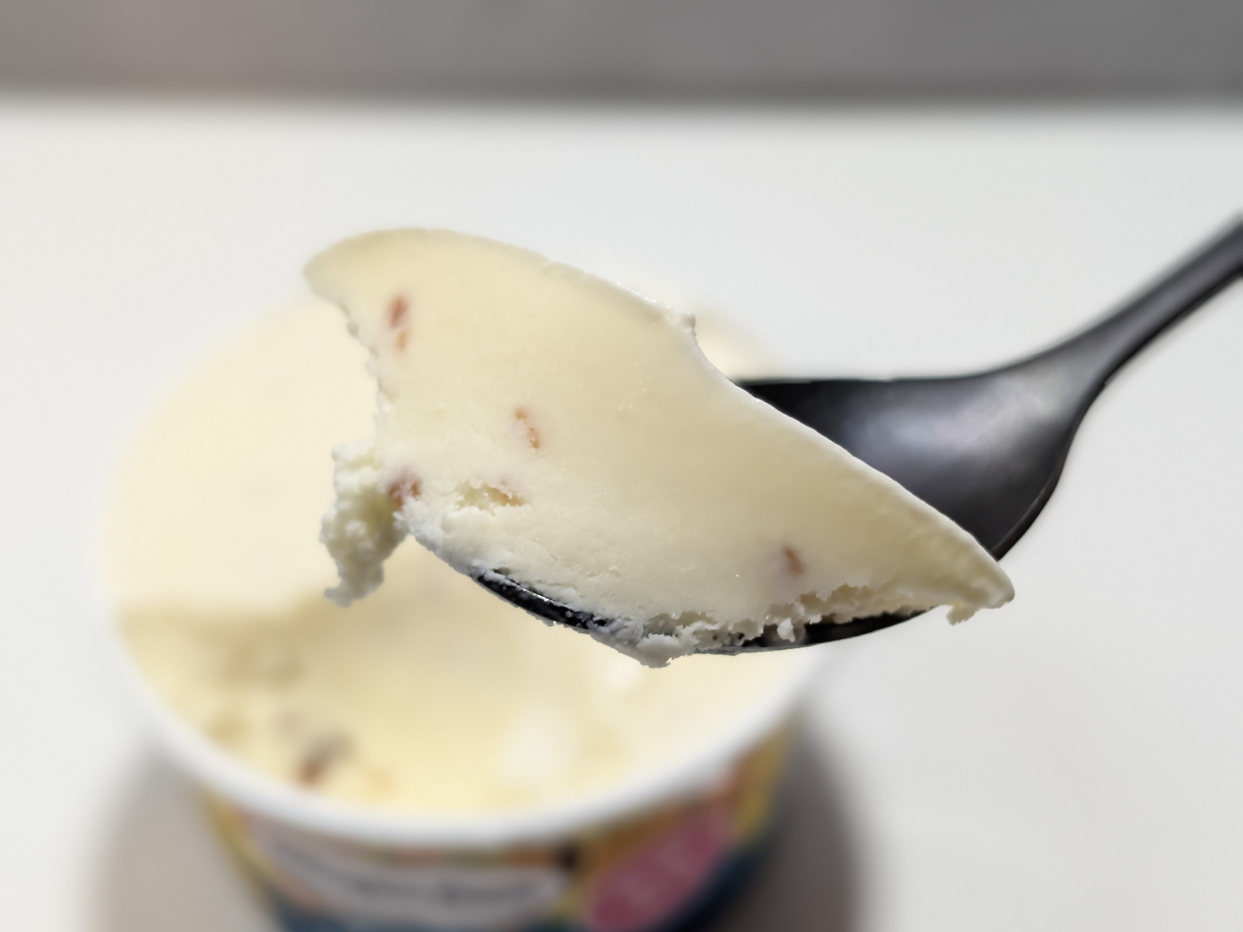 口にいれてみて感じるのは、リッチなアイスに特有の、口の温度でしっとりとろけるような食感に加えて、カラメルチップのザクザクした食感のアクセントを楽しめます。