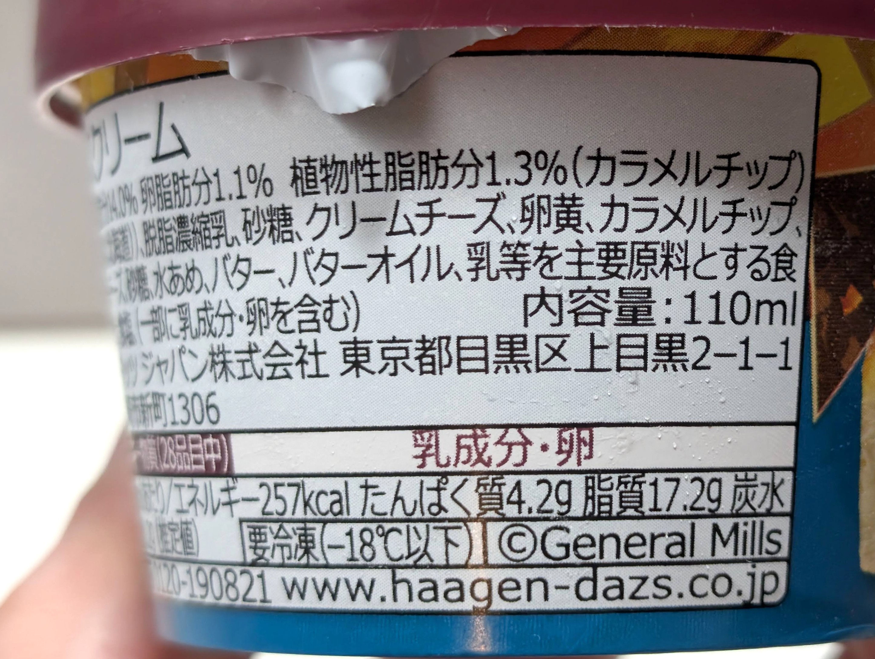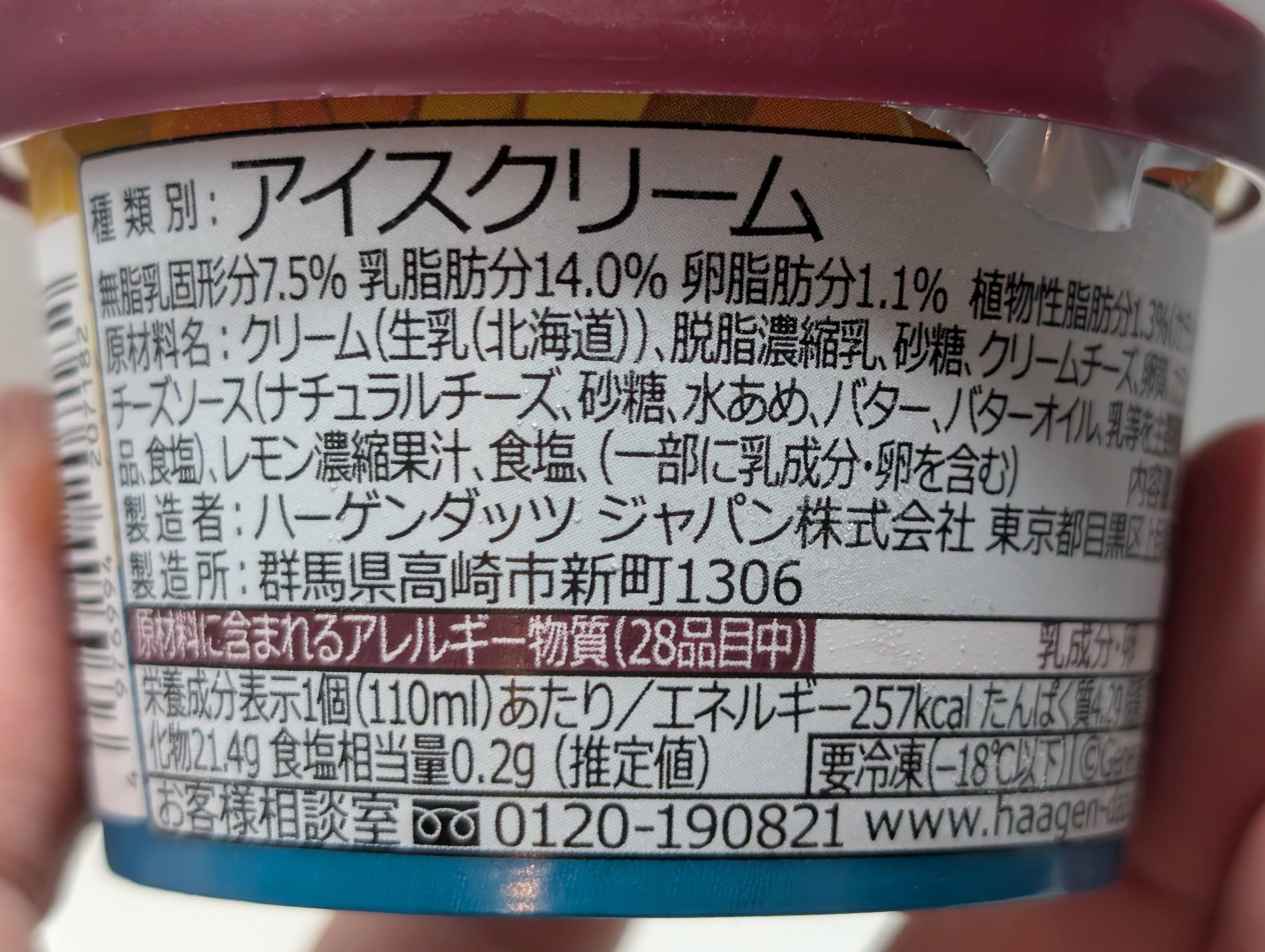 | 原材料名 | クリーム(生乳(北海道))、脱脂濃縮乳、砂糖、クリームチーズ、卵黄、カラメルチップ、チーズソース(ナチュラルチーズ、砂糖、水あめ、バター、バターオイル、乳等を主要原料とする食品、食塩)、レモン濃縮果汁、食塩、(一部に乳成分・卵を含む) |