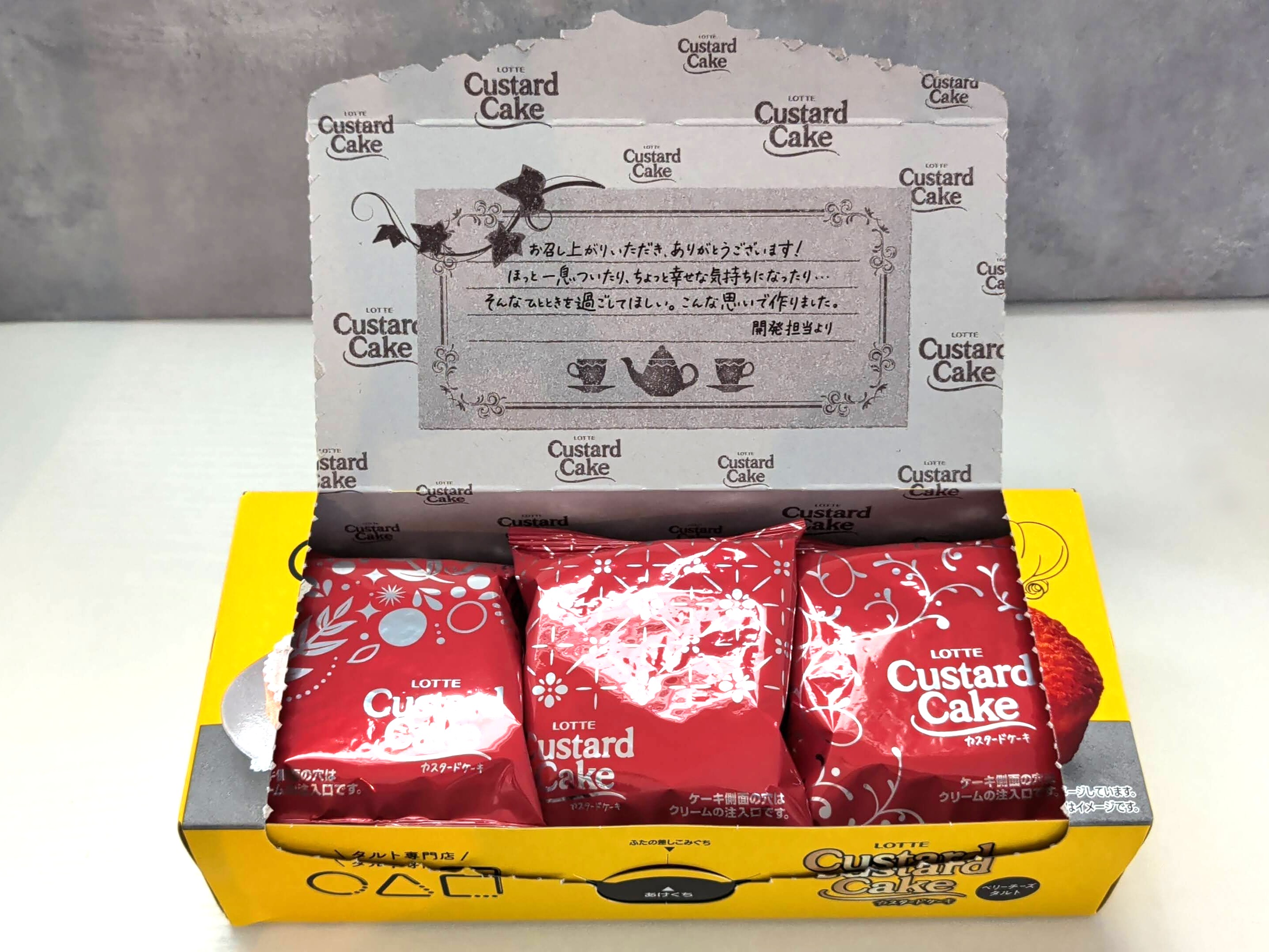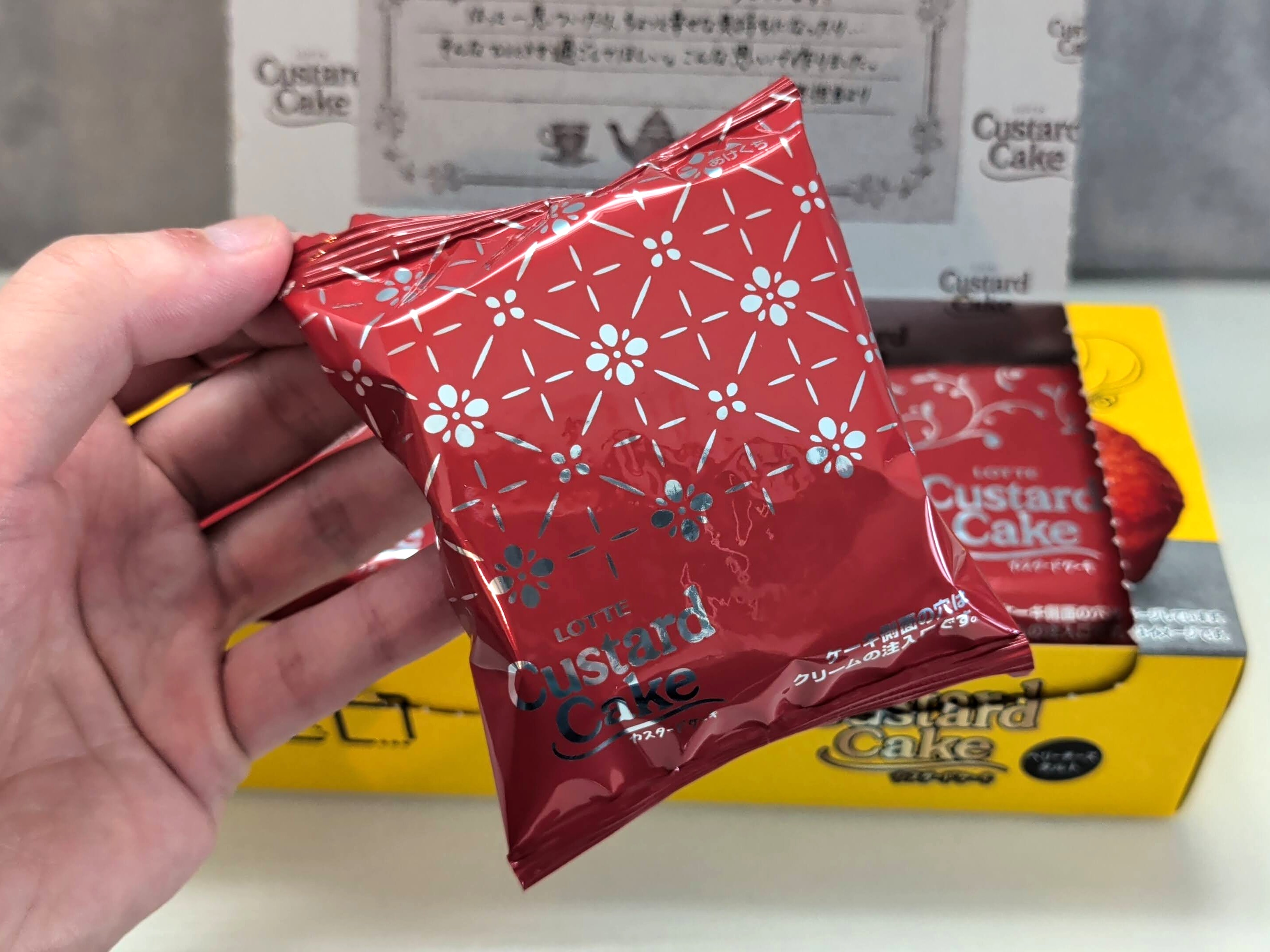 ロッテのカスタードケーキは、チョコパイと同程度のサイズで、冒頭で紹介したとおり、スポンジケーキにクリームを入れたお菓子です。1986年の、昭和から発売されているロングセラー商品でもあります。
