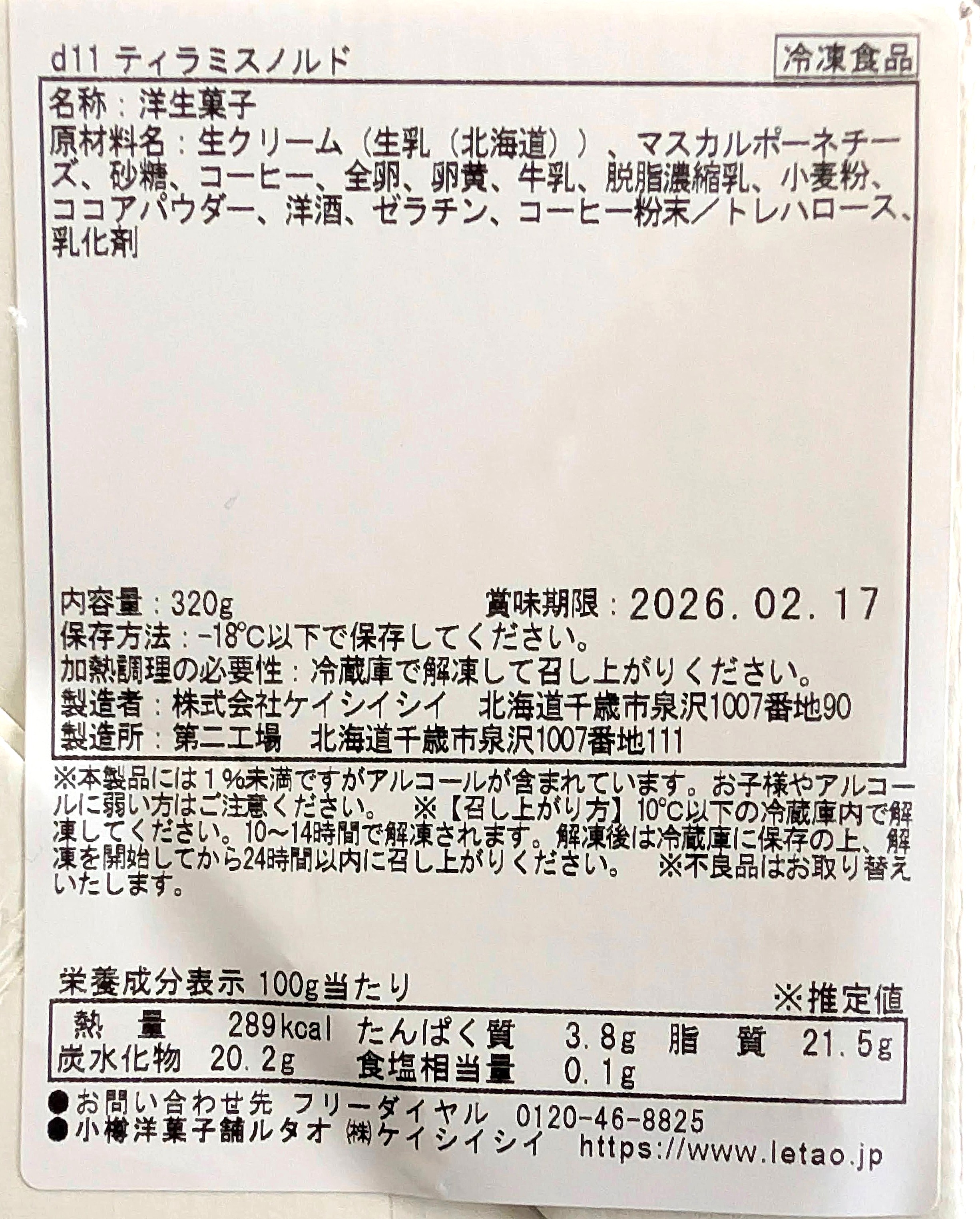| 原材料名 | 生クリーム(生乳(北海道))、クリームチーズ、砂糖、全卵、マスカルポーネチーズ、卵黄、小麦粉、ゼラチン、粉糖/トレハロース、安定剤(ローカストビーンガム)、乳化剤(大豆由来) |