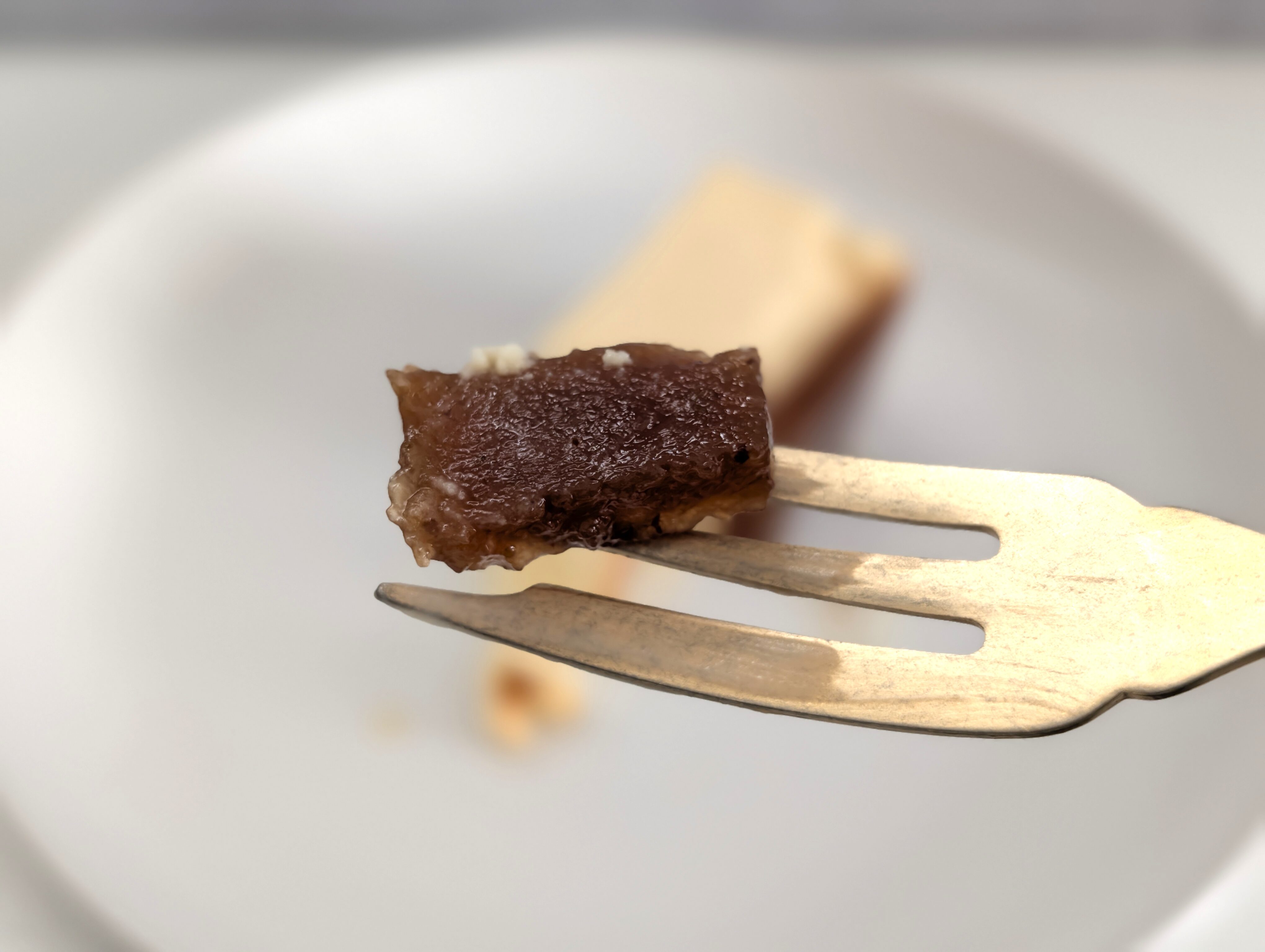 フォークを入れる瞬間は少し力が必要なくらい、中身が詰まったねっとりと弾力のある質感なのですが、口に運ぶとすっととけていきます。イメージどおりのチーズテリーヌの質感です。ジュレはツルッとしていますが、滑らかなテリーヌとしっかり一体になっています。