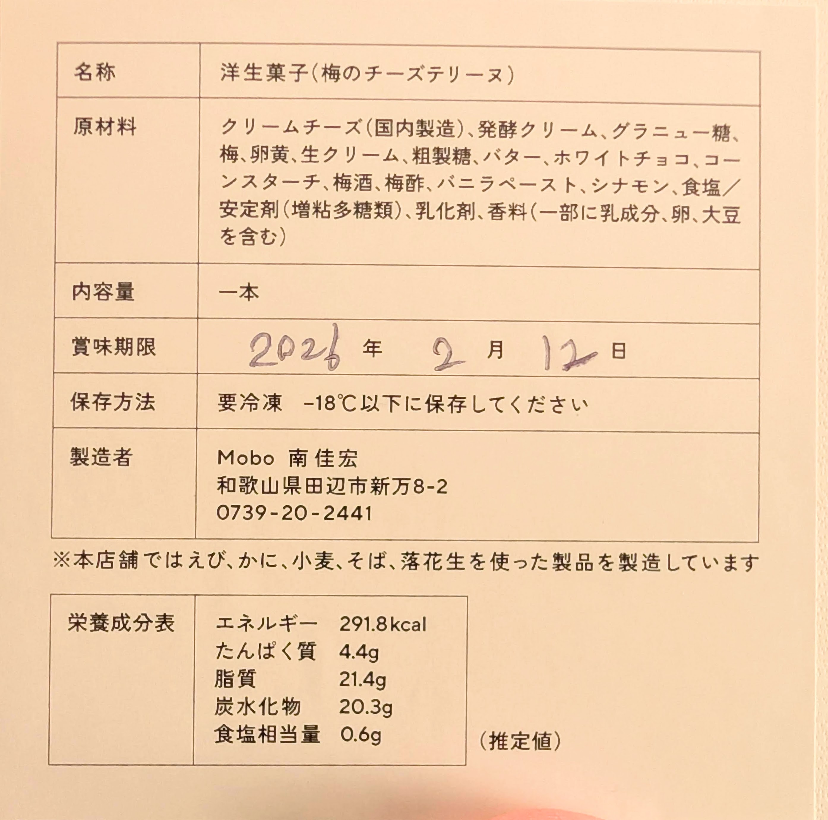 | 原材料名 | クリームチーズ(国内製造)、発酵クリーム、グラニュー糖、梅、卵黄、生クリーム、粗製糖、バター、ホワイトチョコ、コーンスターチ、梅酒、梅酢、バニラペースト、シナモン、食塩/安定剤(増粘多糖類)、乳化剤、香料(一部に乳成分、卵、大豆を含む) |