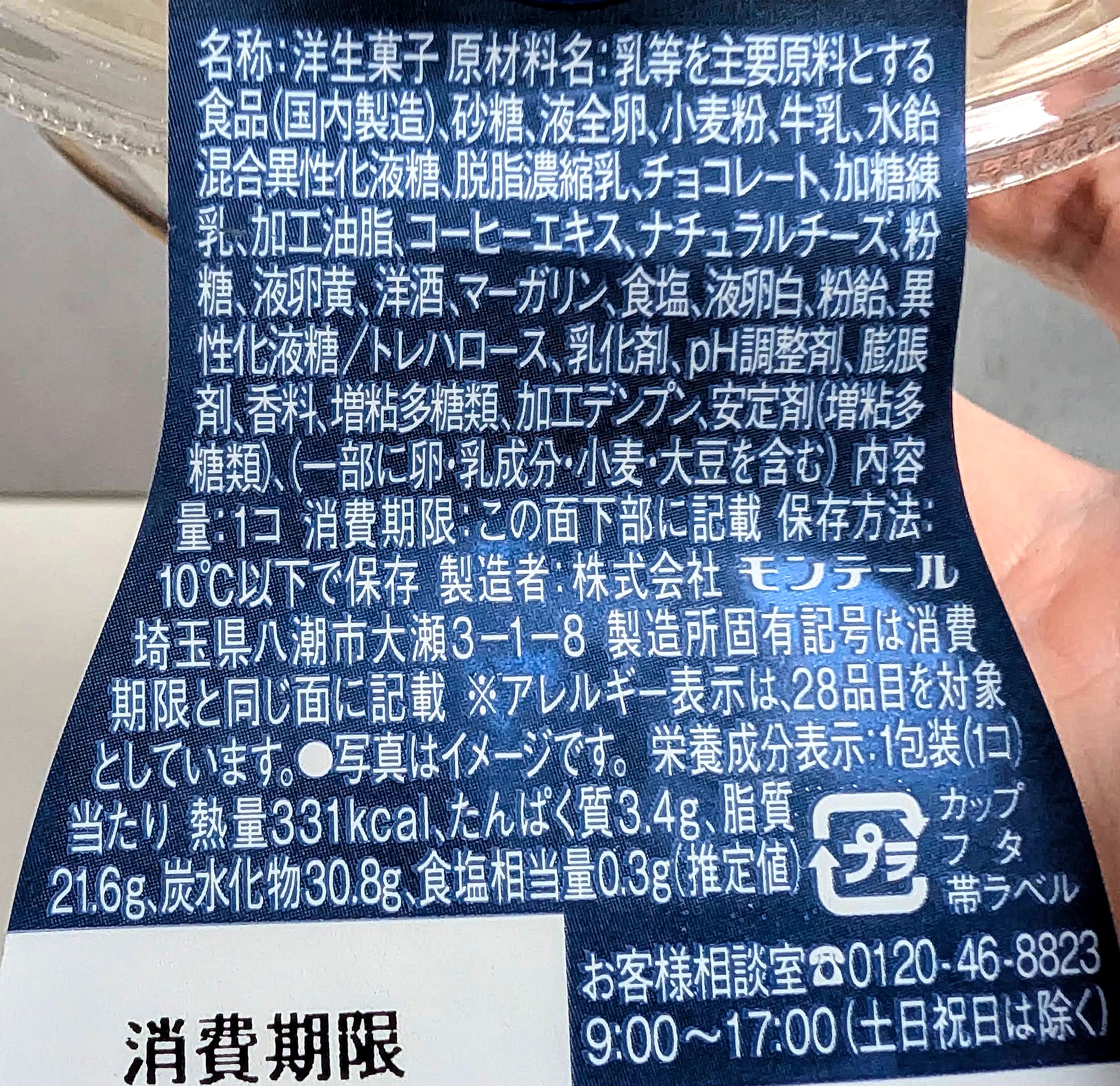 原材料名乳等を主要原料とする食品(国内製造)、砂糖、液全卵、小麦粉、牛乳、水飴混合異性化液糖、脱脂濃縮乳、チョコレート、加糖練乳、加工油脂、コーヒーエキス、ナチュラルチーズ、粉糖、液卵黄、洋酒、マーガリン、食塩、液卵白、粉飴、異性化液糖/トレハロース、乳化剤、pH調整剤、膨脹剤、香料、増粘多糖類、加工デンプン、安定剤(増粘多糖類)、(一部に卵・乳成分・小麦・大豆を含む)