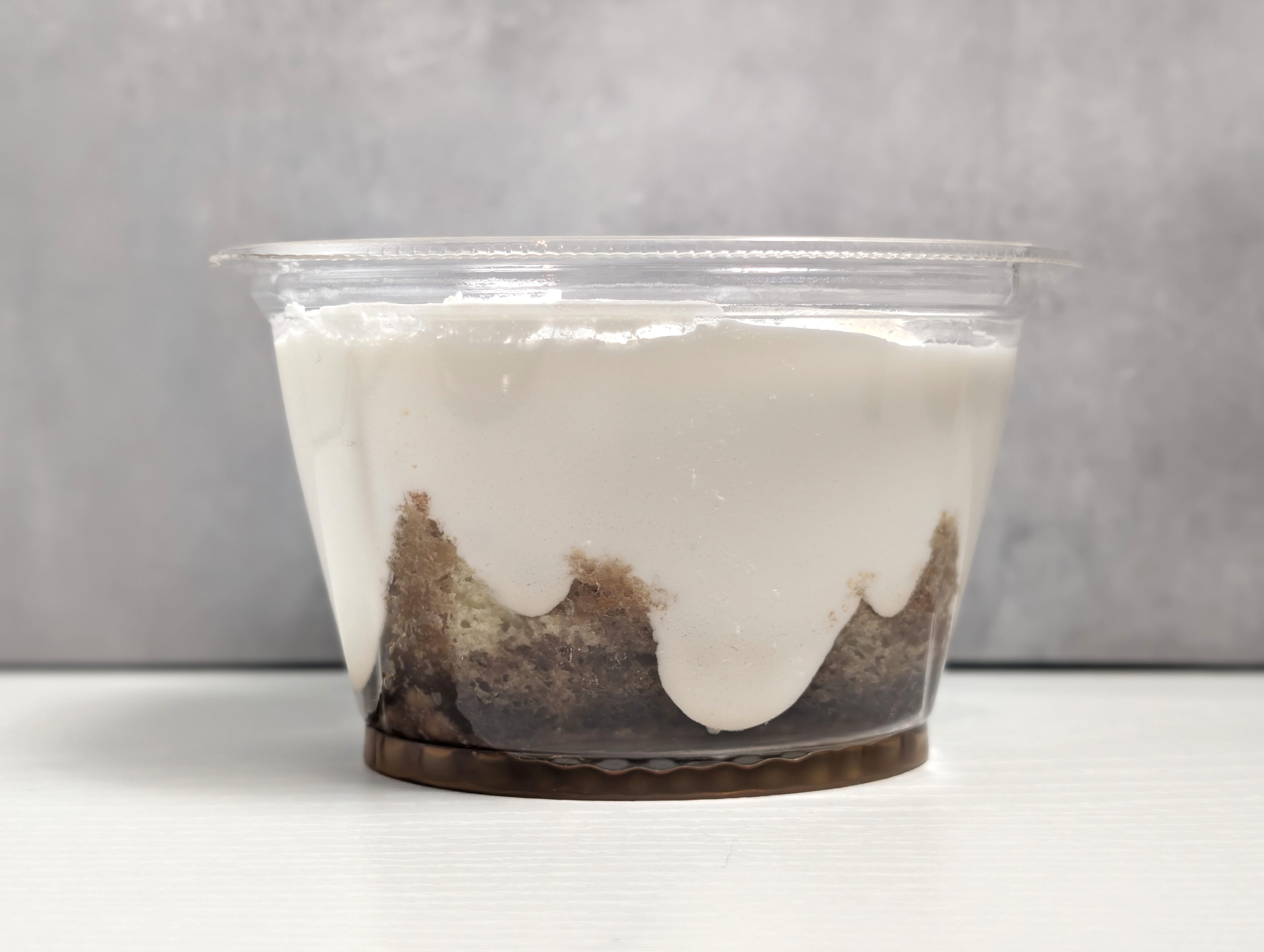 通常のティラミスでは、クリーム色(やや黄色)のティラミスクリームを使うことがありますが、本商品はそれがなく、クリーム全体が白で構成されています。