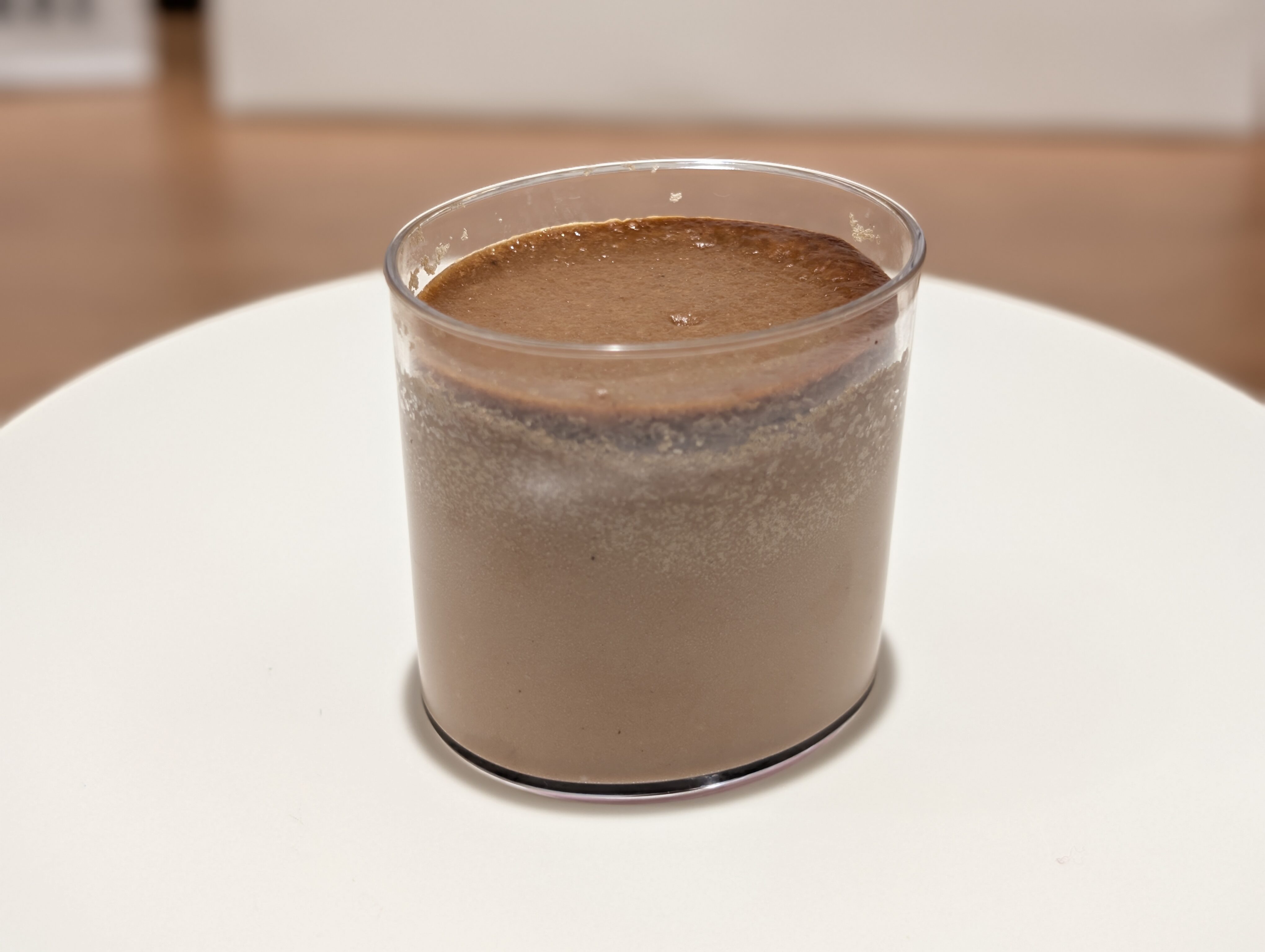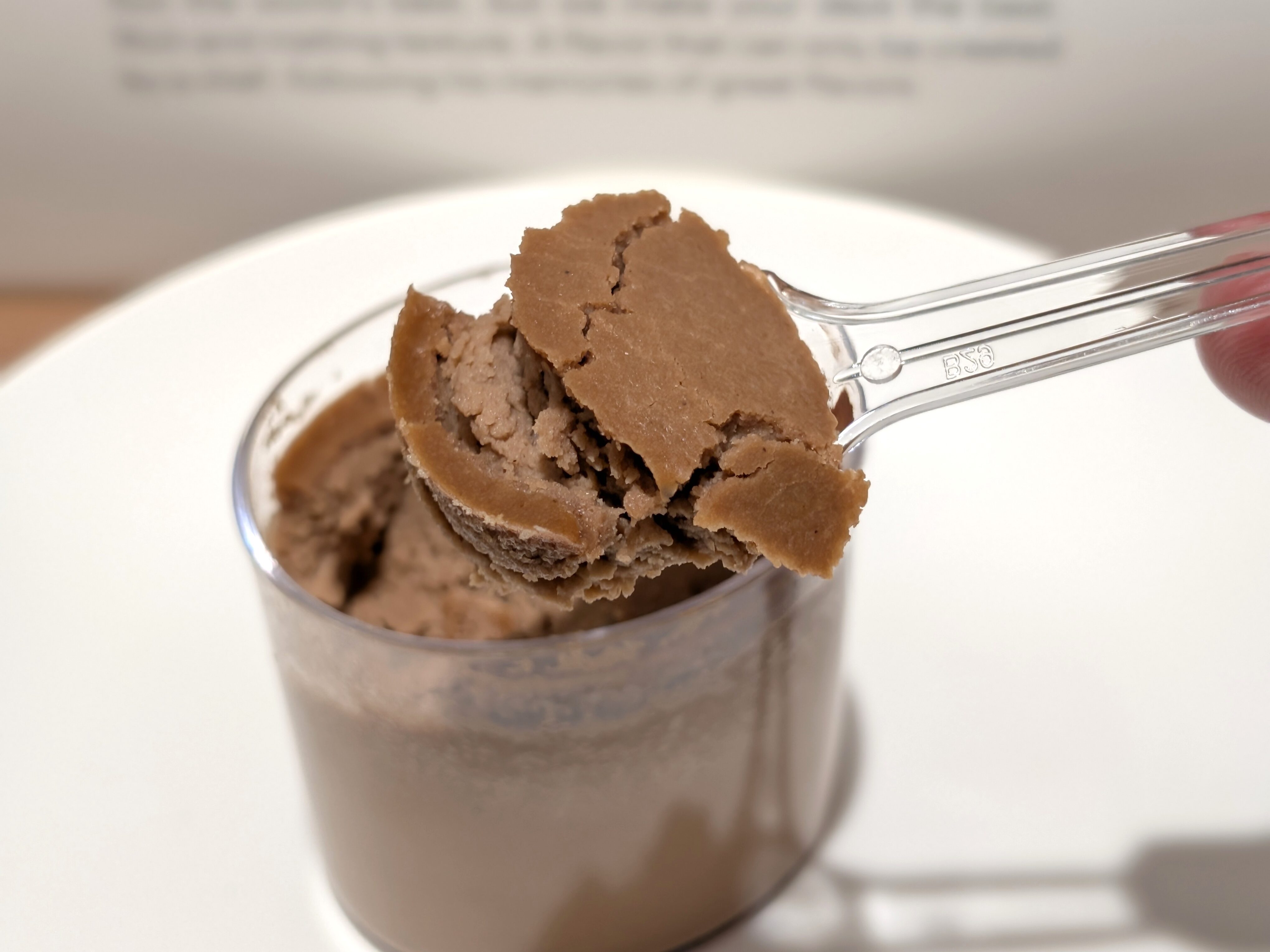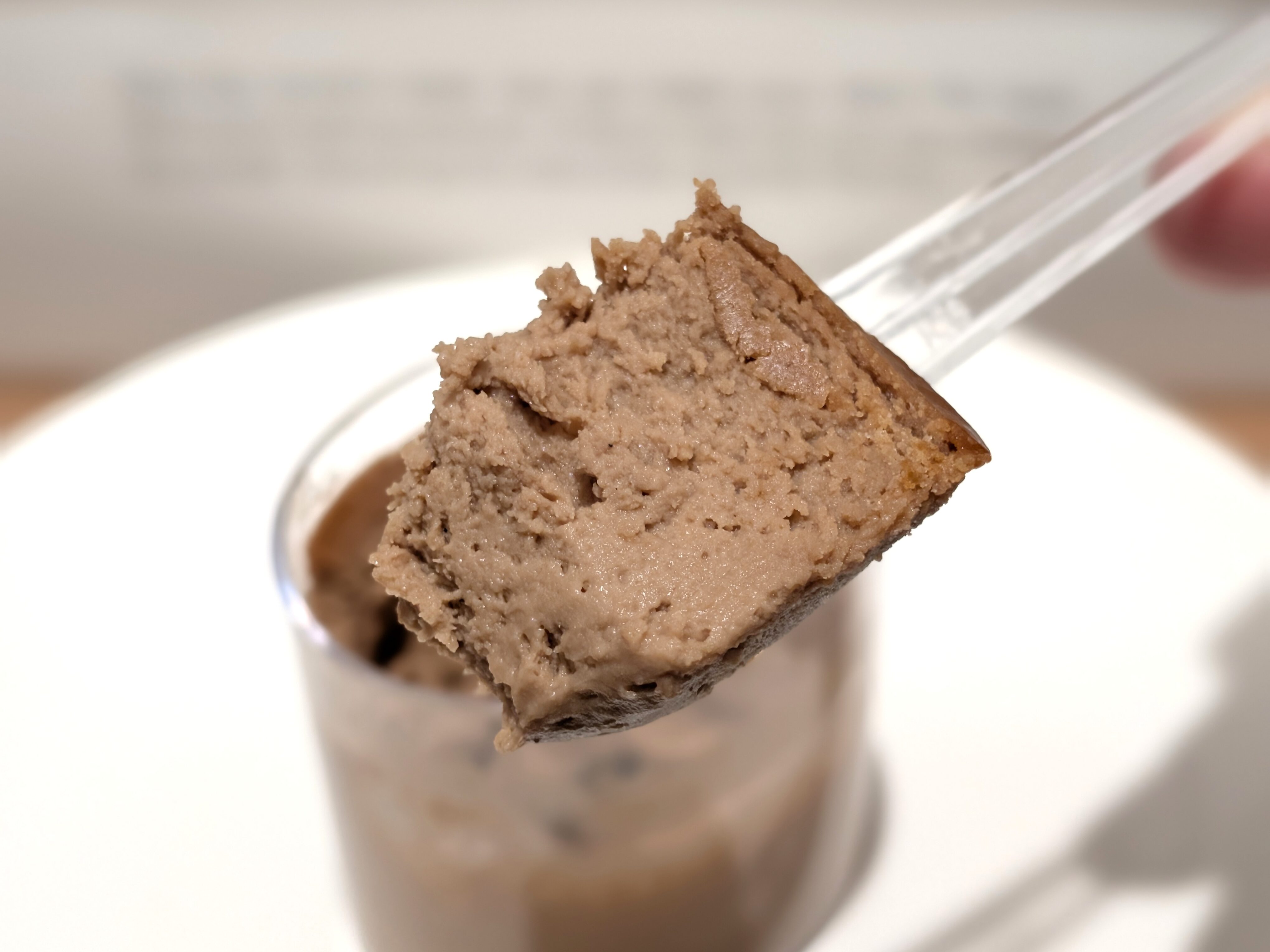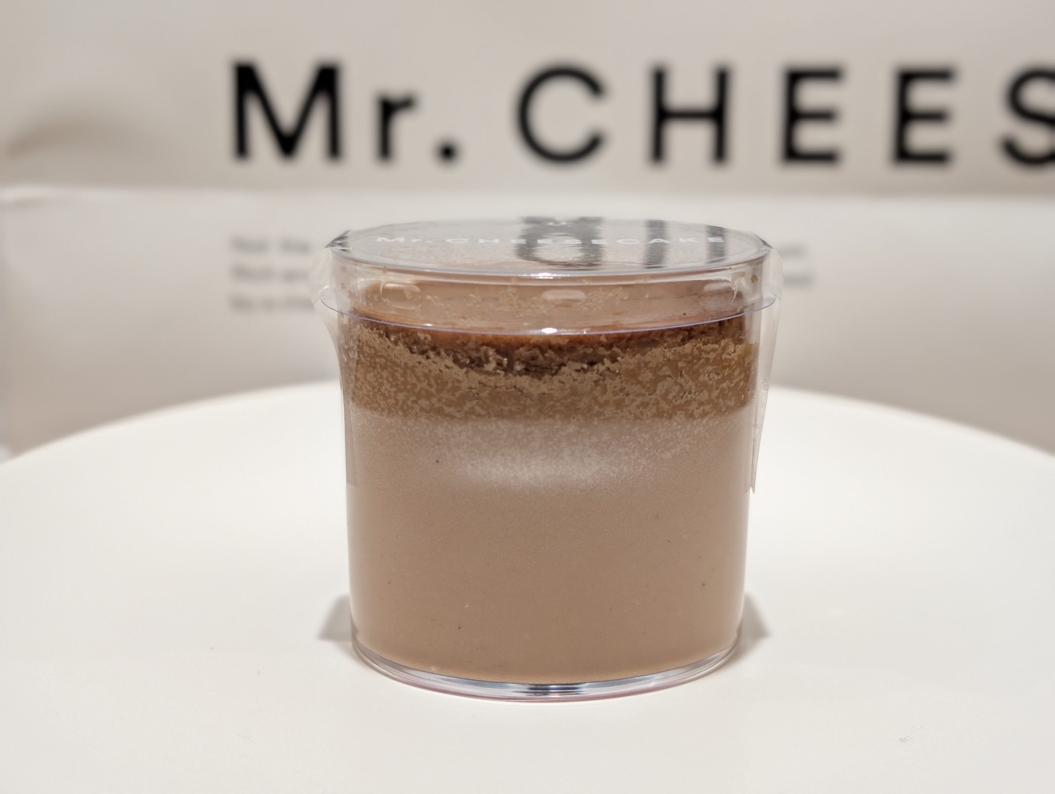 チーズケーキはカップタイプです。カフェモカというフレーバーなので、チョコレートっぽい色をしています。全体的にはシンプルにみえますが、製法にこだわっています。