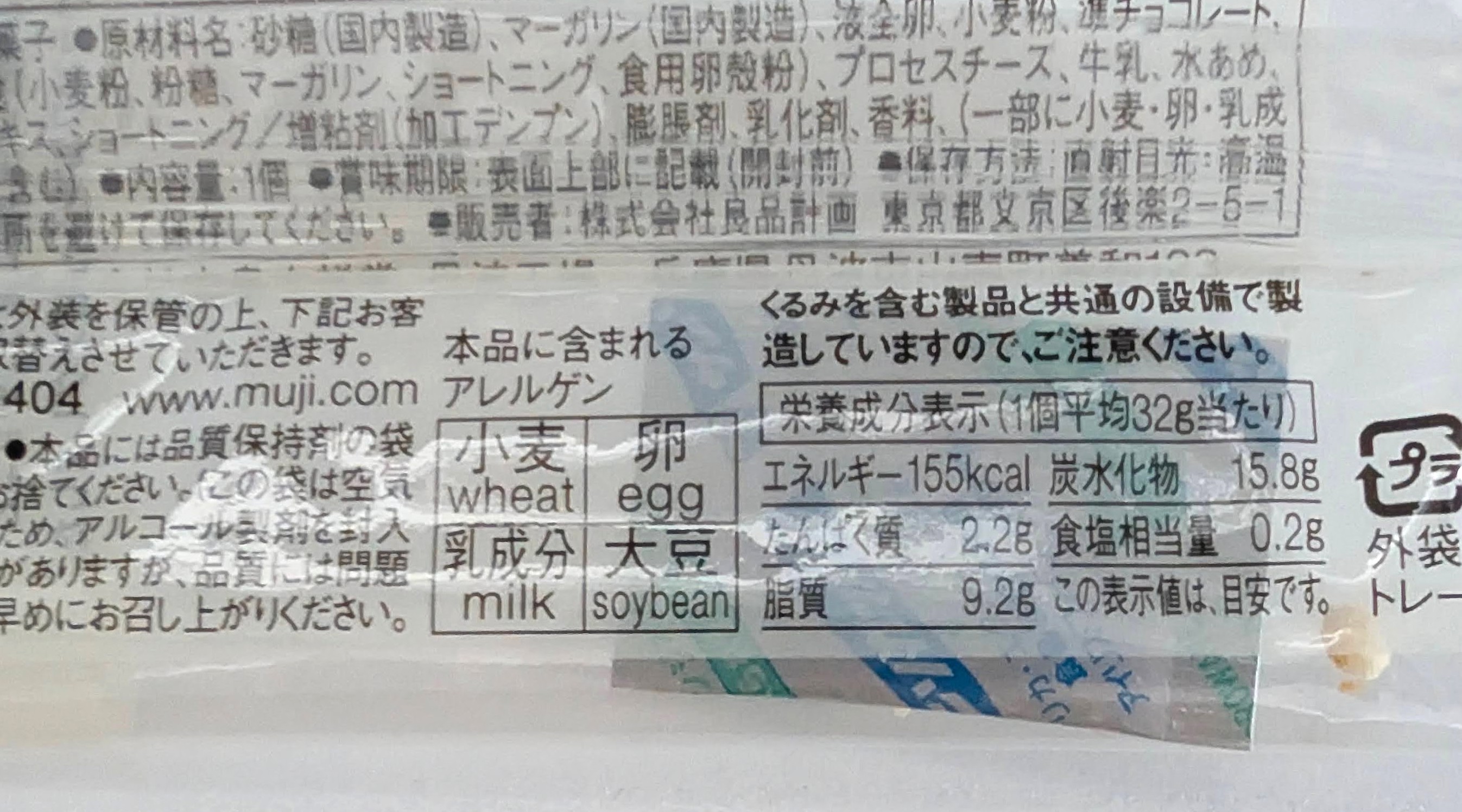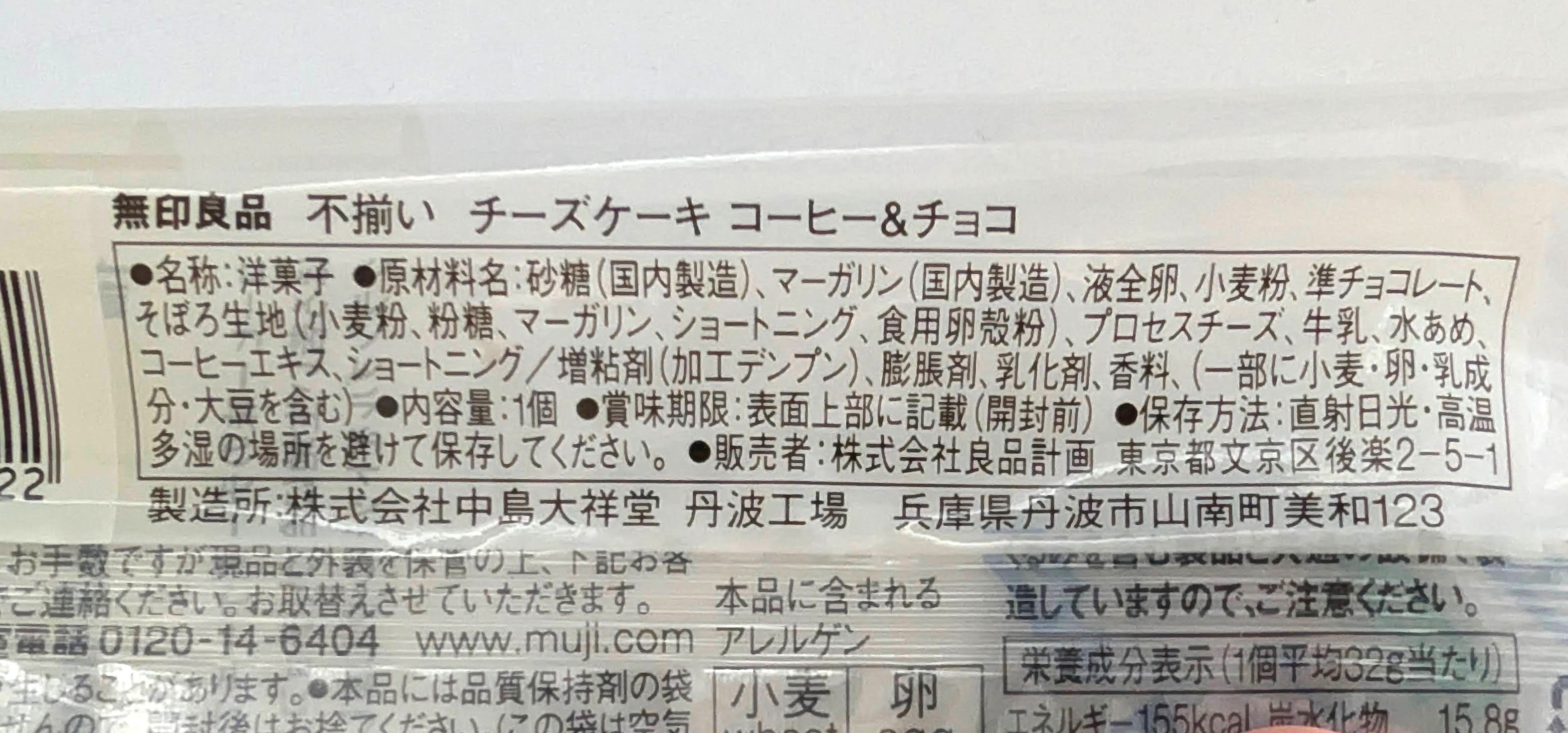 原材料名砂糖(国内製造)、マーガリン(国内製造)、液全卵、小麦粉、準チョコレート、そぼろ生地(小麦粉、粉糖、マーガリン、ショートニング、食用卵殻粉)、プロセスチーズ、牛乳、水あめ、コーヒーエキス、ショートニング/増粘剤(加工デンプン)、膨脹剤、乳化剤、香料、(一部に小麦・卵・乳成分・大豆を含む)