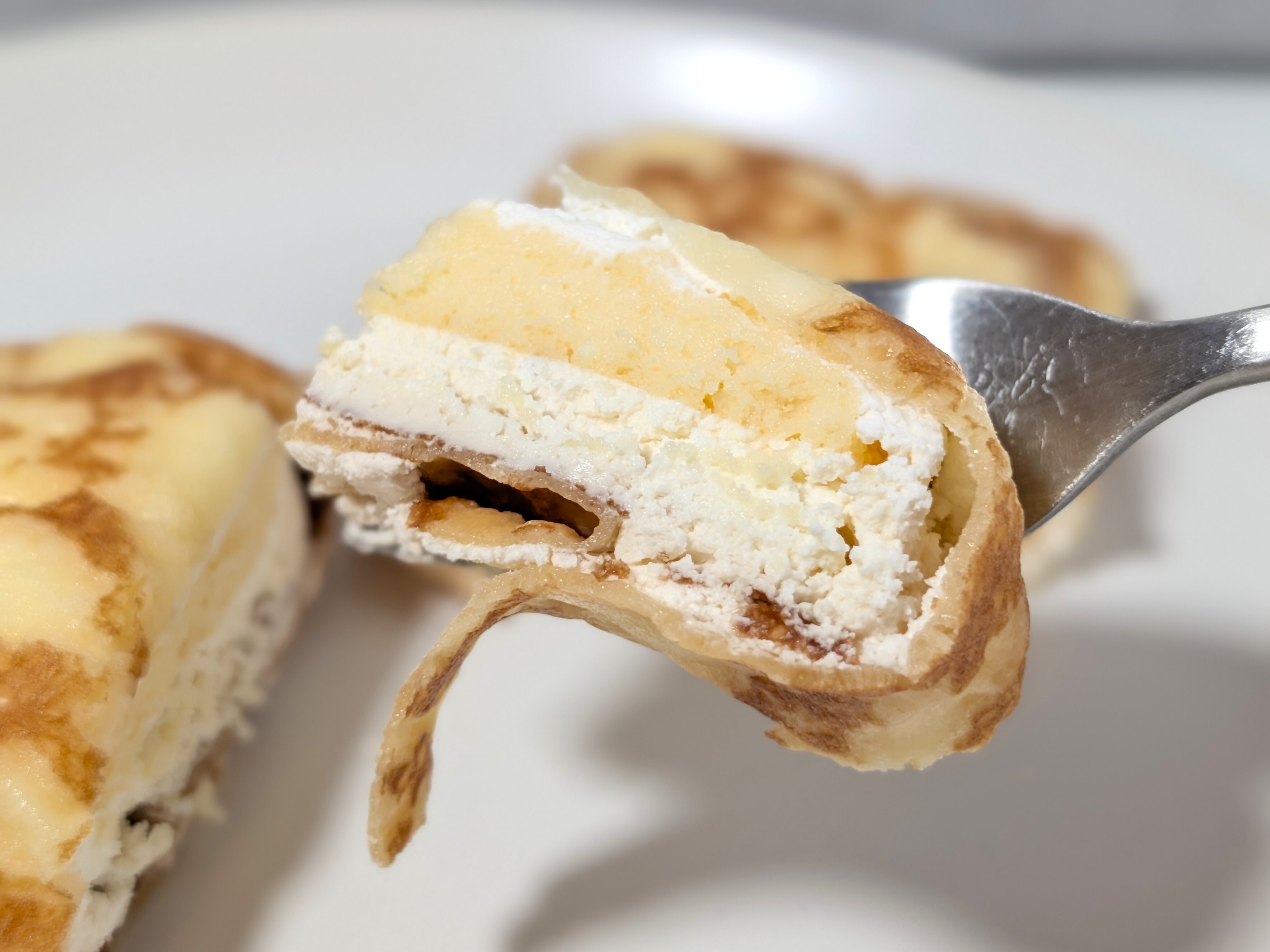 クレープ生地にはそれほど厚みはないのですが、しっかりもちもちした食感を楽しめます。ホイップクリームのふわふわしており、チーズケーキはねっとり、そしてチーズクリームのしっとりしています。