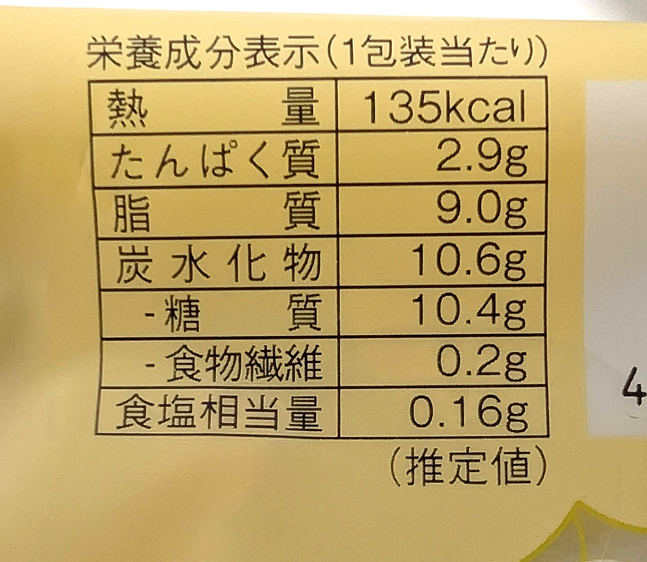 | 栄養成分表示 (1包装当たり、推定値) | 熱量 135kcal、たんぱく質 2.9g、脂質 9.0g、炭水化物 10.6g(糖質 10.4g、食物繊維 0.2g)、食塩相当量 0.16g |