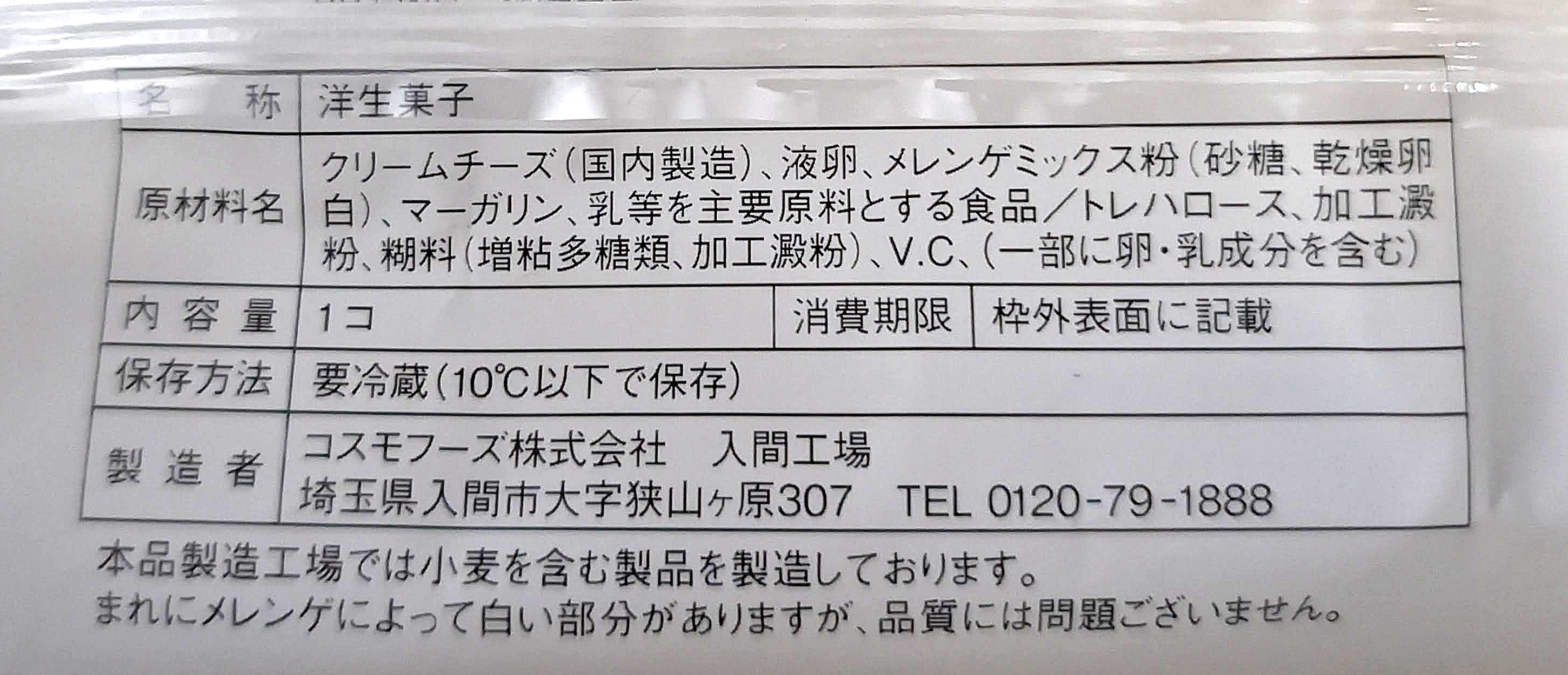 | 原材料名 | クリームチーズ(国内製造)、液卵、メレンゲミックス粉(砂糖、乾燥卵白)、マーガリン、乳等を主要原料とする食品/トレハロース、加工澱粉、糊料(増粘多糖類、加工澱粉)、V.C.、(一部に卵・乳成分を含む) |