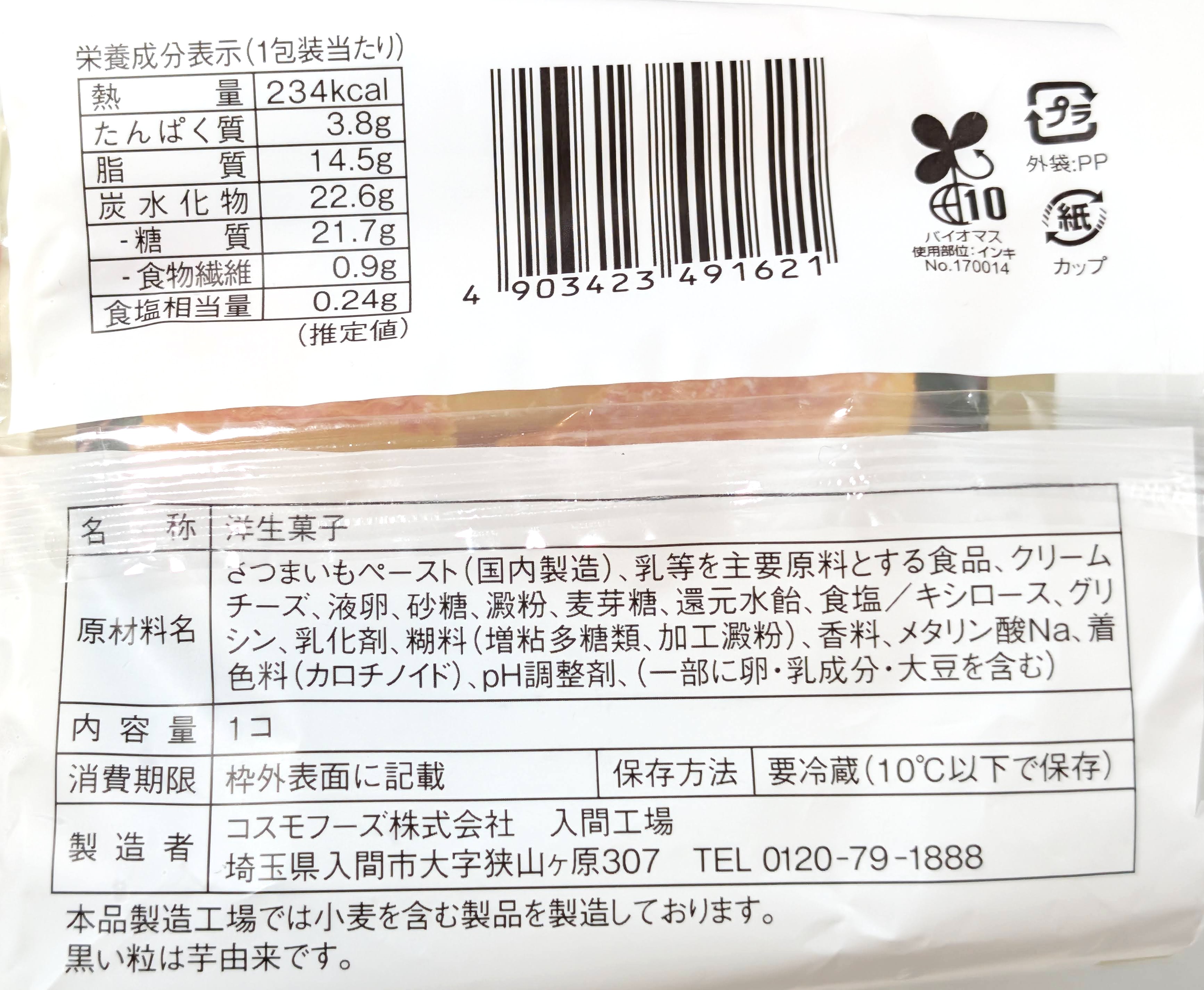 | 原材料名 | さつまいもペースト(国内製造)、乳等を主要原料とする食品、クリームチーズ、液卵、砂糖、澱粉、麦芽糖、還元水飴、食塩/キシロース、グリシン、乳化剤、糊料(増粘多糖類、加工澱粉)、香料、メタリン酸Na、着色料(カロチノイド)、pH調整剤、(一部に卵・乳成分・大豆を含む) |