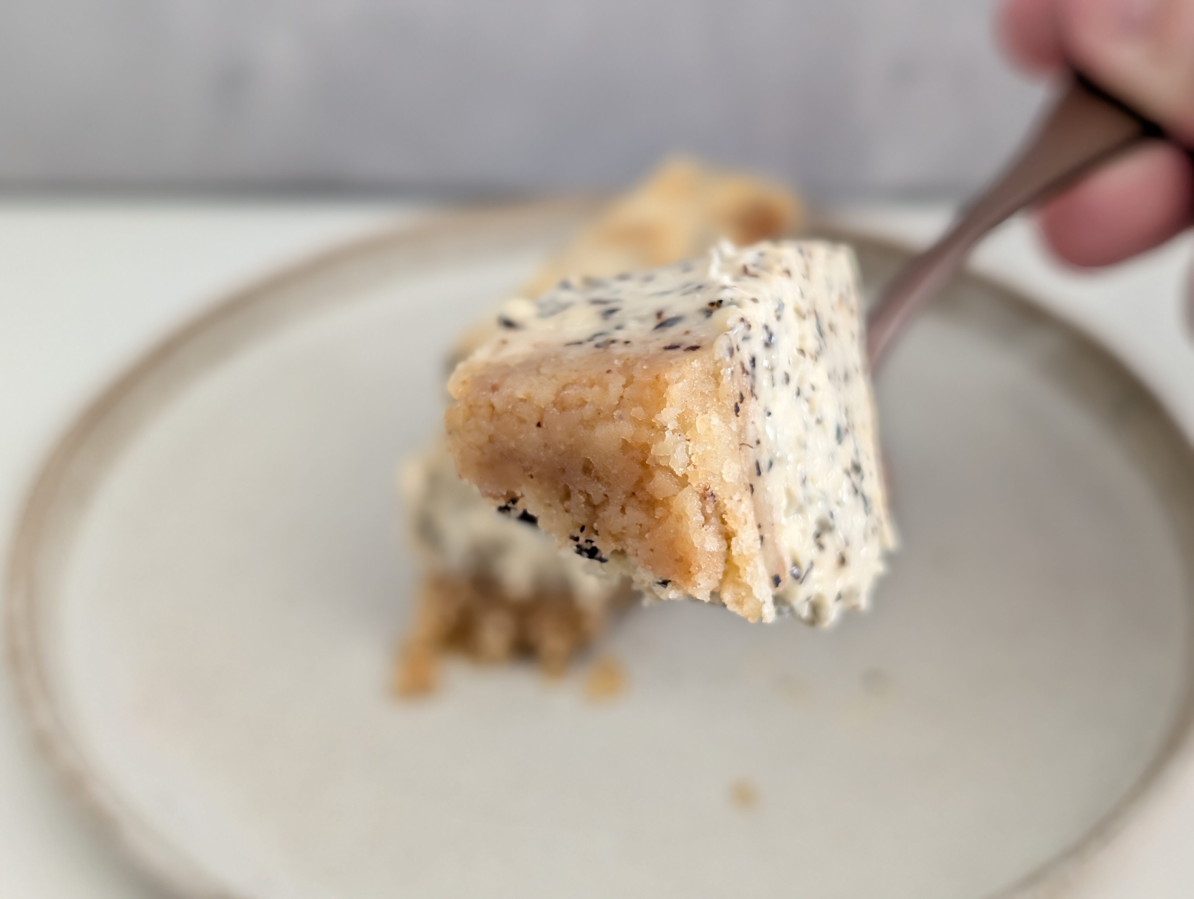 口に運ぶと、ねっとり滑らかなチーズケーキと、ザクザクと歯ごたえの良いクッキー生地のコントラストが非常に心地よく、一度食べるとクセになる食感です。
