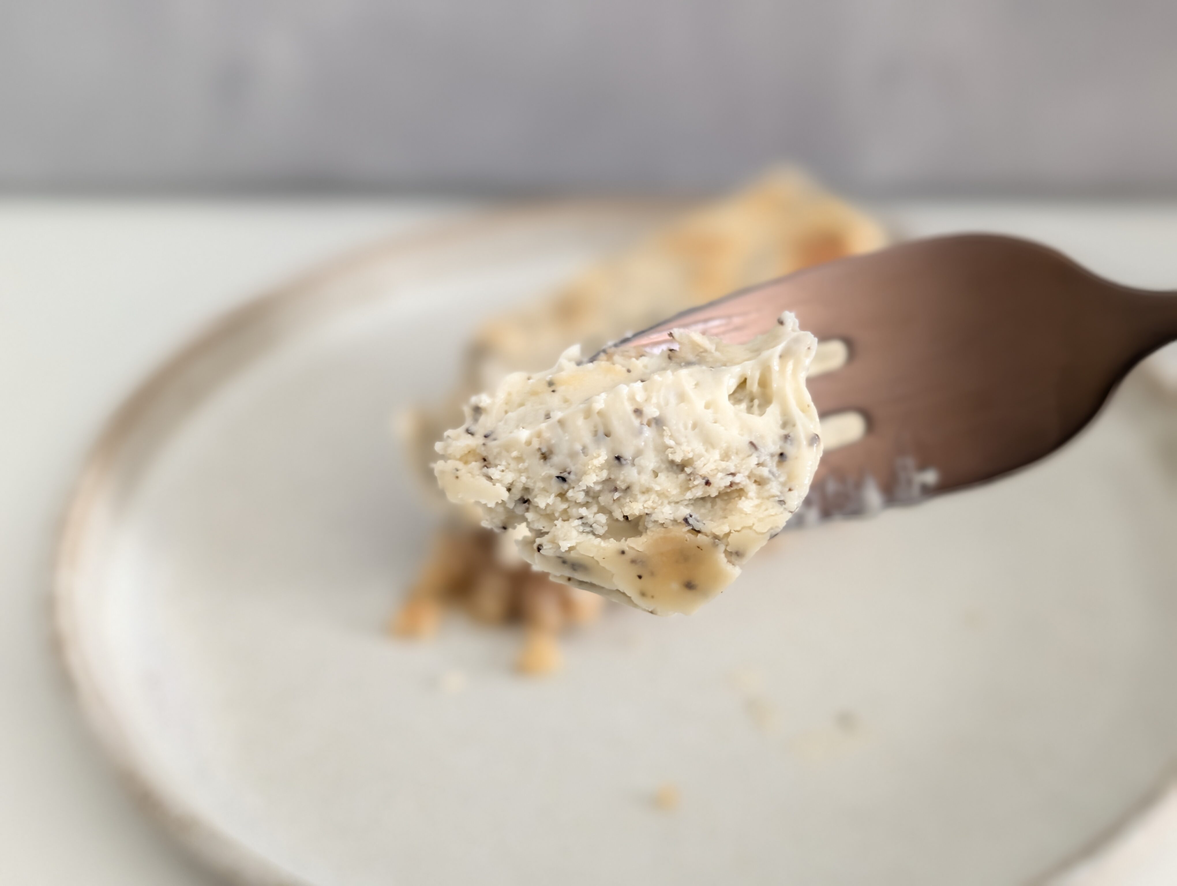 フォークを入れると、チーズケーキ部分はねっとりと密度が高く、しっかりとした手応えがあります。一方で、土台となっているクッキー生地は「ザックリ」とした質感です。