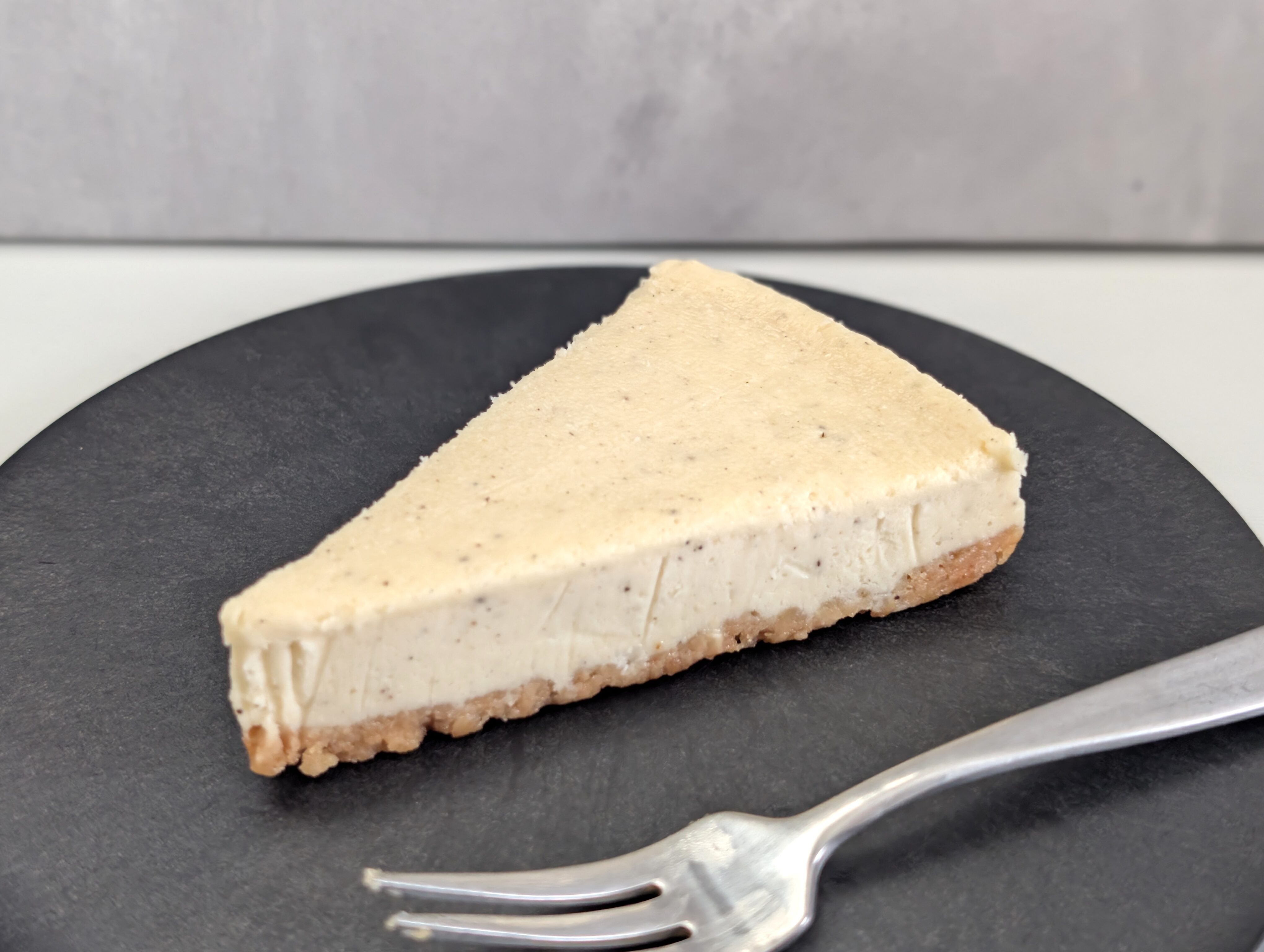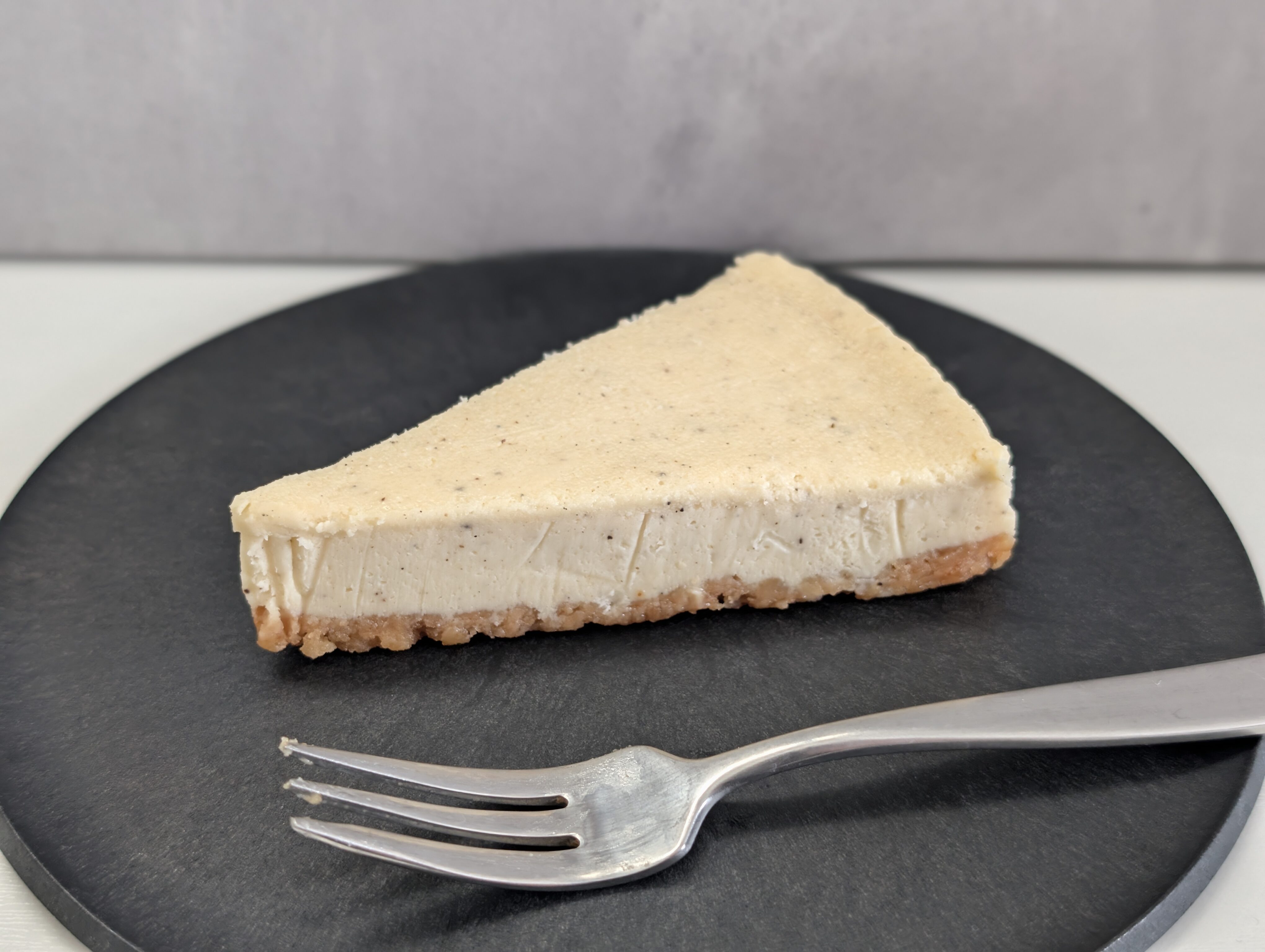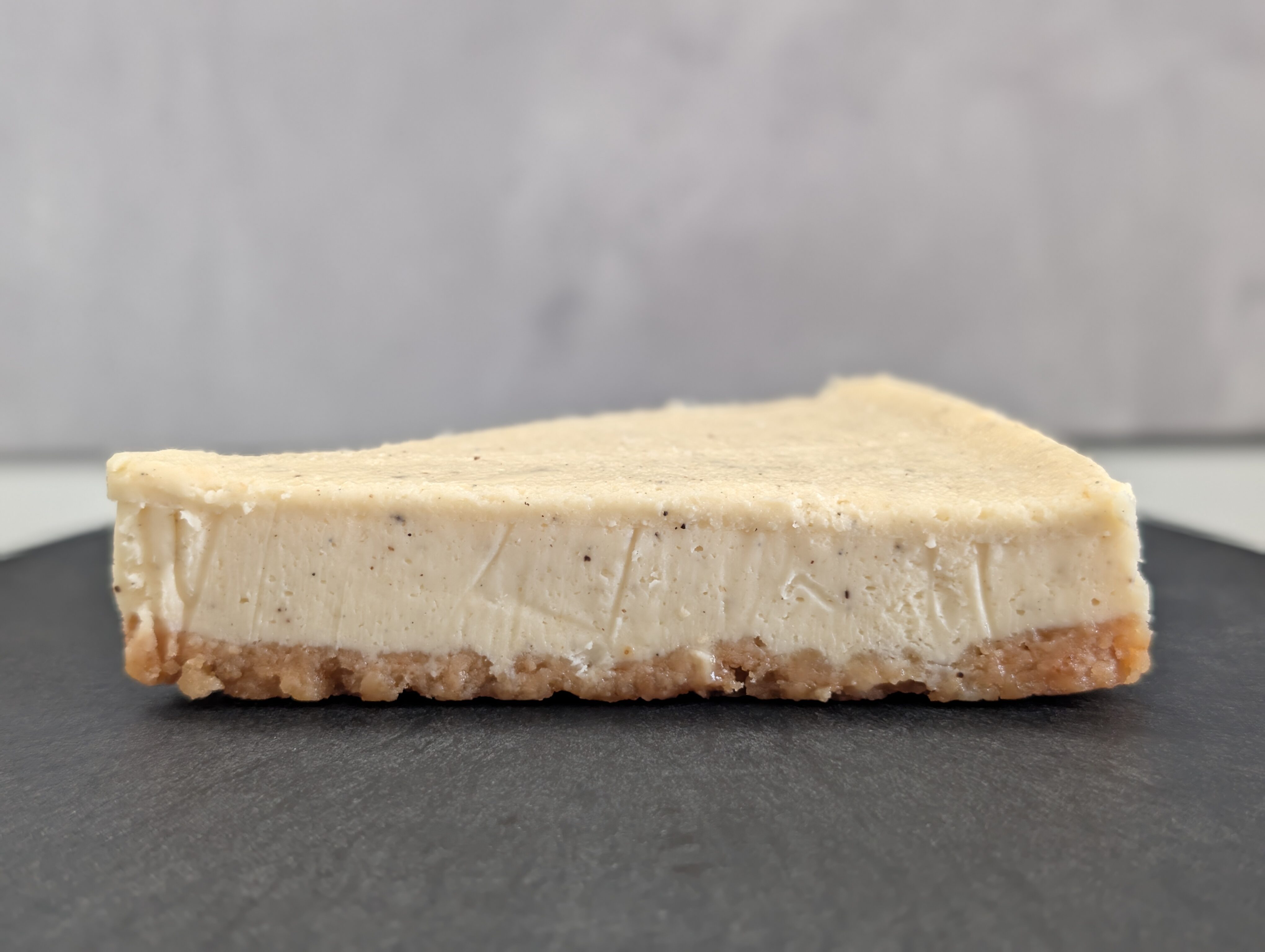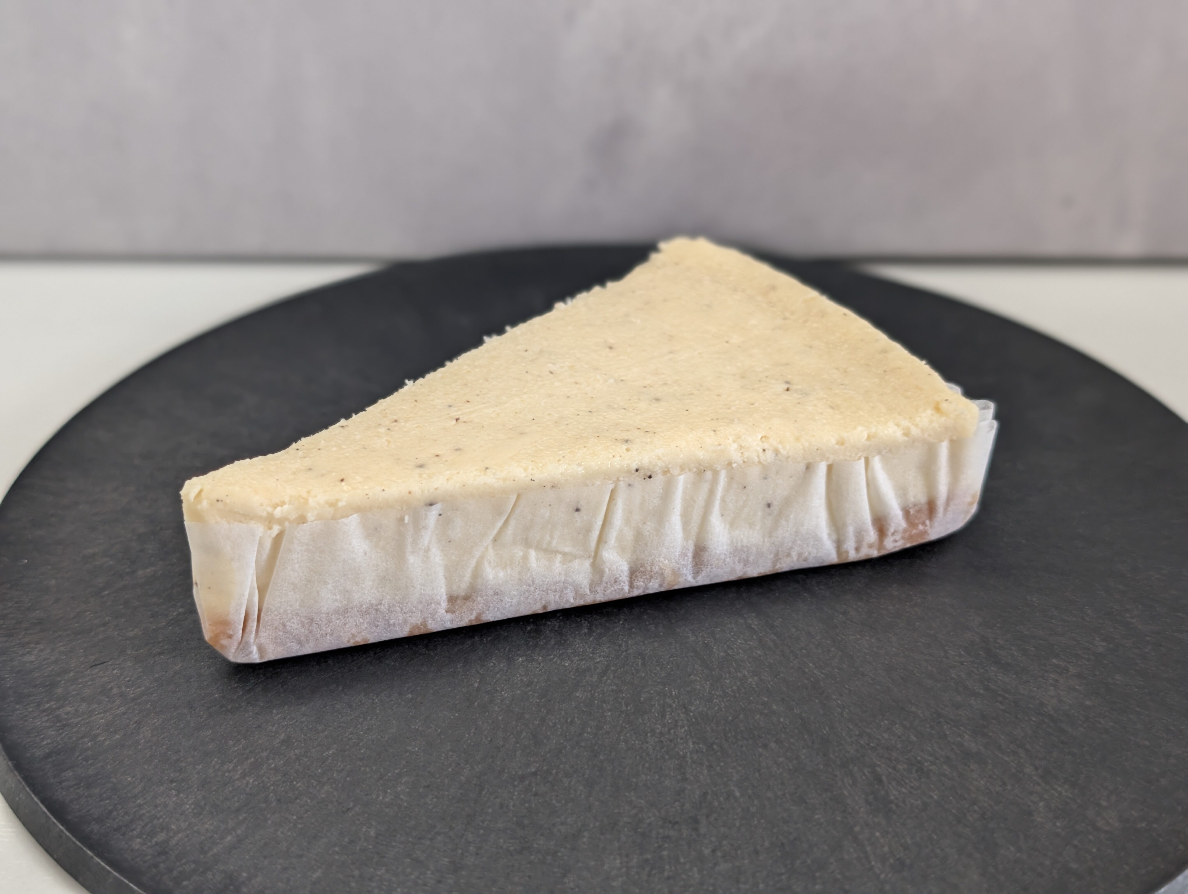 中身のケーキをみていきます。全体で2層になっており、上の層はクリーム色をしたチーズケーキです。表面にみえる黒いつぶつぶは恐らくバニラシードです。