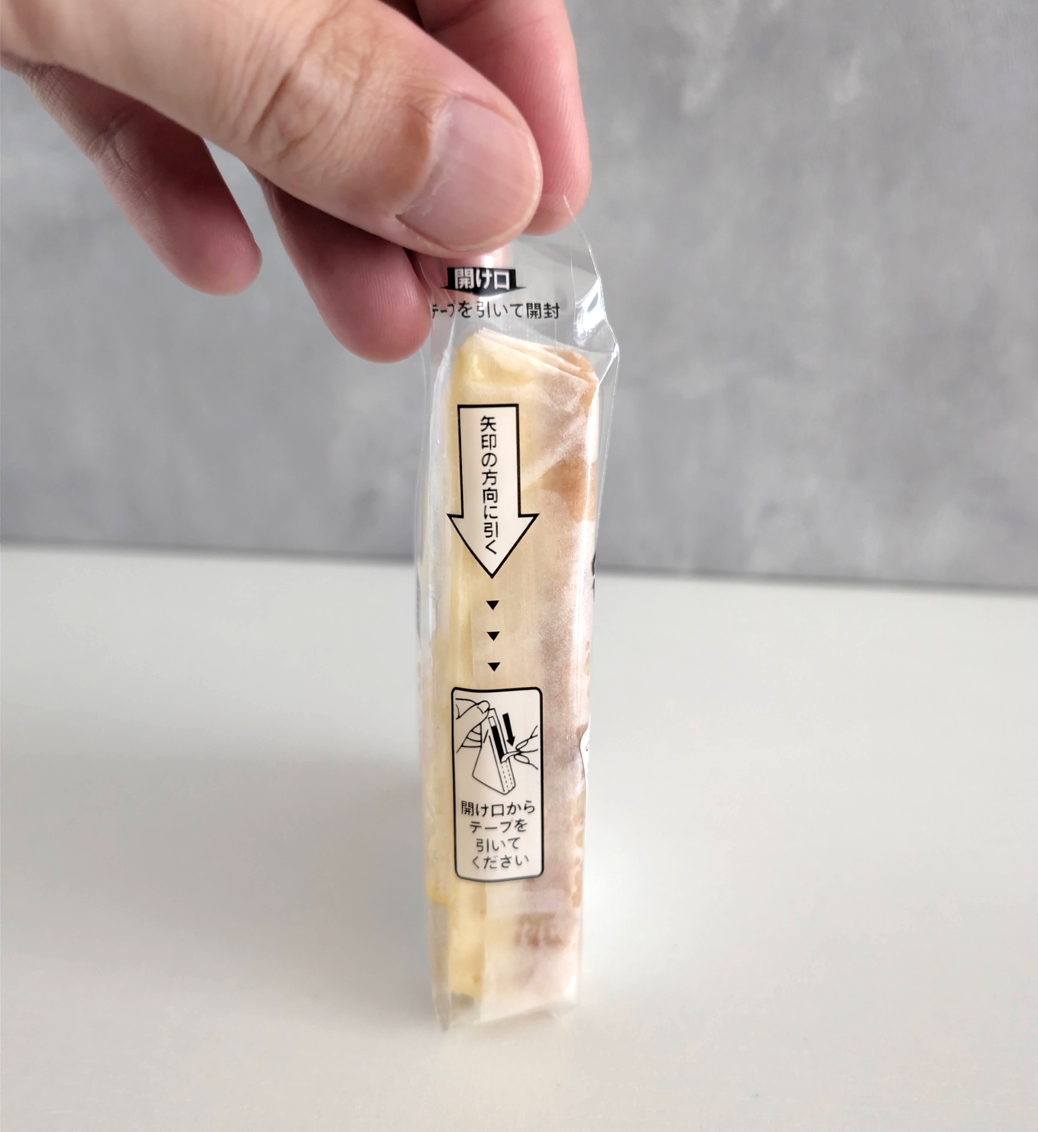 ホールのチーズケーキをカットしたような扇形をしたチーズケーキです。おにぎりのようにつまみを剥がして開けることができます。