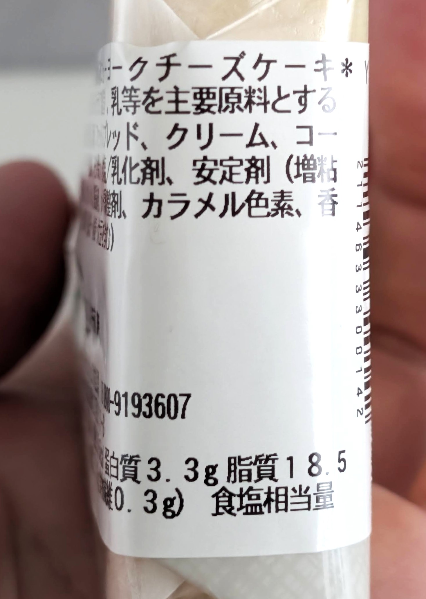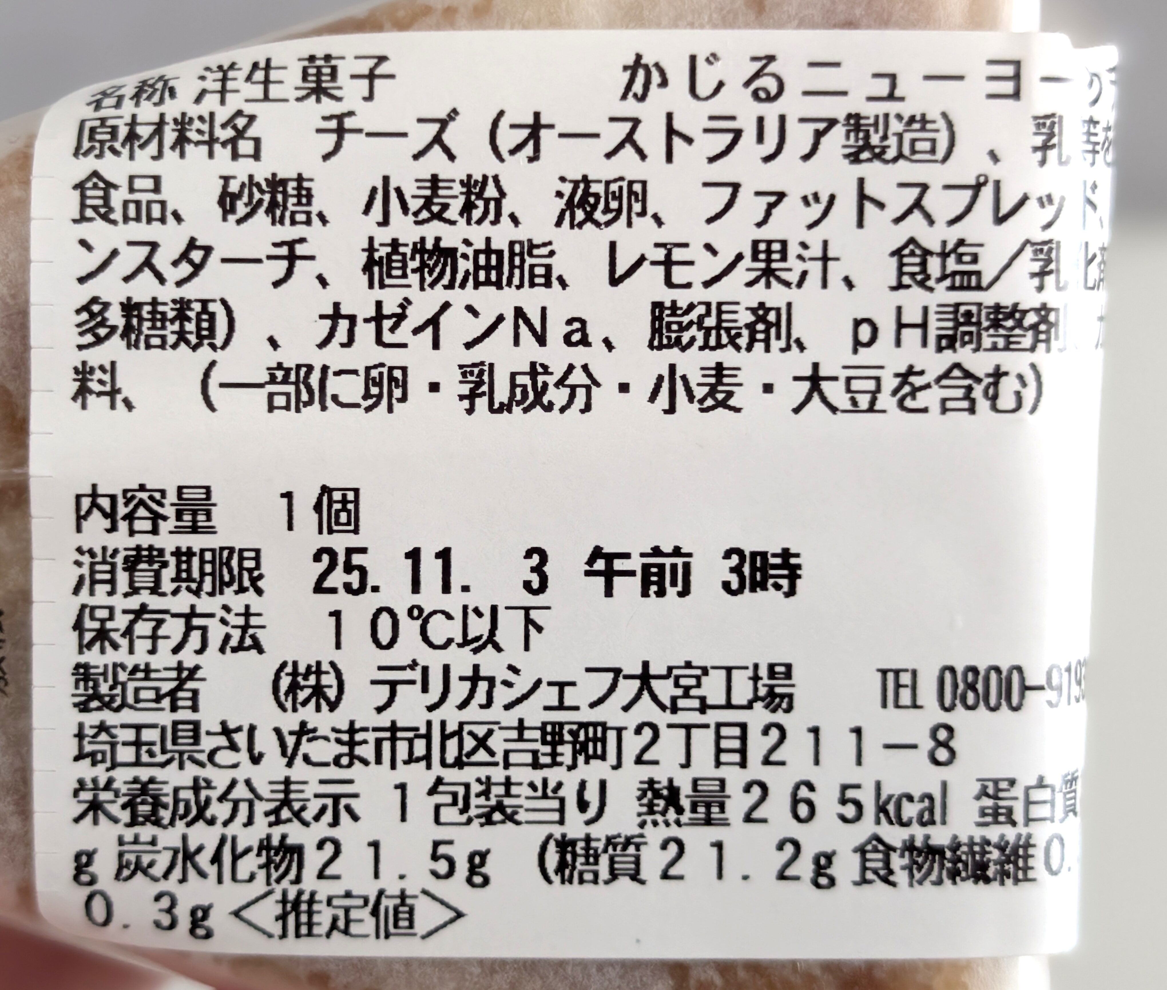 | 原材料名 | チーズ(オーストラリア製造)、乳等を主要原料とする食品、砂糖、小麦粉、液卵、ファットスプレッド、クリーム、コーンスターチ、植物油脂、レモン果汁、食塩/乳化剤、安定剤(増粘多糖類)、カゼインNa、膨張剤、pH調整剤、カラメル色素、香料、(一部に卵・乳成分・小麦・大豆を含む) |
