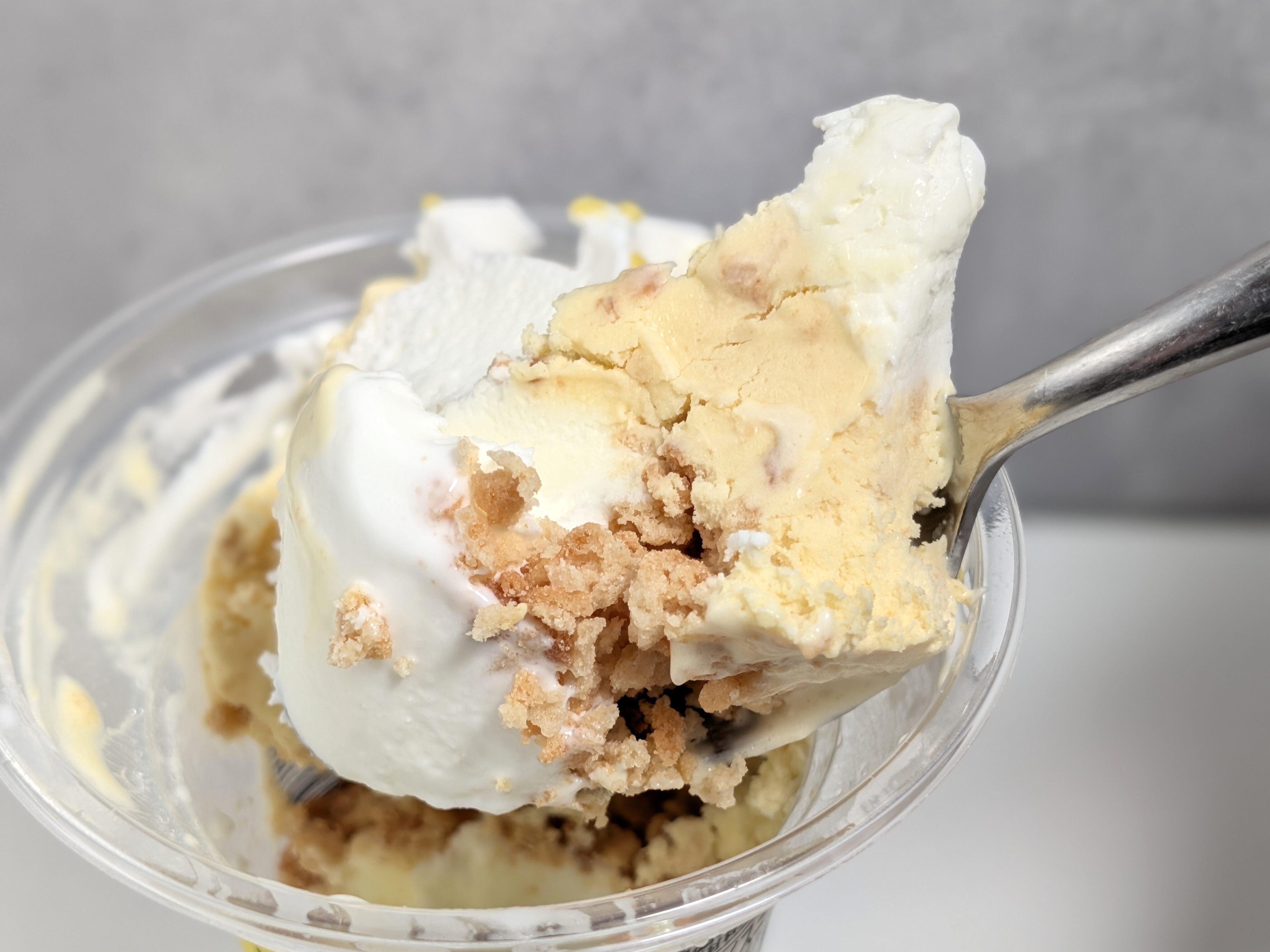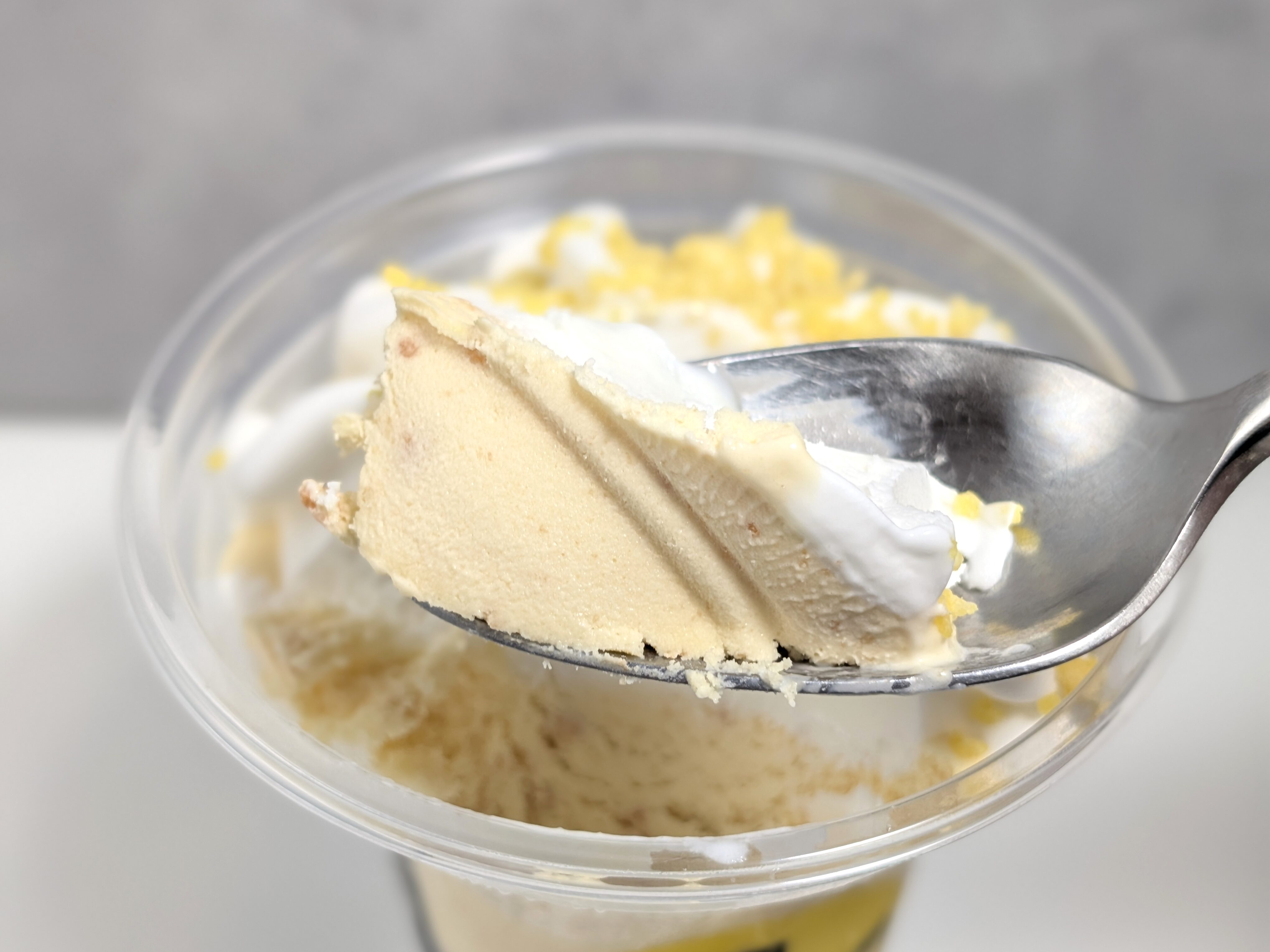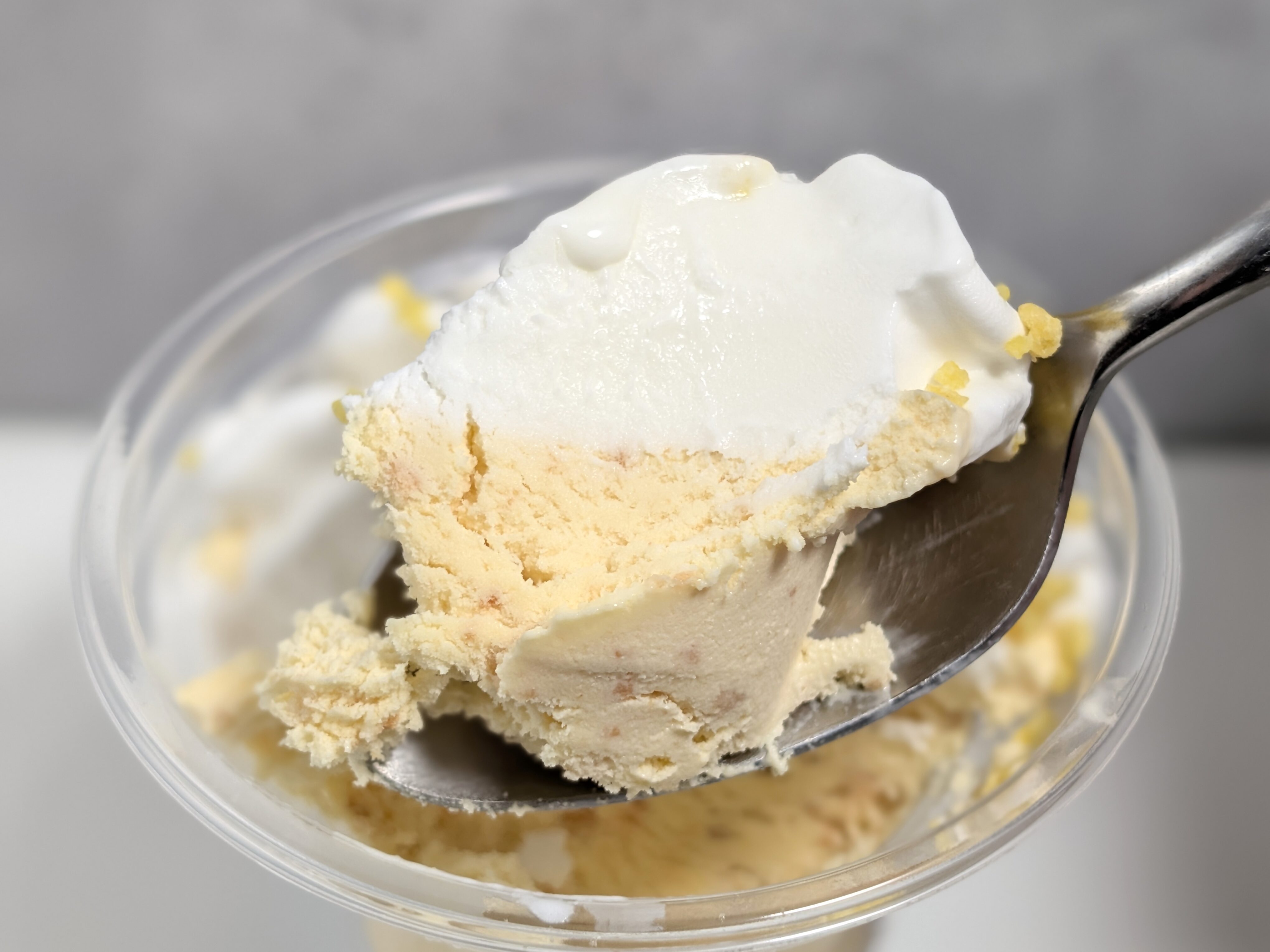 さらに下の3層目のクッキークランブルは、ほろほろとした食感。クッキー特有の香ばしい風味が、ミルクとチーズのアイスに深みと彩りを加えています。