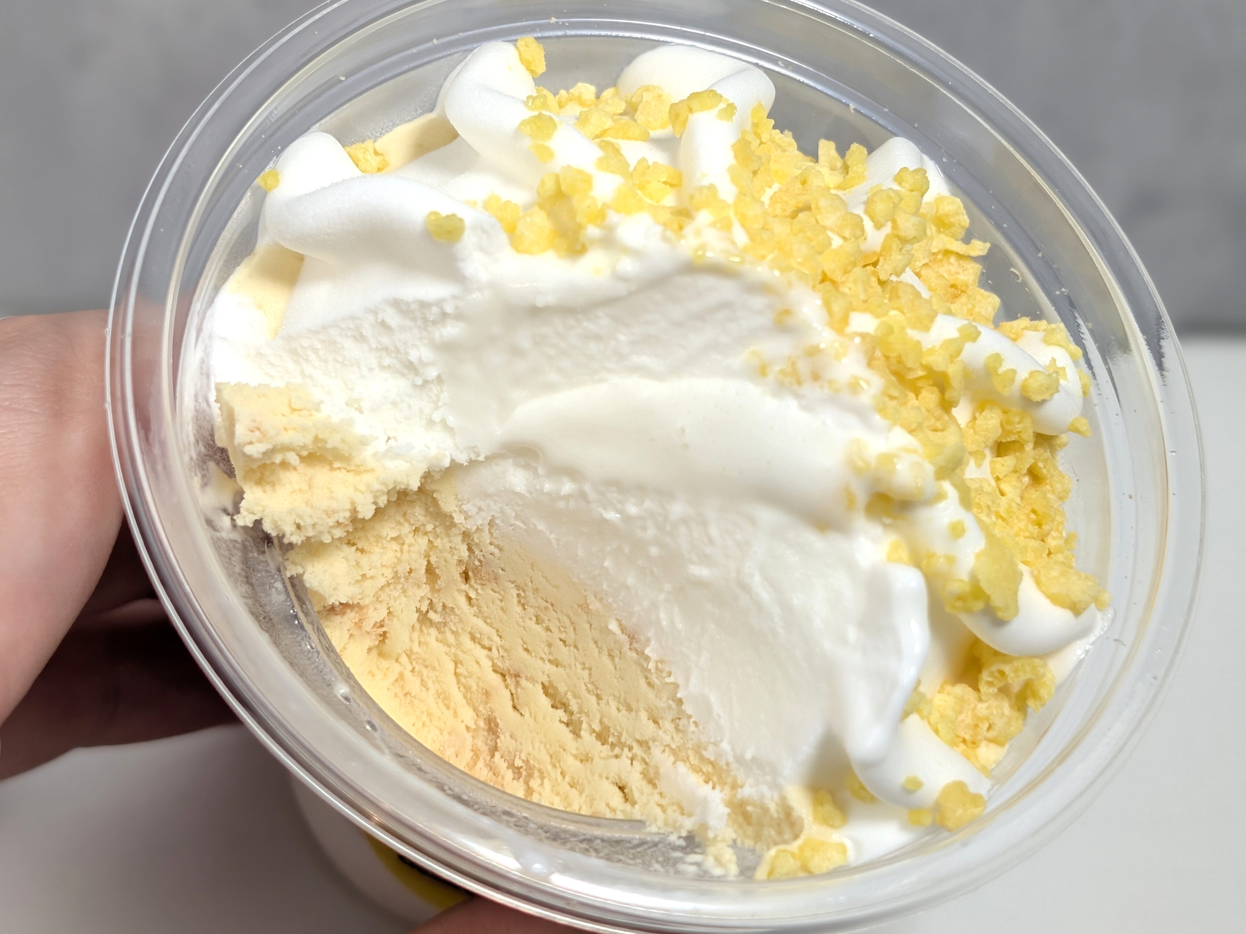 - 1層目:白いアイスには黄色いクランブルをトッピング