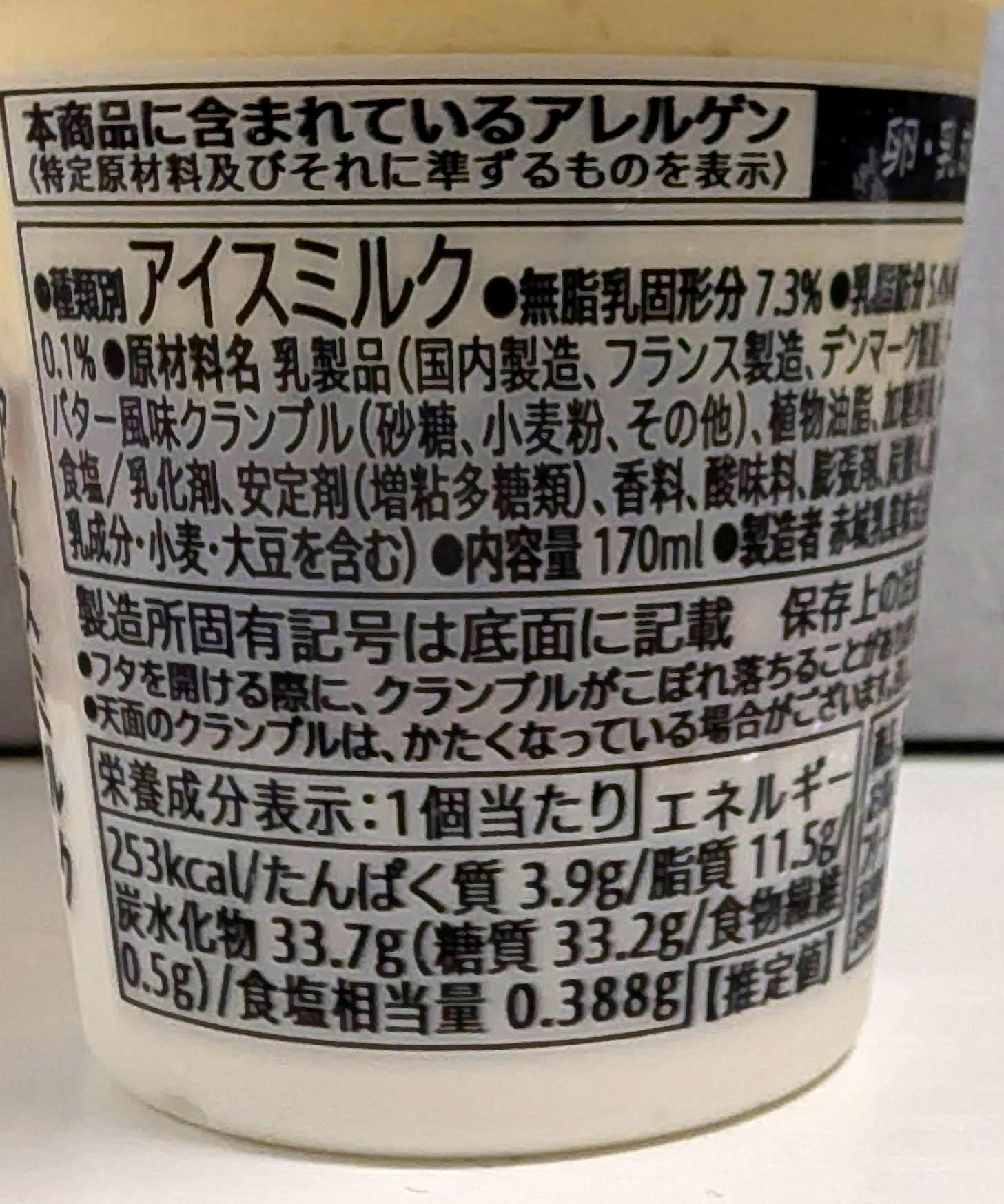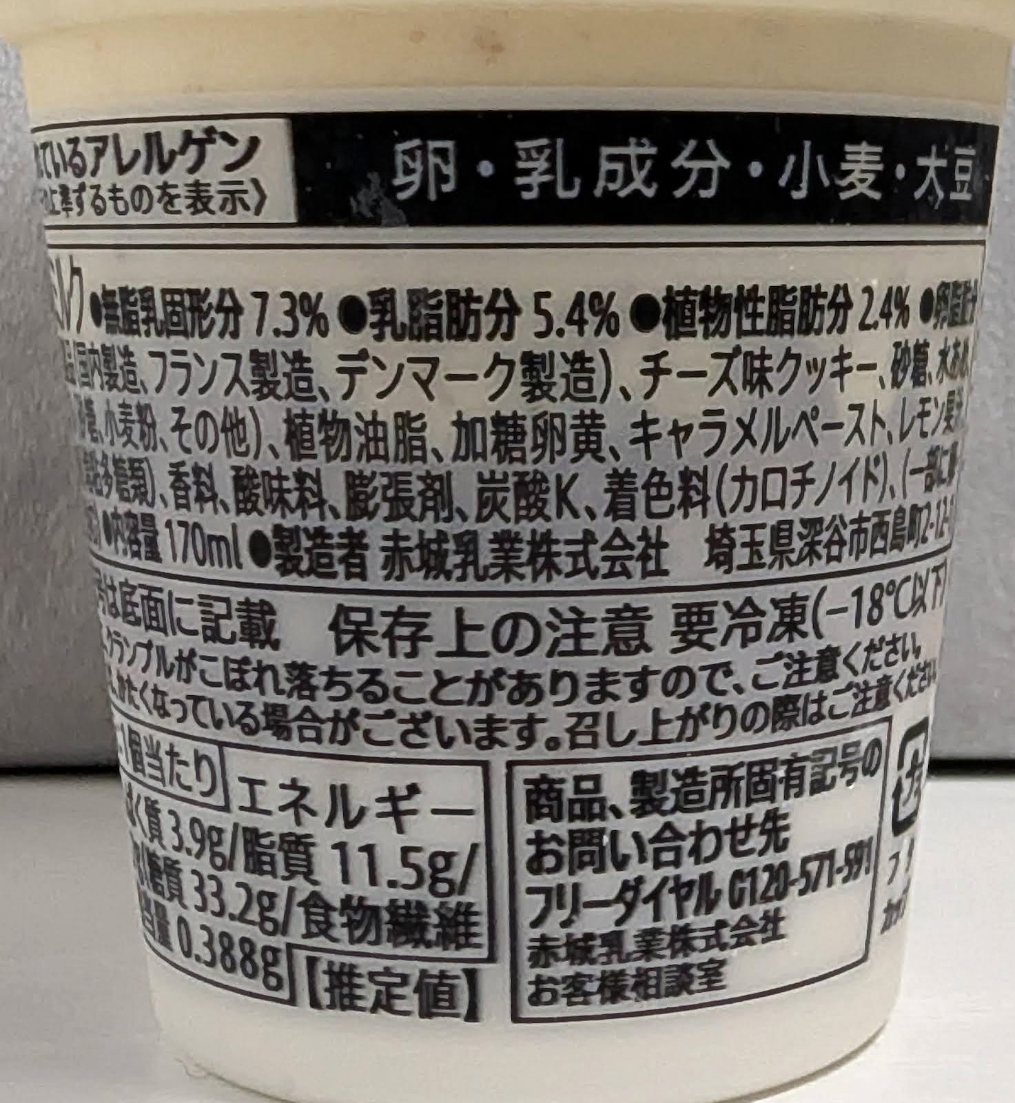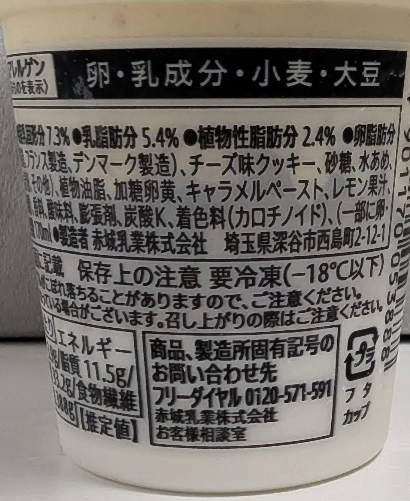 | 原材料名 | 乳製品(国内製造、フランス製造、デンマーク製造)、チーズ味クッキー、砂糖、水あめ、バター風味クランブル(砂糖、小麦粉、その他)、植物油脂、加糖卵黄、キャラメルペースト、レモン果汁、食塩/乳化剤、安定剤(増粘多糖類)、香料、酸味料、膨張剤、炭酸K、着色料(カロチノイド)、(一部に卵・乳成分・小麦・大豆を含む) |