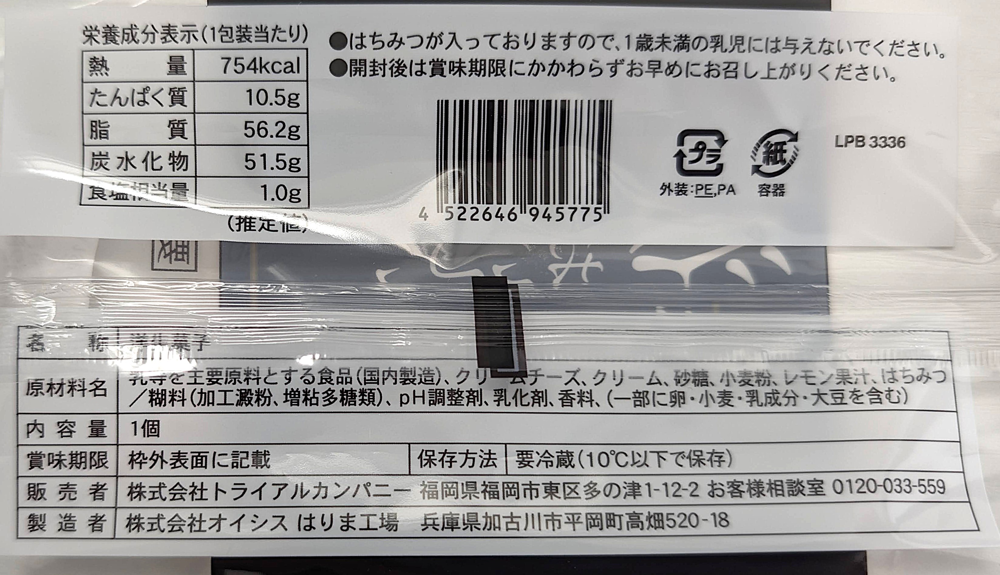 | 原材料名 | 乳等を主要原料とする食品(国内製造)、クリームチーズ、クリーム、砂糖、小麦粉、レモン果汁、はちみつ/糊料(加工澱粉、増粘多糖類)、pH調整剤、乳化剤、香料、(一部に卵・小麦・乳成分・大豆を含む) |