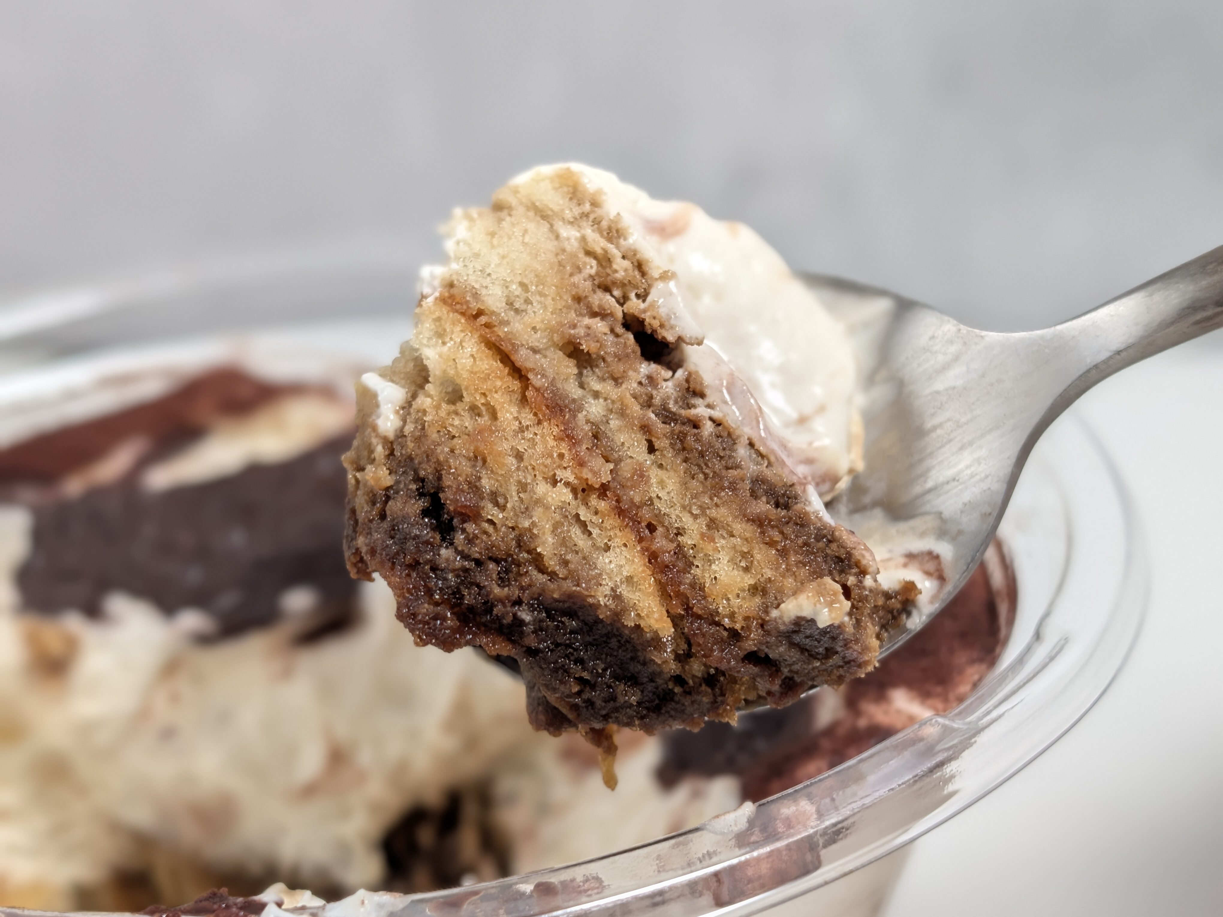 土台となるスポンジ生地は、コーヒーの苦味がしっかり効いていますが、水分でベチャベチャすることなく、かためのパウンドケーキのような「がっしり」とした食感が残っていました。