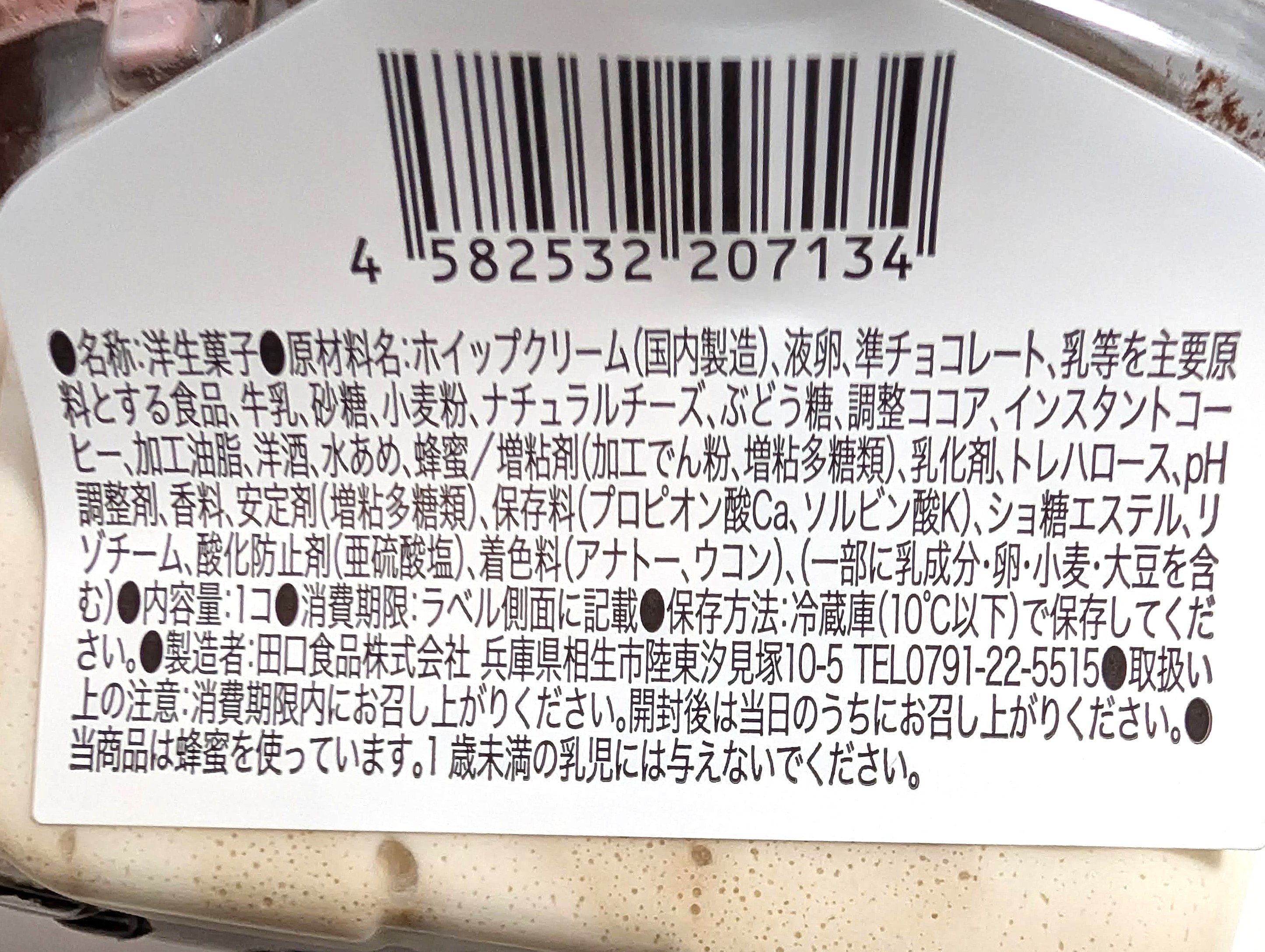 | 原材料名 | ホイップクリーム(国内製造)、液卵、準チョコレート、乳等を主要原料とする食品、牛乳、砂糖、小麦粉、ナチュラルチーズ、ぶどう糖、調整ココア、インスタントコーヒー、加工油脂、洋酒、水あめ、蜂蜜/増粘剤(加工でん粉、増粘多糖類)、乳化剤、トレハロース、pH調整剤、香料、安定剤(増粘多糖類)、保存料(プロピオン酸Ca、ソルビン酸K)、ショ糖エステル、リゾチーム、酸化防止剤(亜硫酸塩)、着色料(アナトー、ウコン)、(一部に乳成分・卵・小麦・大豆を含む) |