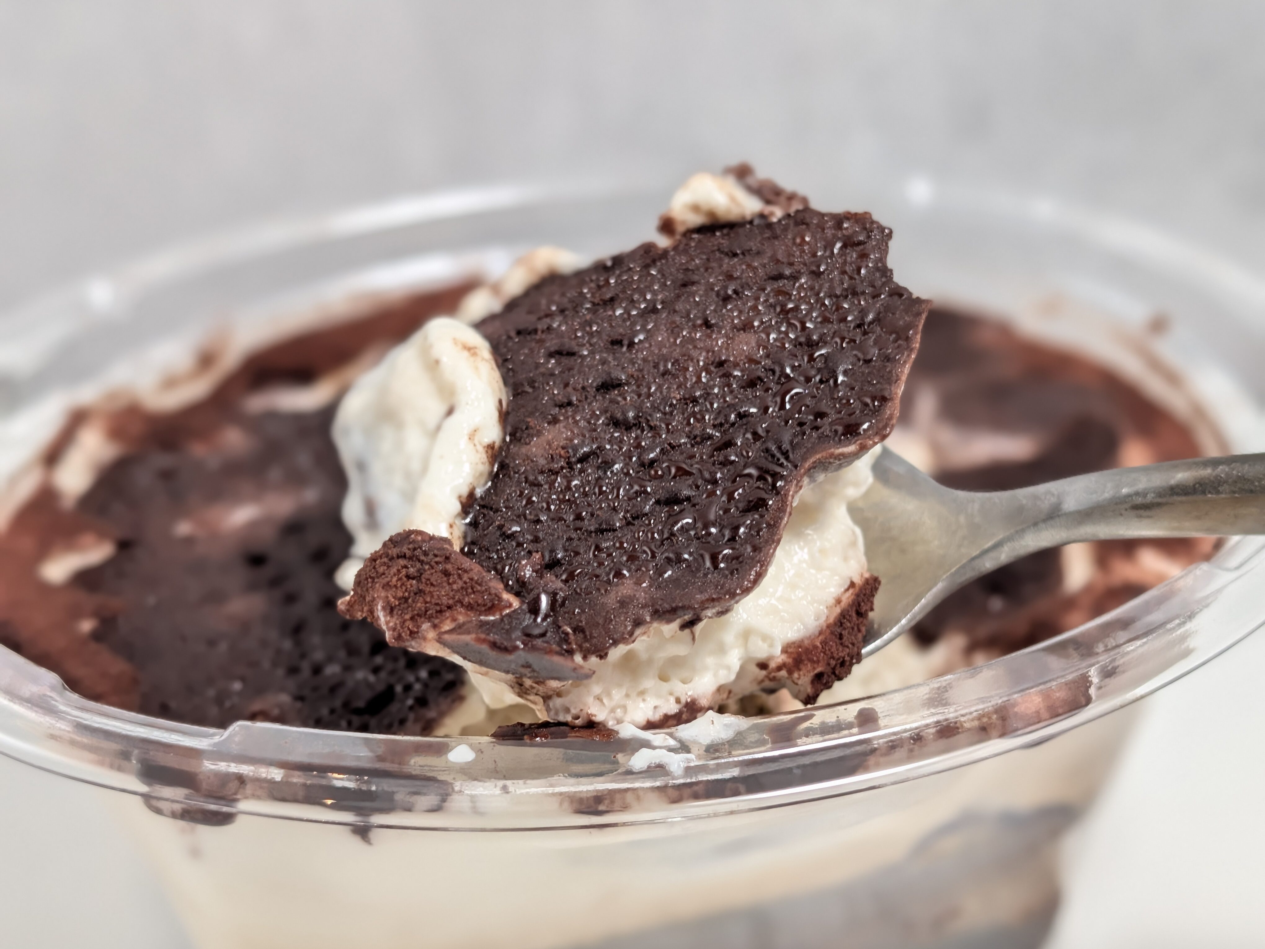 実際にスプーンを入れてみると、表面のチョコは薄い「パリパリ」という感触ではなく、もう少し厚みのある「ボソッ」とした手応えでした。少し柔らかめの板チョコといったらいいでしょうか。