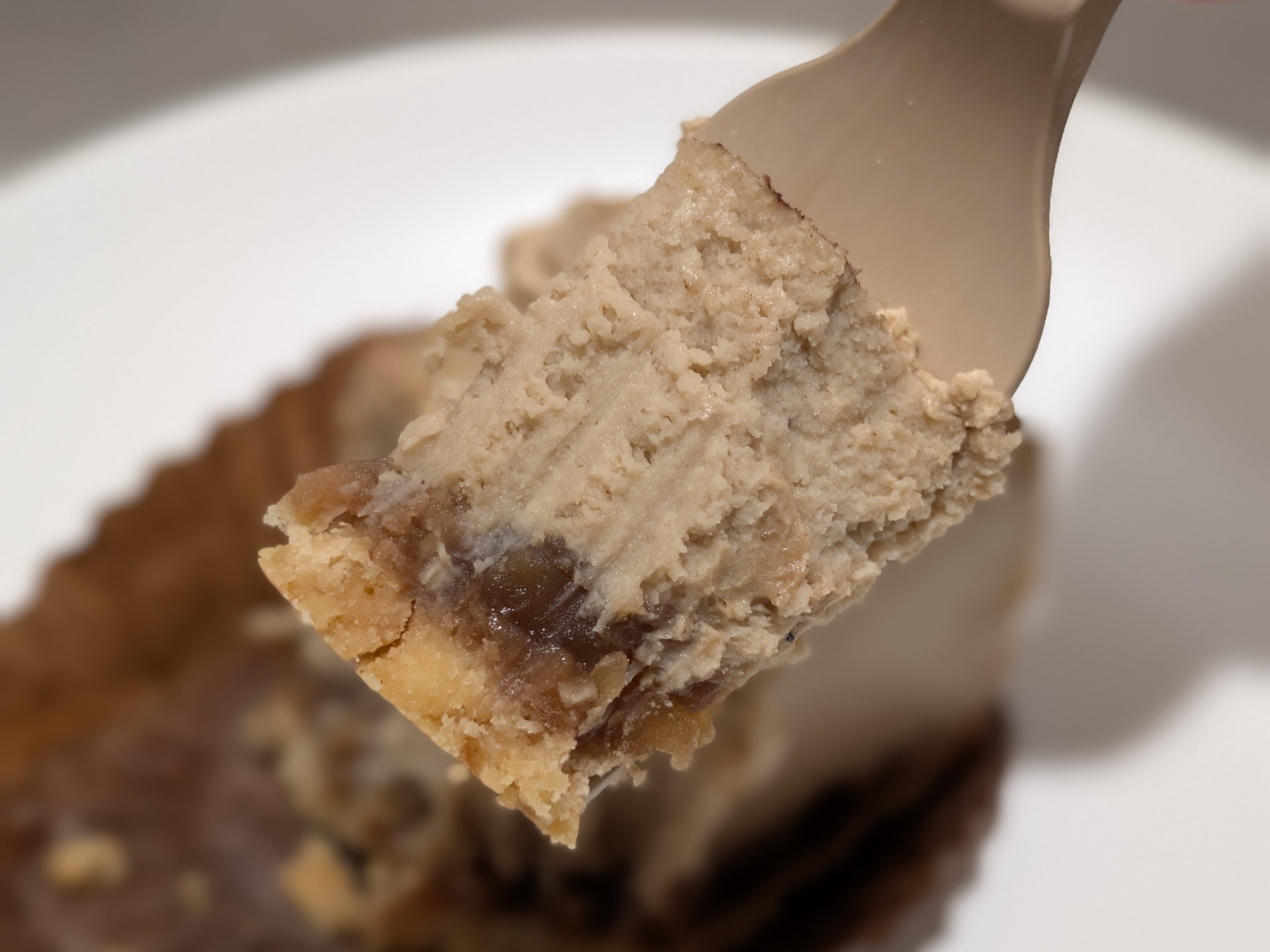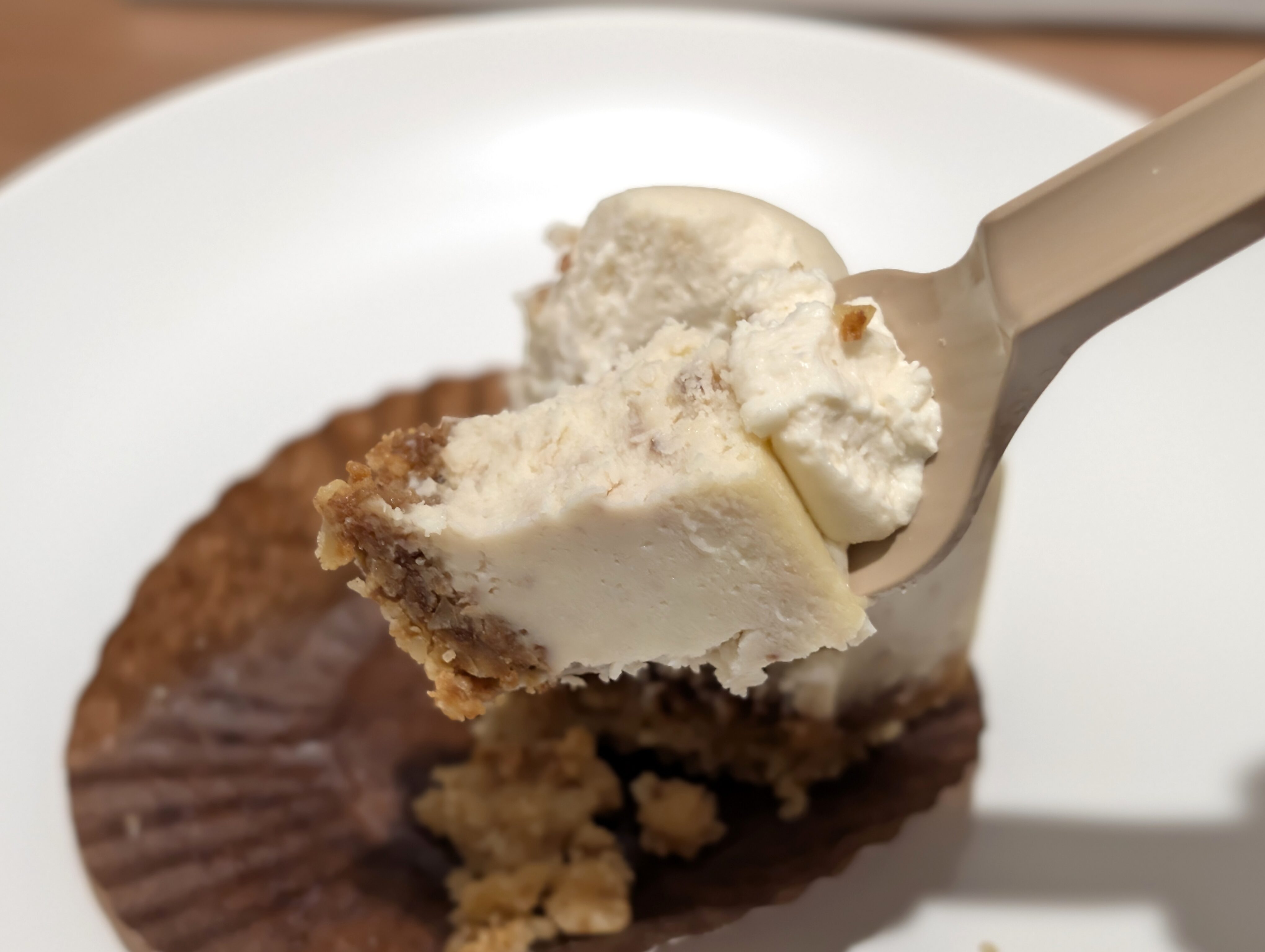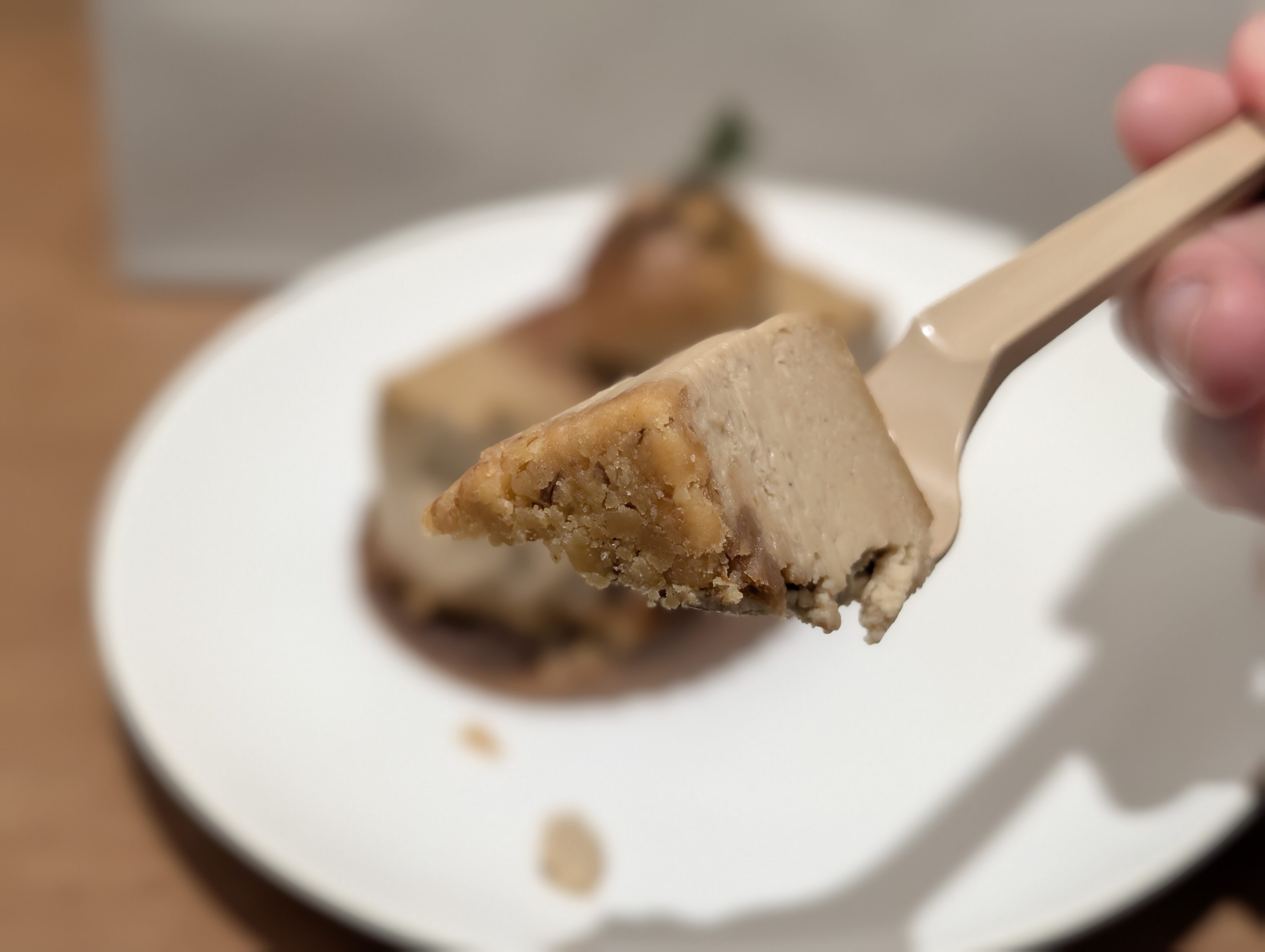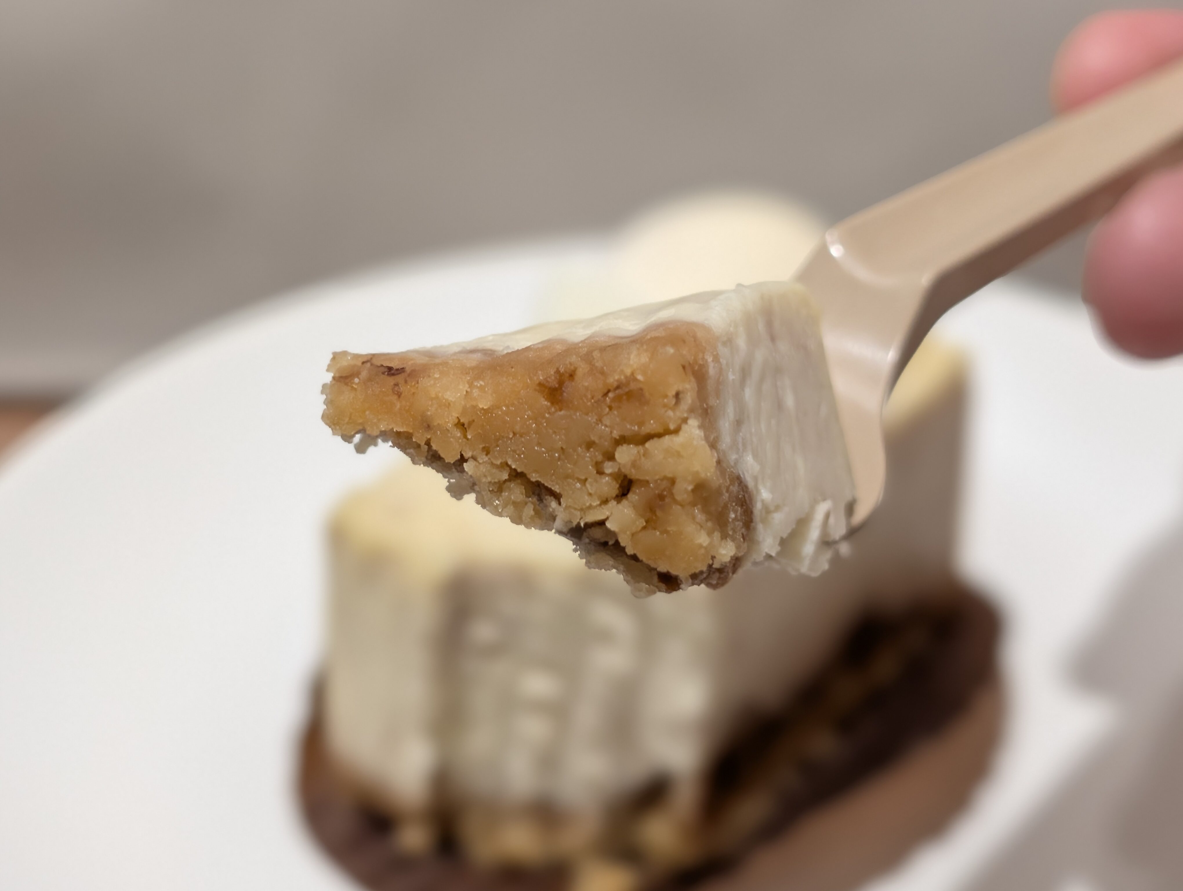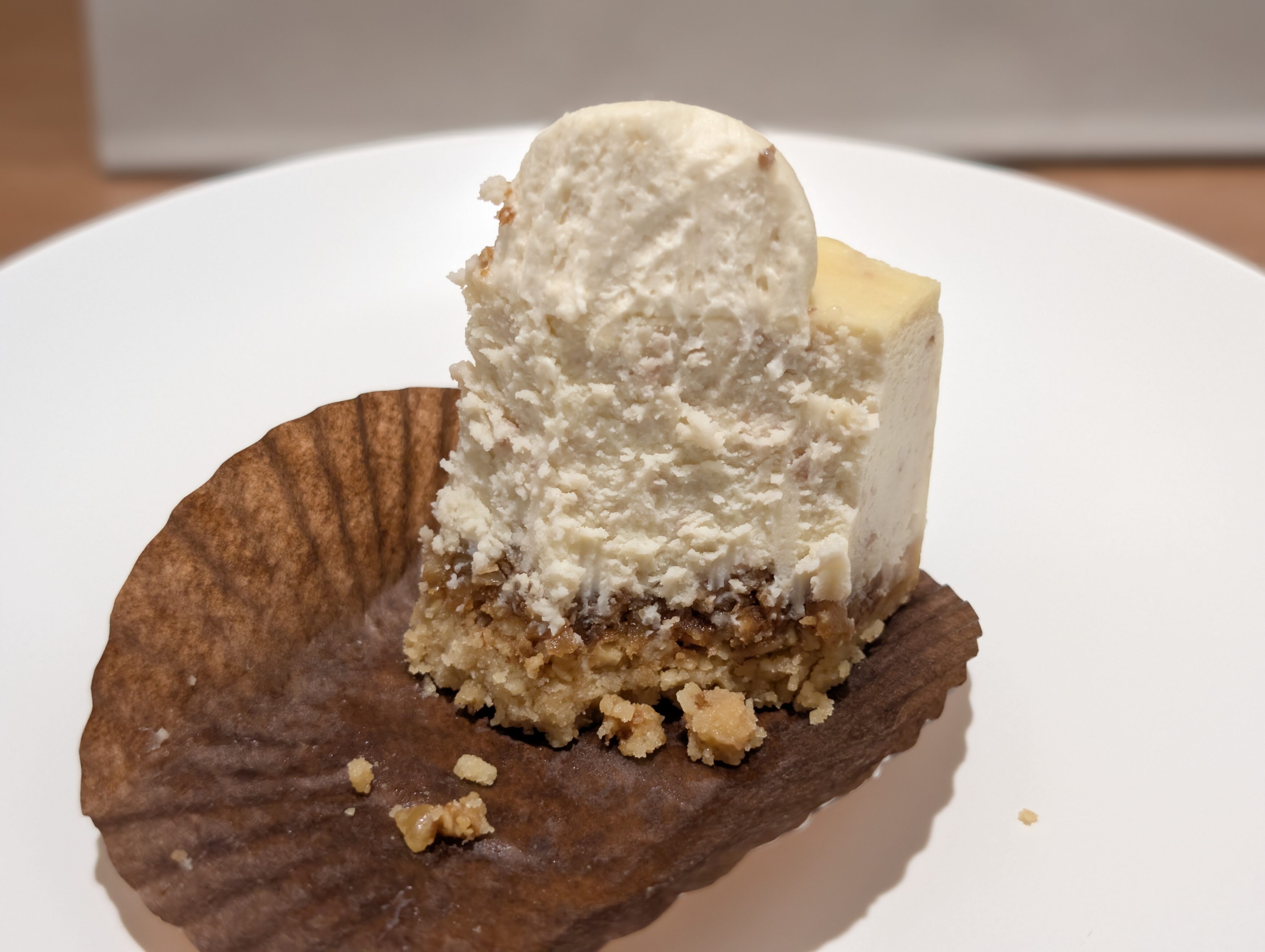 まず食感ですが、チーズケーキはねっとりしつつ、なめらかな食感の中にクルミのゴロゴロとした食感とクッキー生地のザクザクした食感もあります。柔らかい食感も硬い食感もあり、コントラストがあるので食べていて楽しいです。