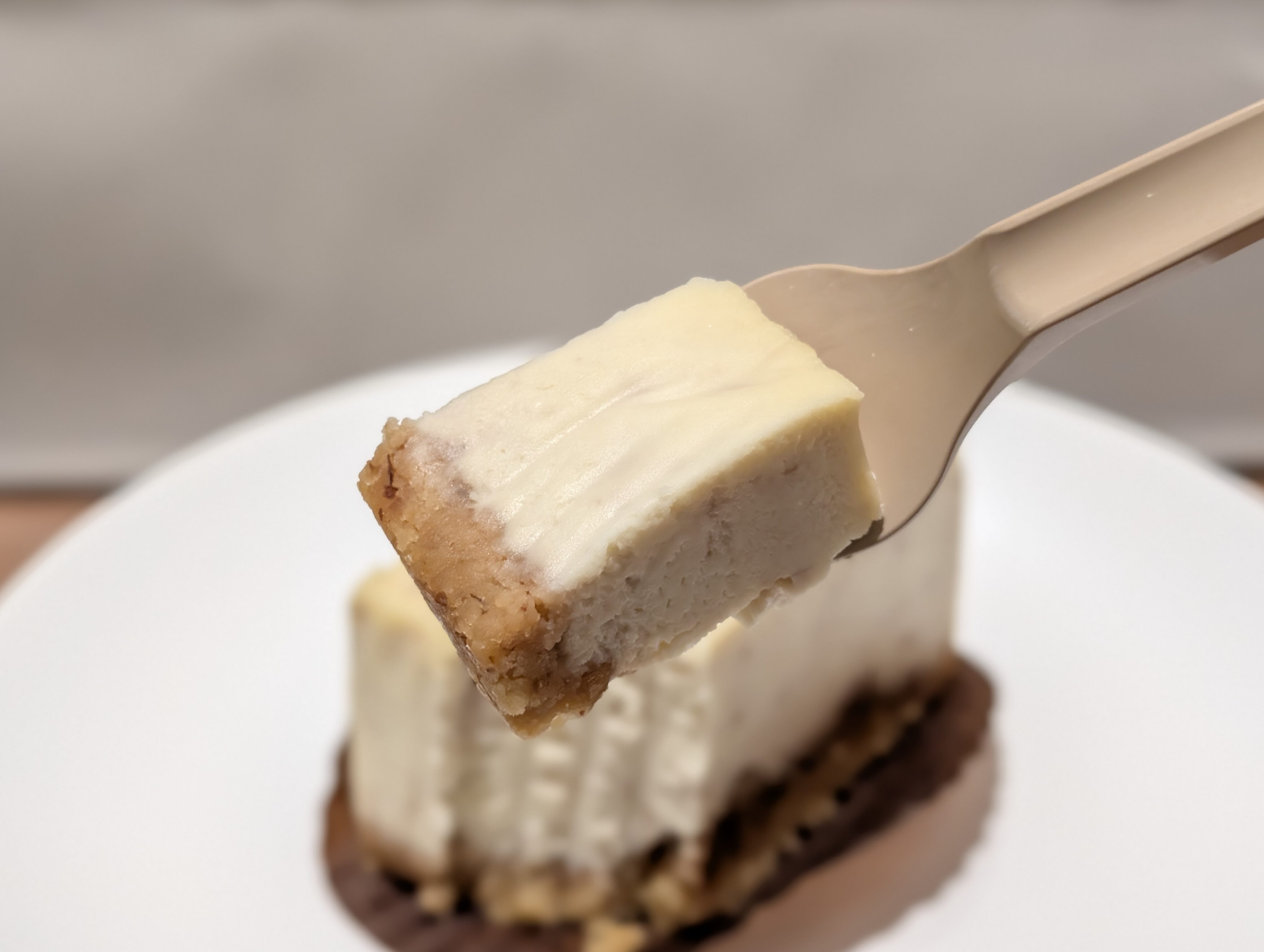 まず食感はねっとりながら、舌触りはとてもなめらかです。細かくなめらかで余分な空気が入っていない均一な生地で、感動的なテクスチャーとなっています。またクッキー生地はサクサクで、チーズケーキとのコントラストもたまりません。