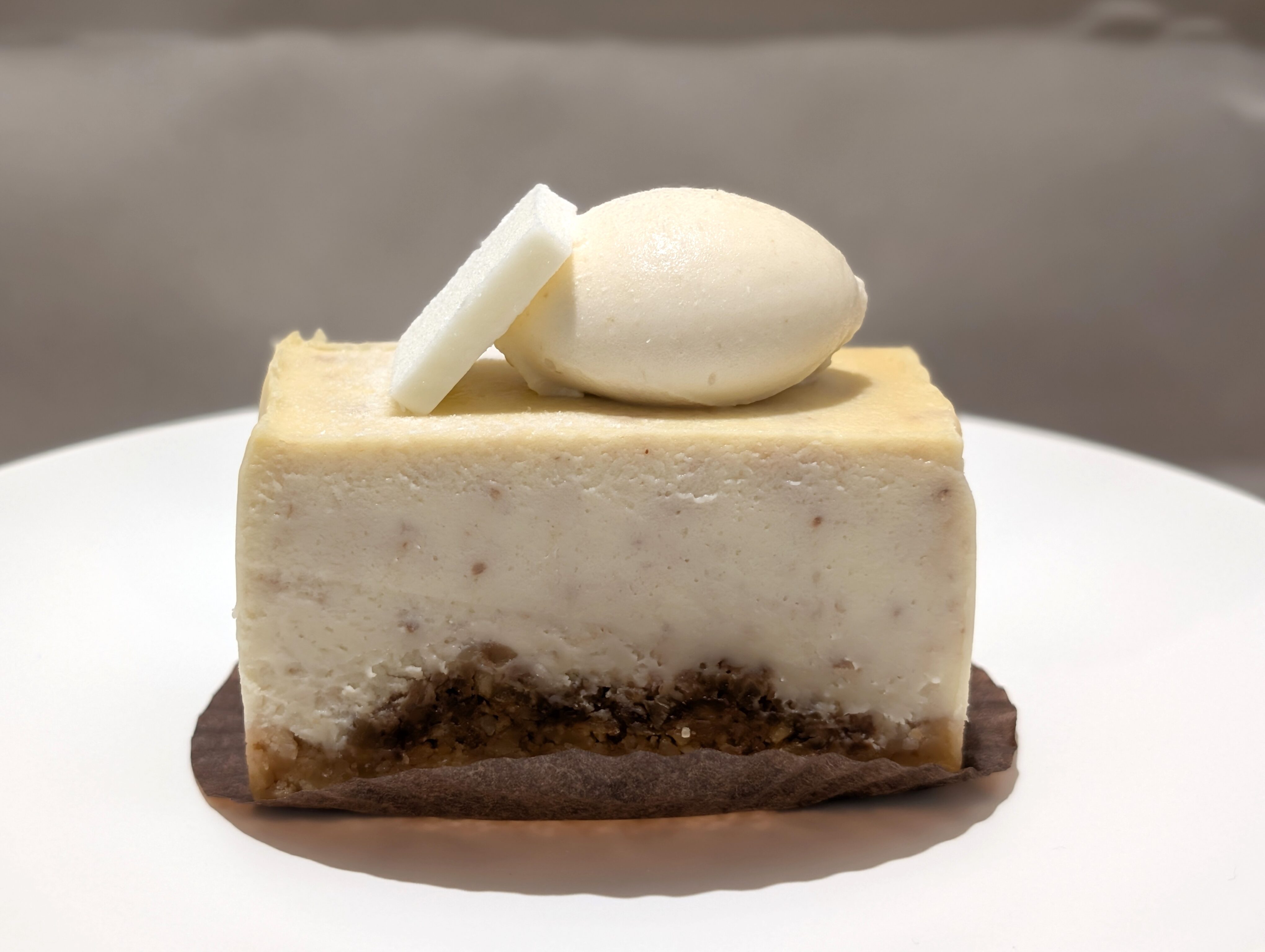 底にはキャラメルクランチの生地を敷いており、本体は砕いたクルミを閉じ込めたベイクドチーズケーキです。表面にはカルピスバターとみそあん(白あんと白みそを混ぜたもの)をトッピング。
