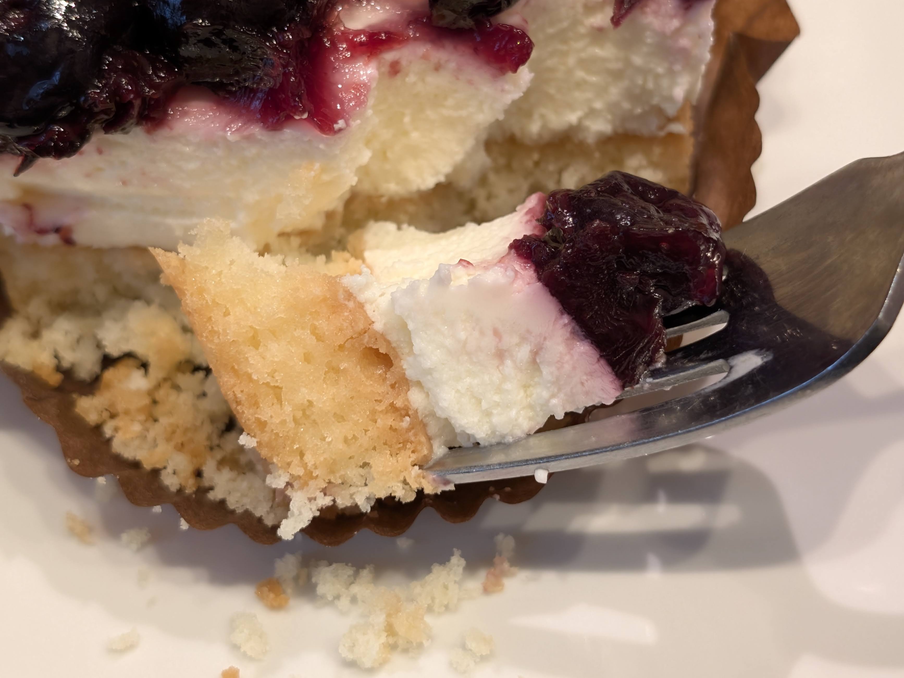フォークを入れると、ブルーベリー果肉のトッピング部分からすっと入っていきます。底のガレット生地もフォークが難なく通る柔らかさです。