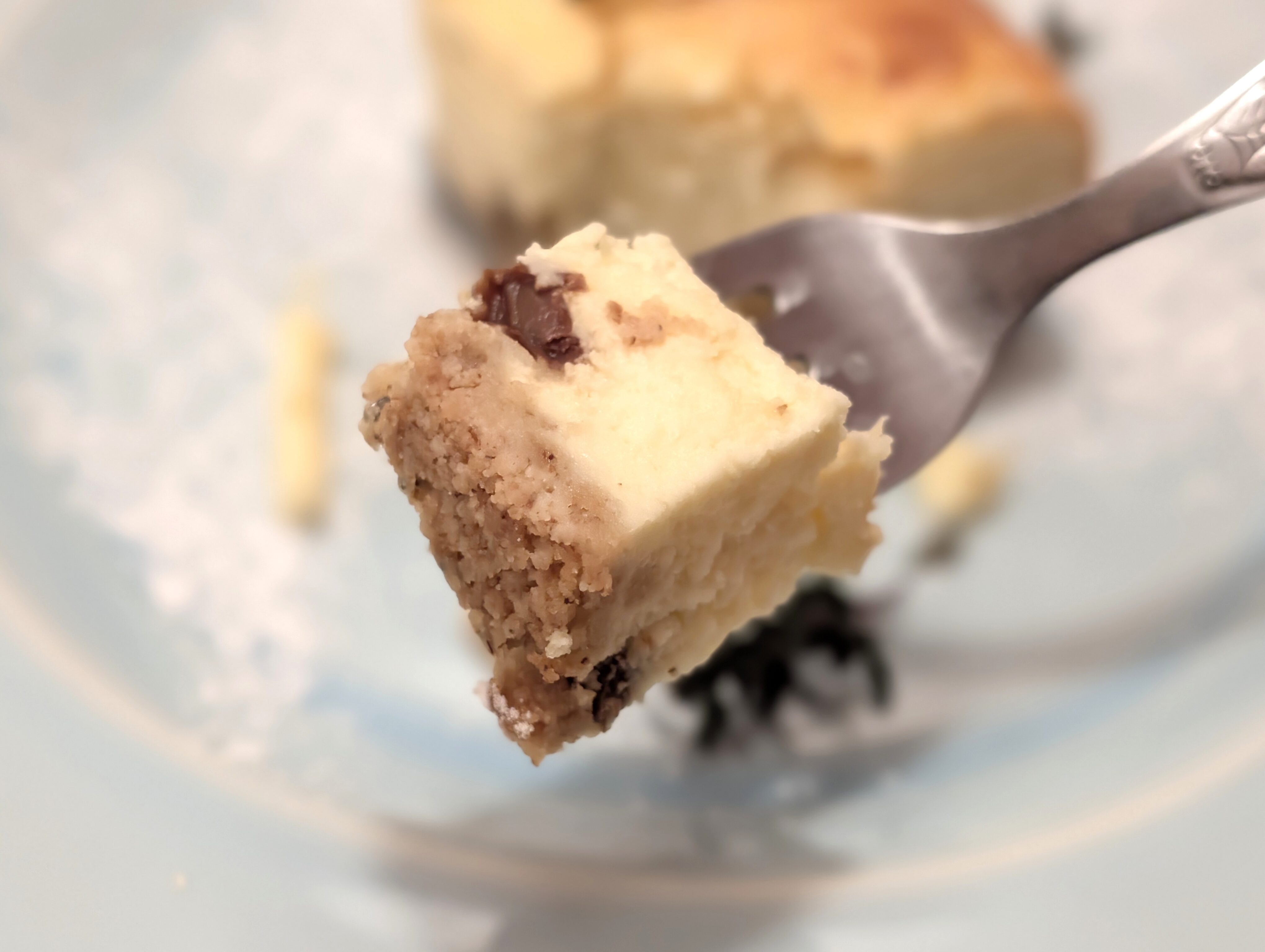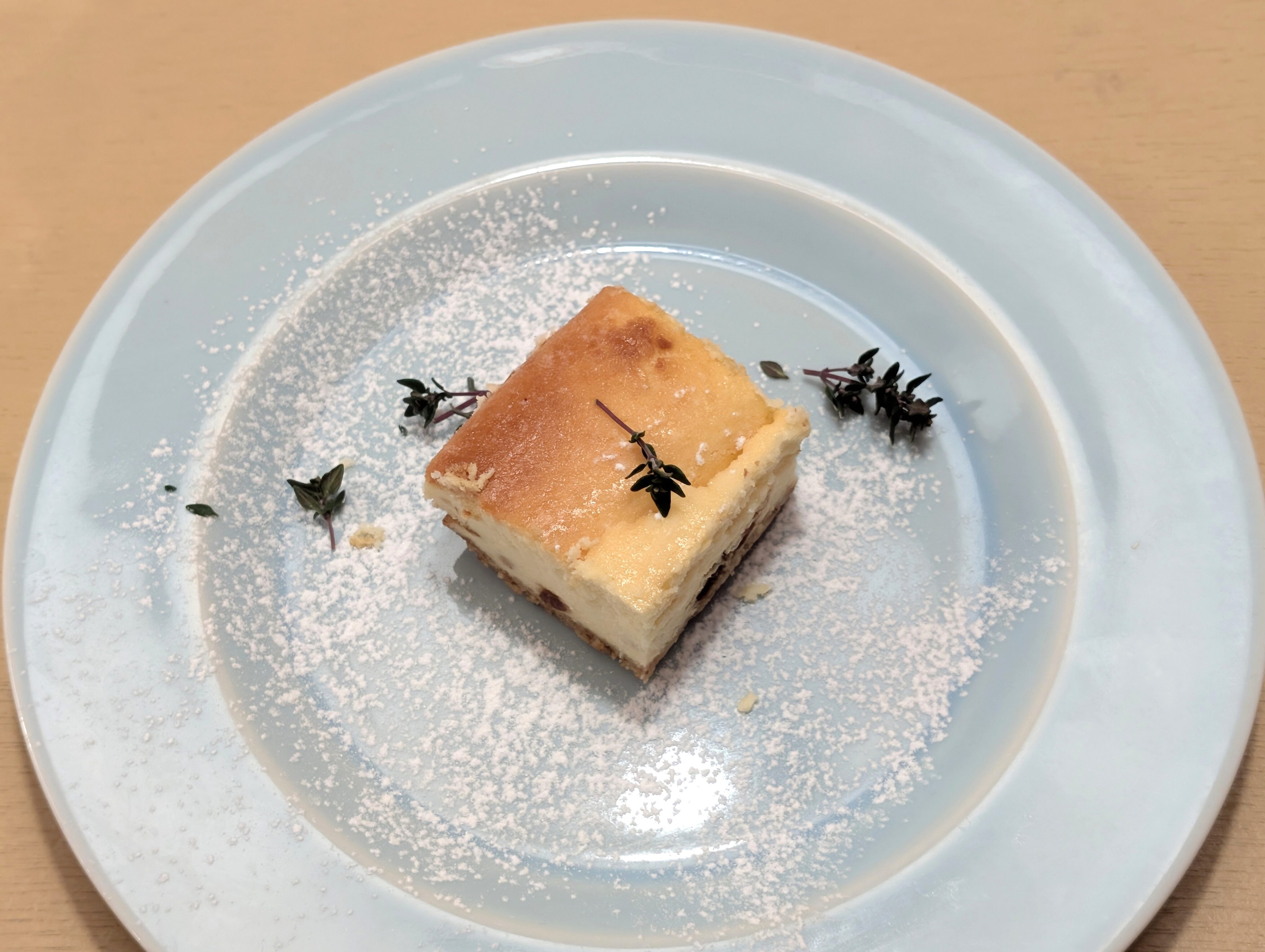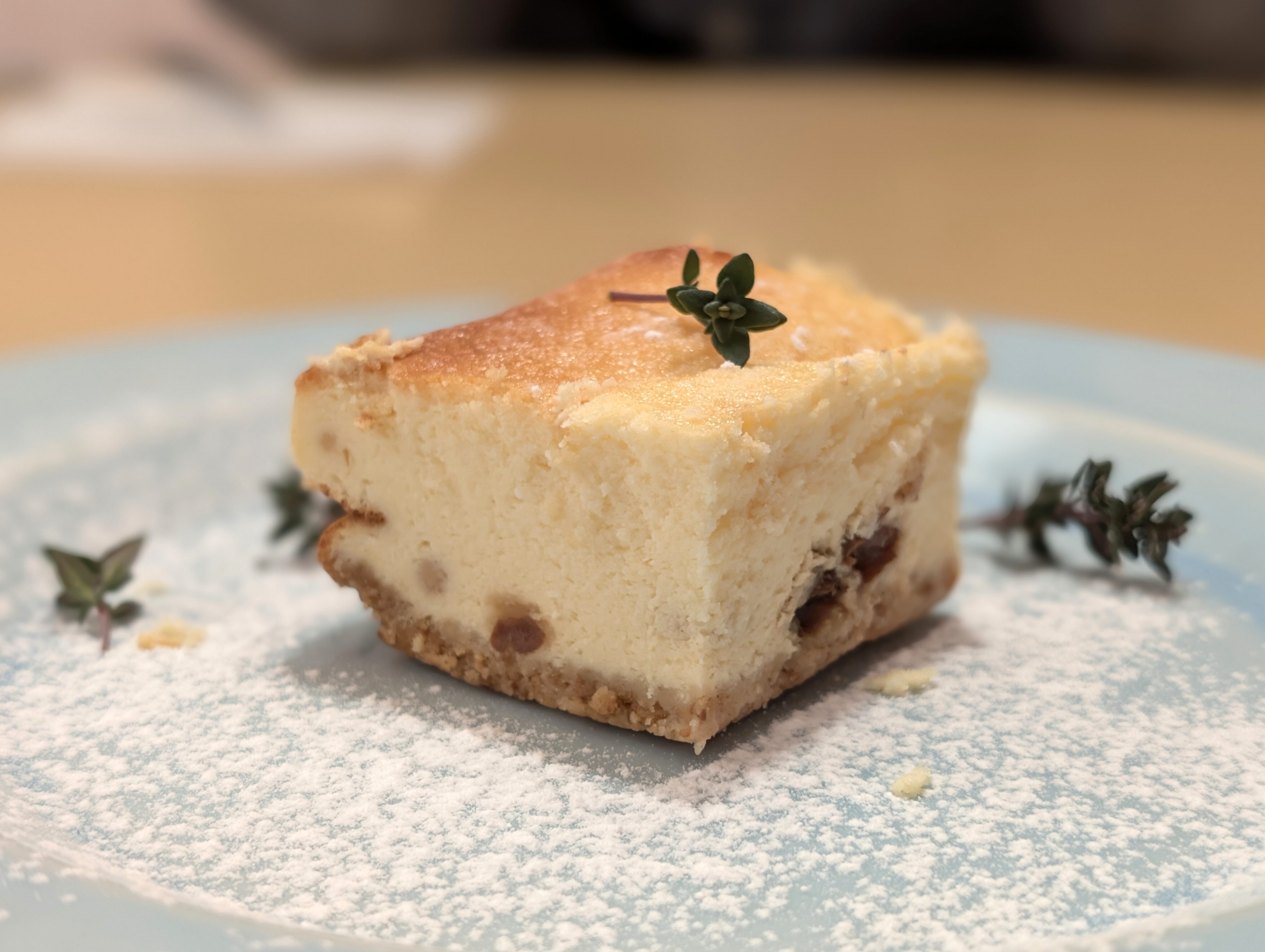 実際のチーズケーキをみていきます。四角いチーズケーキで底にはクッキー生地を敷き、ケーキのなかにはレーズンを入れています。
