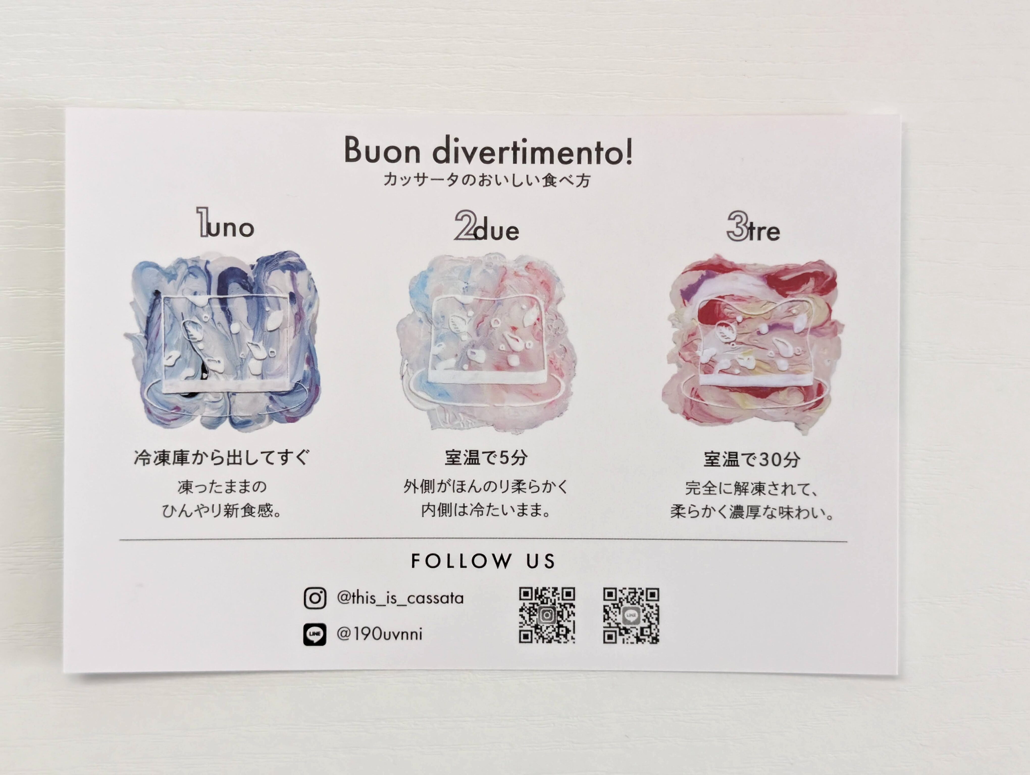 また室温で5分置いて食べるパターンと室温で30分置いて食べるパターンも紹介されています。それぞれ微妙に異なる質感を楽しめるとのことです。