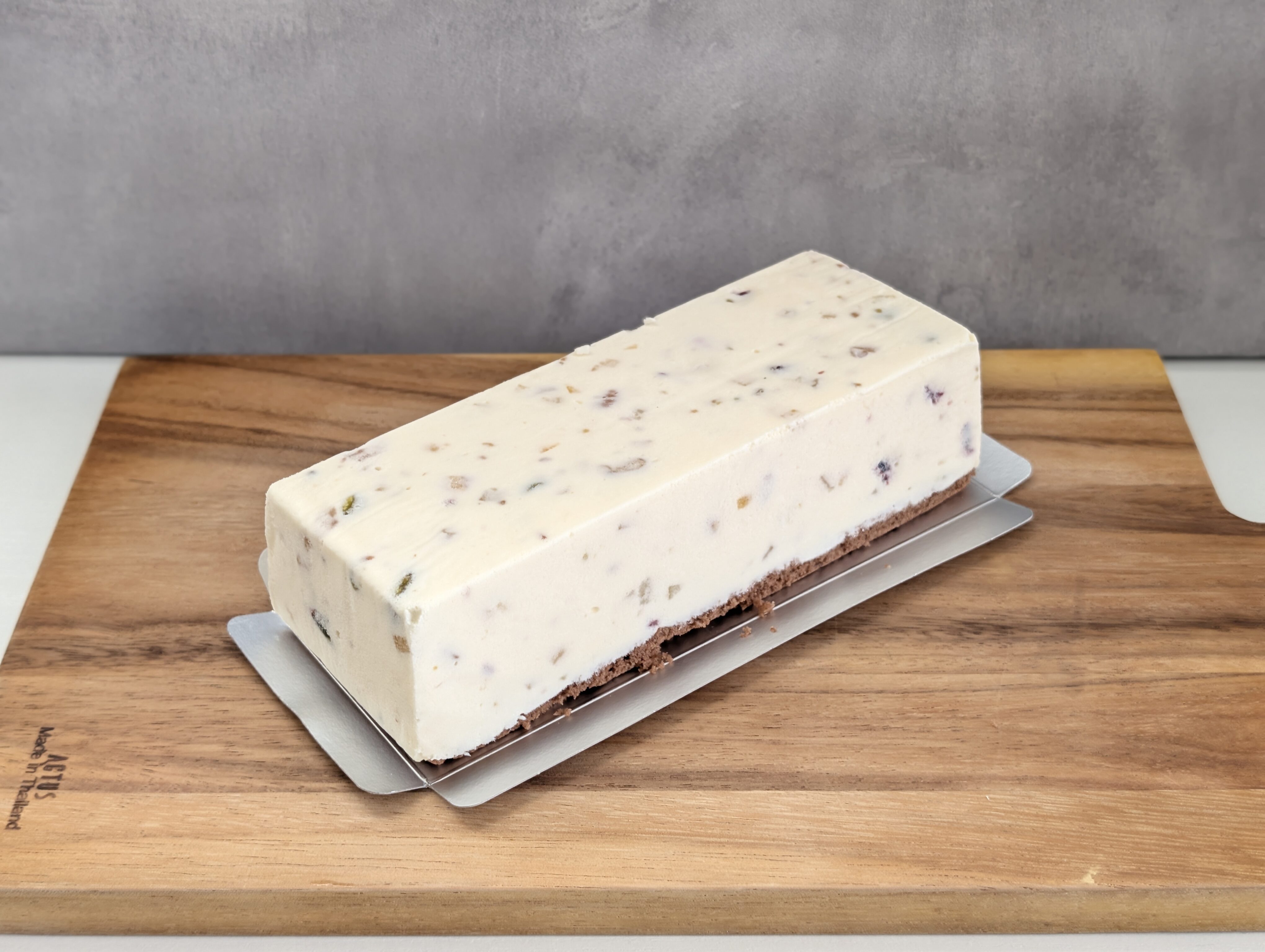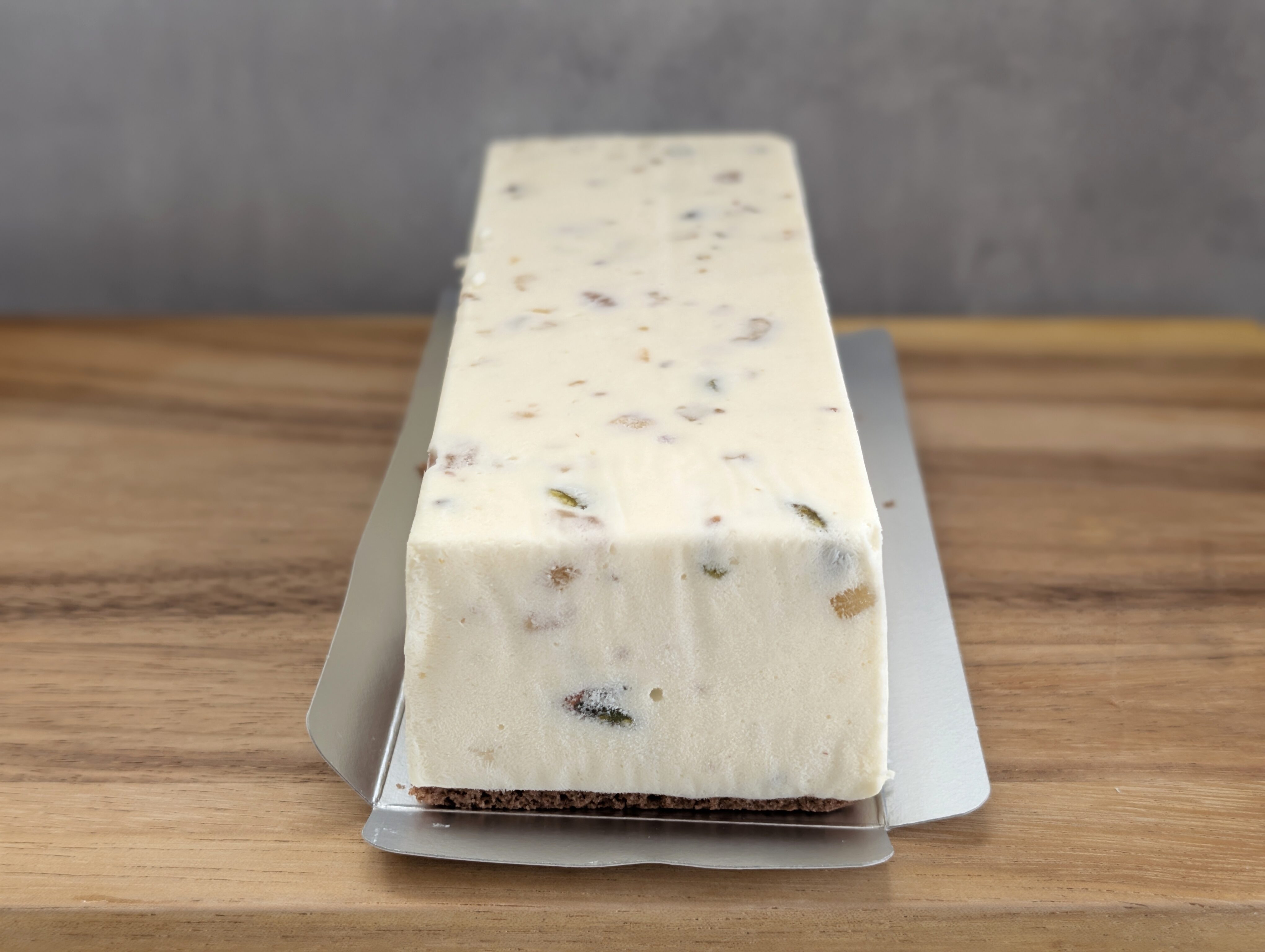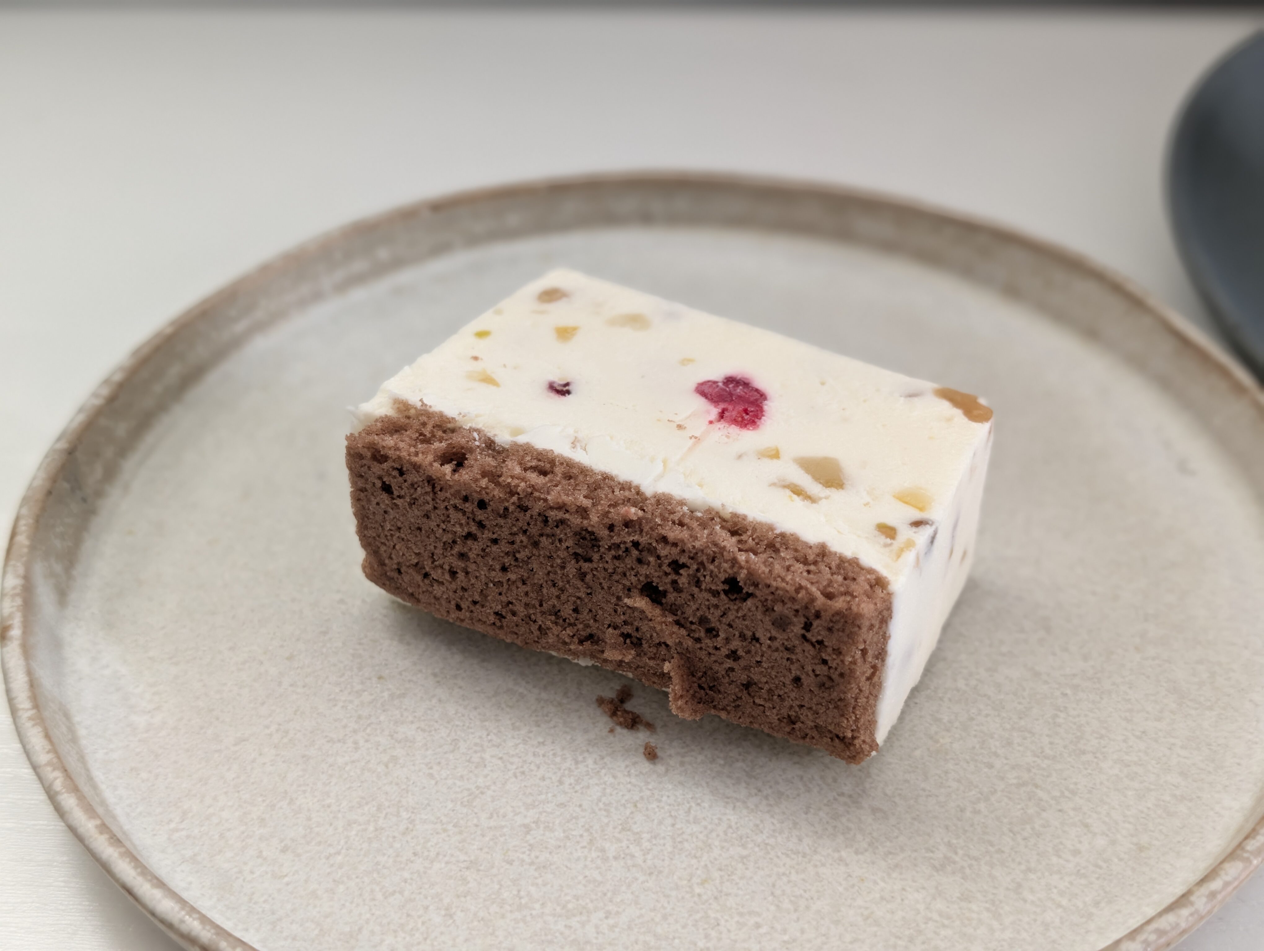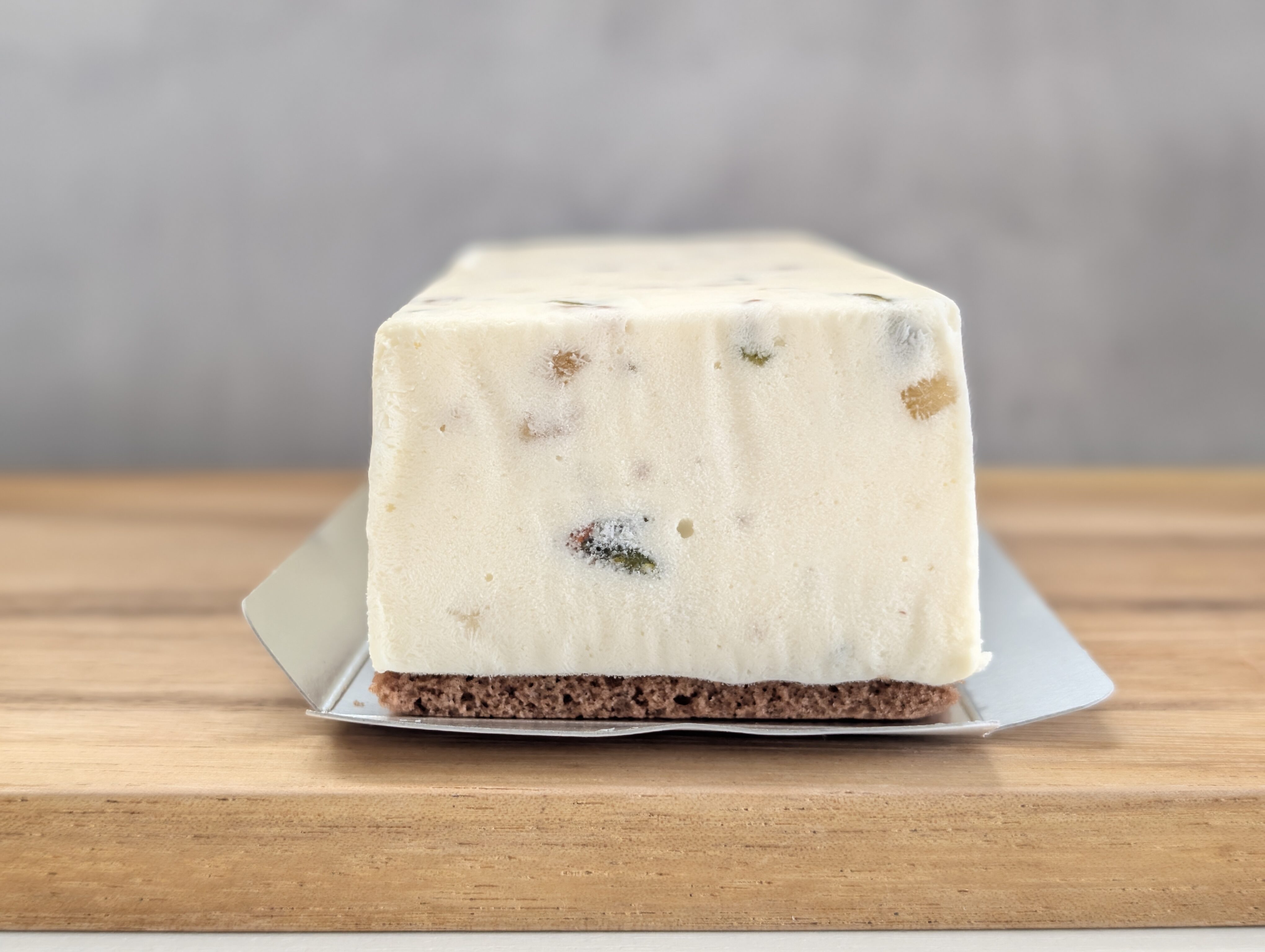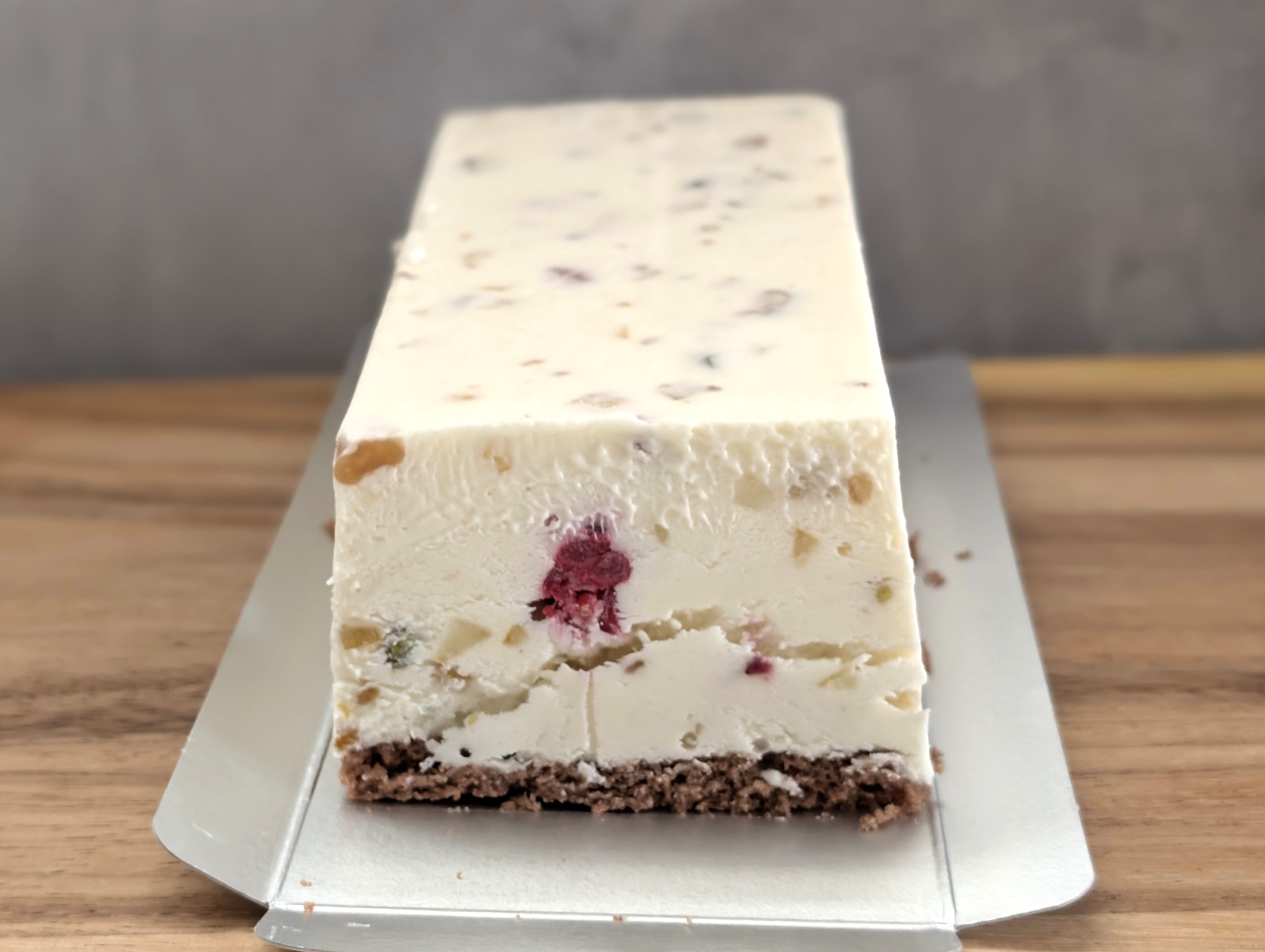 スクエア型で、白く、そして中にドライフルーツや果物が入っています。また底には2cmほどの、ココア風味のスポンジ生地を敷いています。
