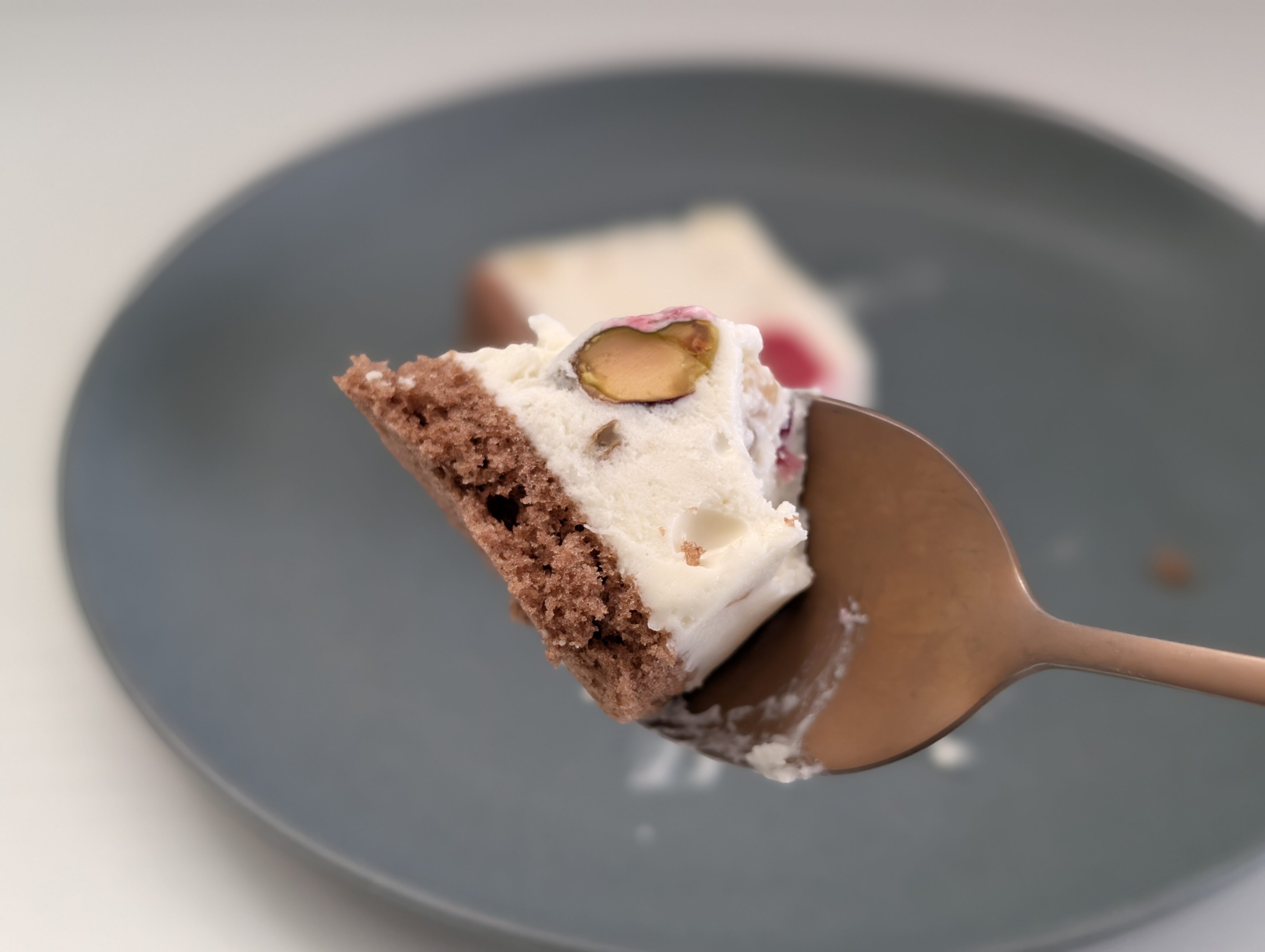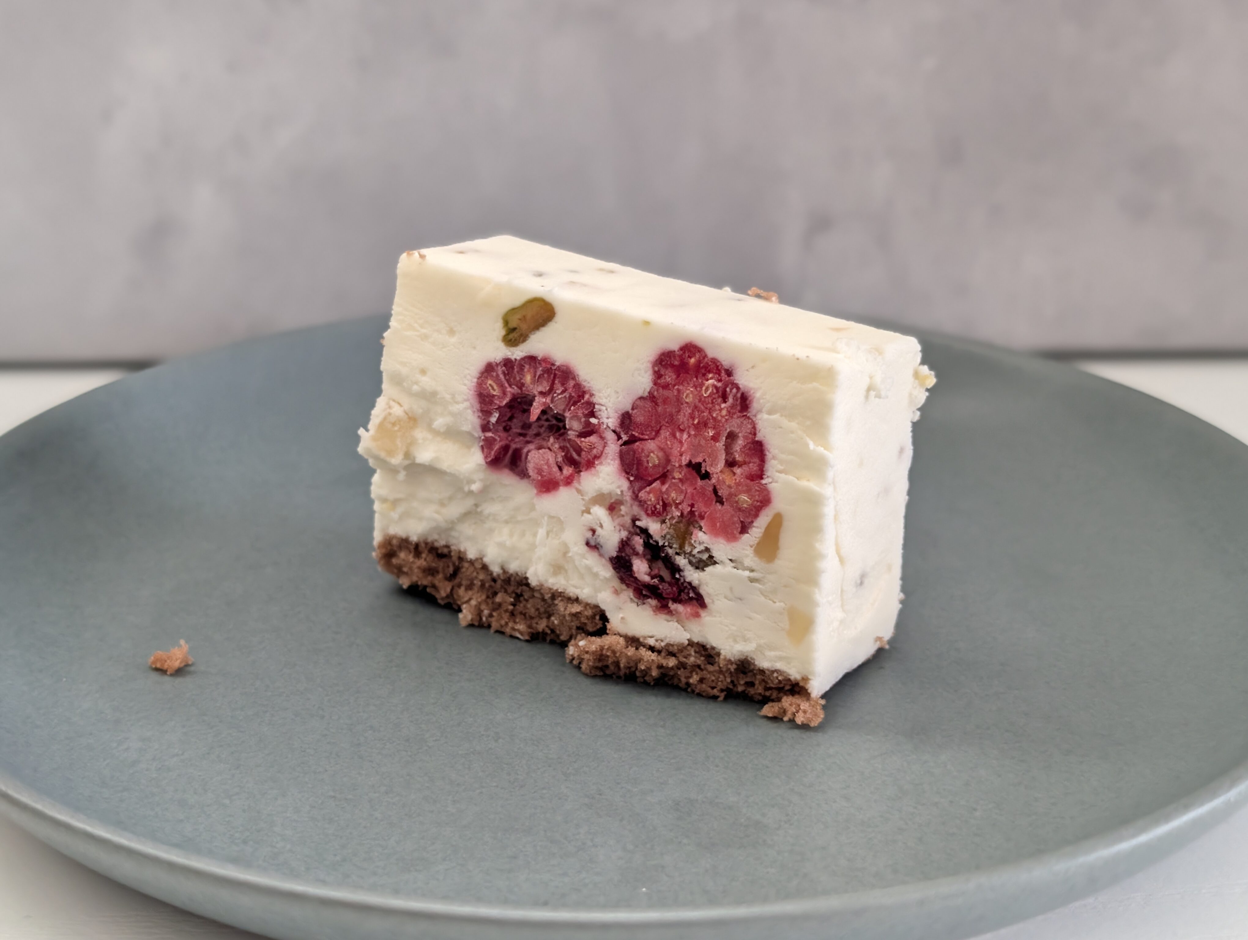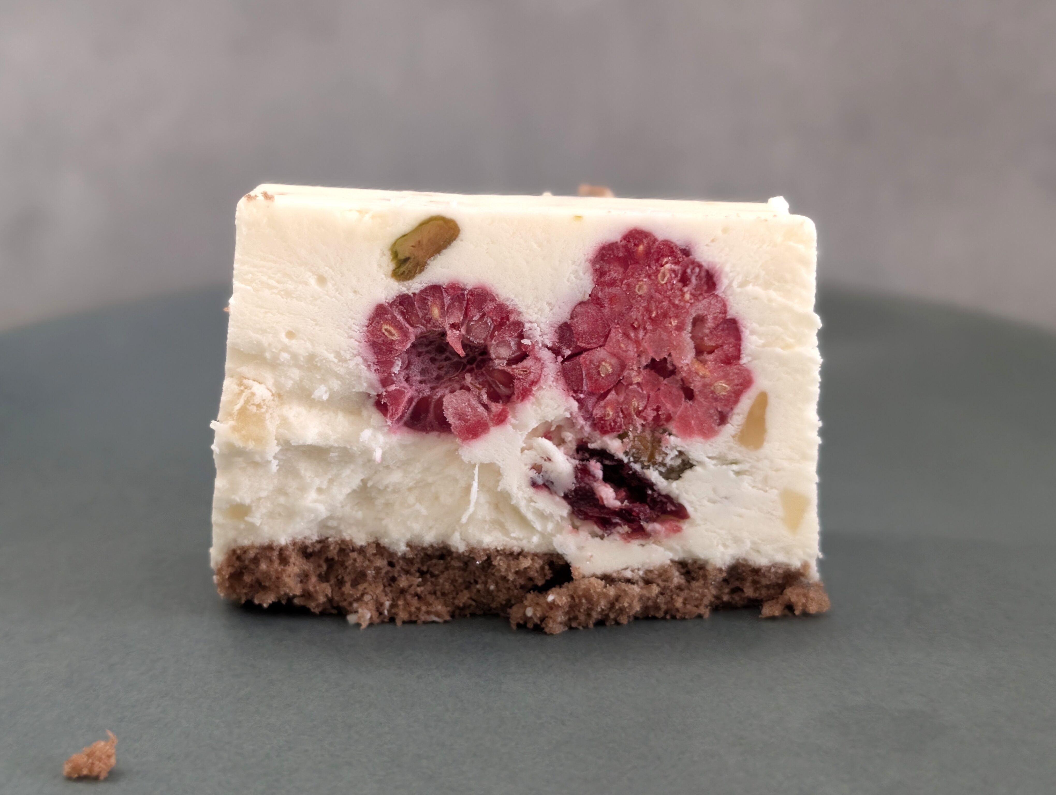 フレッシュチーズがベースなので、わかりやすいチーズ感といったものはありませんが、ミルキーな味わいがふわりと口の中にとけ込んでいきます。ピスタチオのやさしい甘み、各種ナッツの芳醇な香ばしさ、ラズベリーのみずみずしい酸味が重なり合い、口の中で広がる味の饗宴は格別です。そこへ時折、ココアスポンジのほろ苦い風味がそっと忍び込み、全体の味わいに奥行きと深みを添えてくれます。