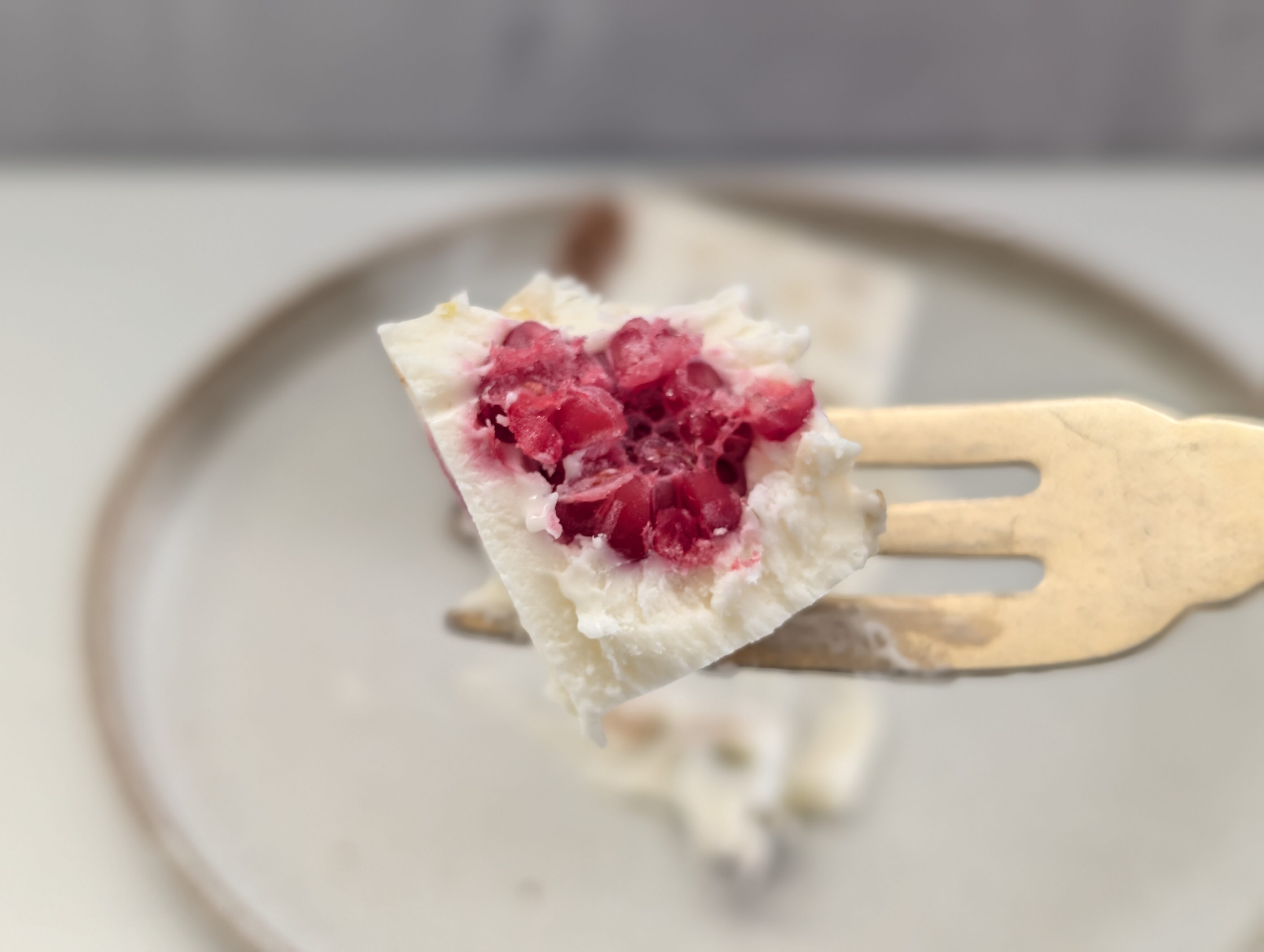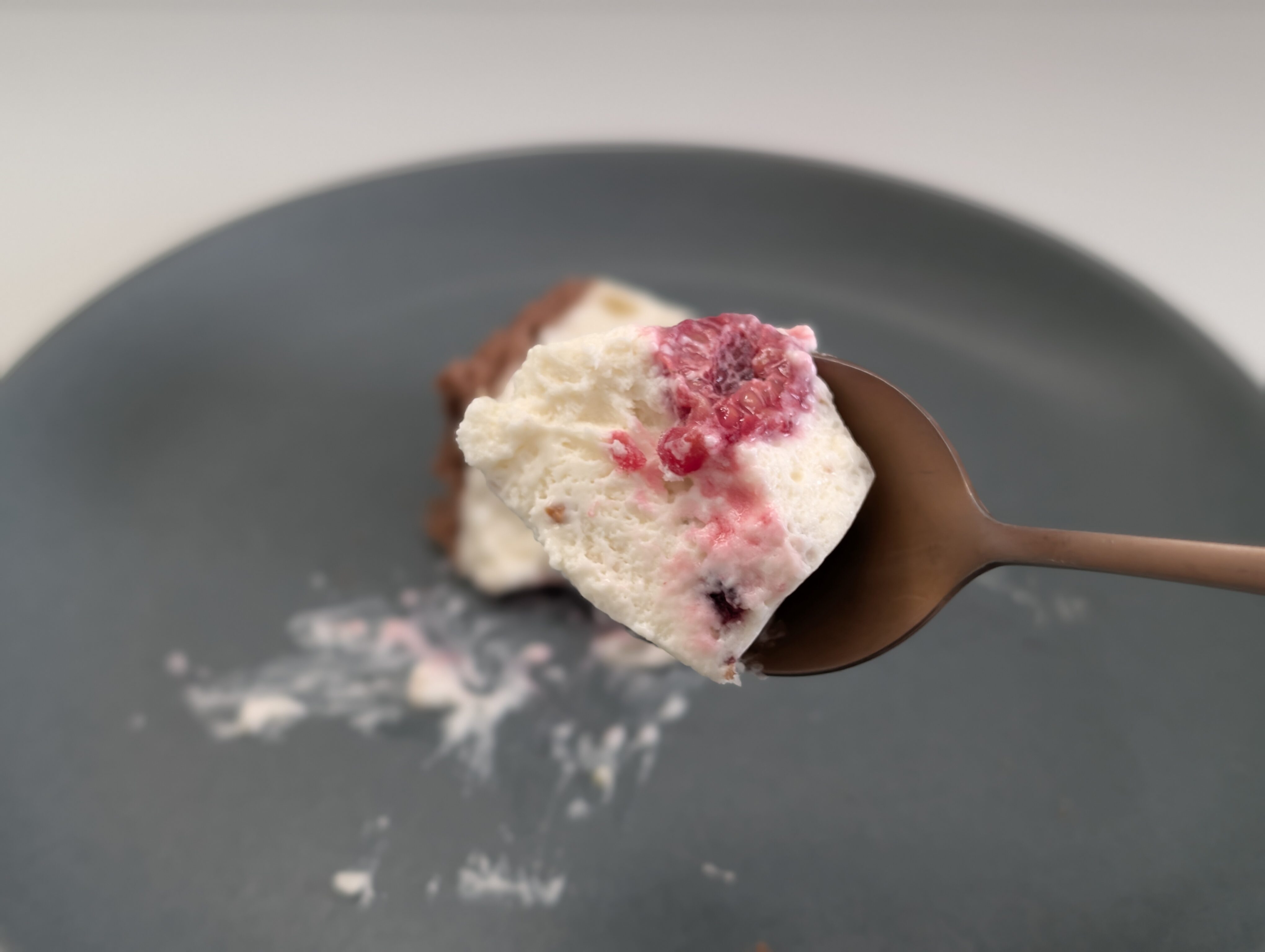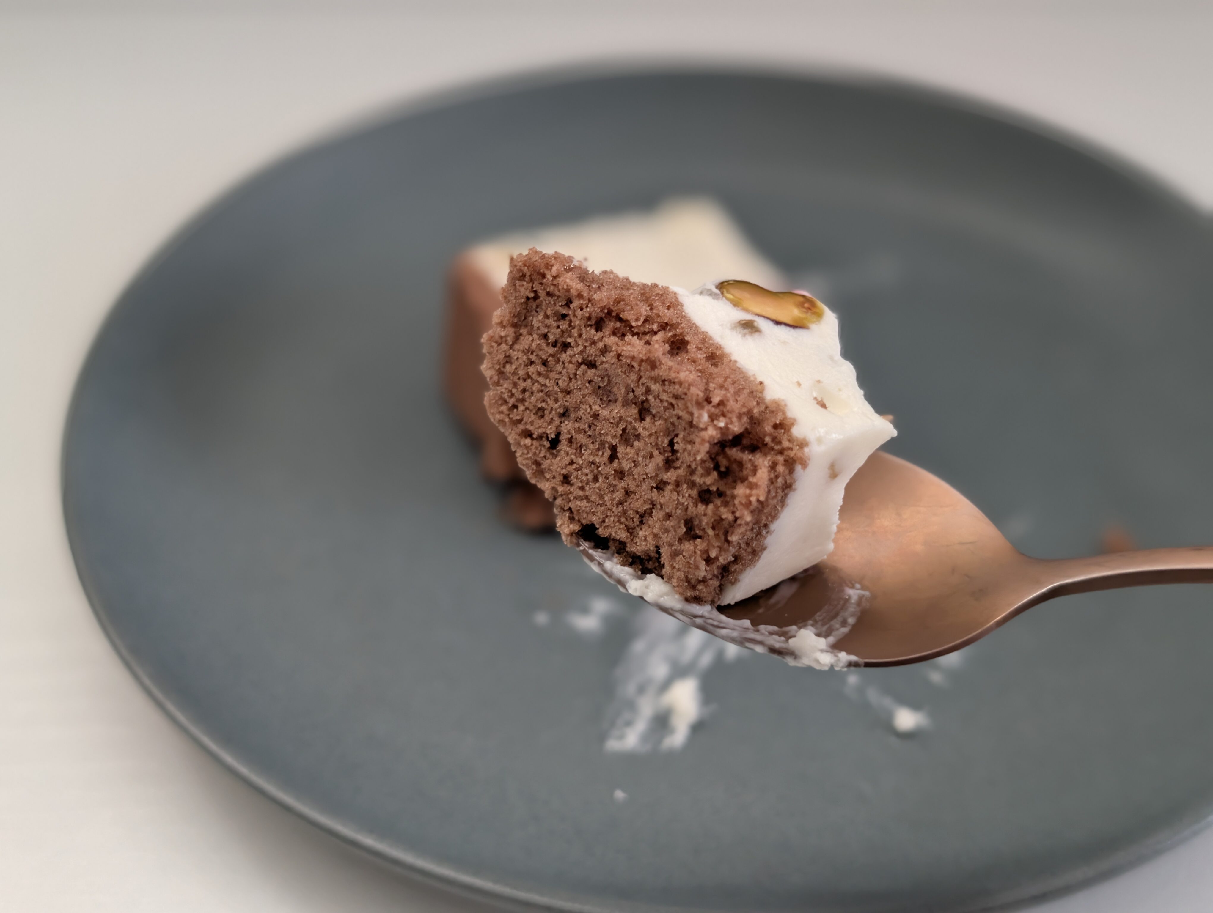 フレッシュチーズがベースなので、わかりやすいチーズ感といったものはありませんが、ミルキーな味わいがふわりと口の中にとけ込んでいきます。ピスタチオのやさしい甘み、各種ナッツの芳醇な香ばしさ、ラズベリーのみずみずしい酸味が重なり合い、口の中で広がる味の饗宴は格別です。そこへ時折、ココアスポンジのほろ苦い風味がそっと忍び込み、全体の味わいに奥行きと深みを添えてくれます。