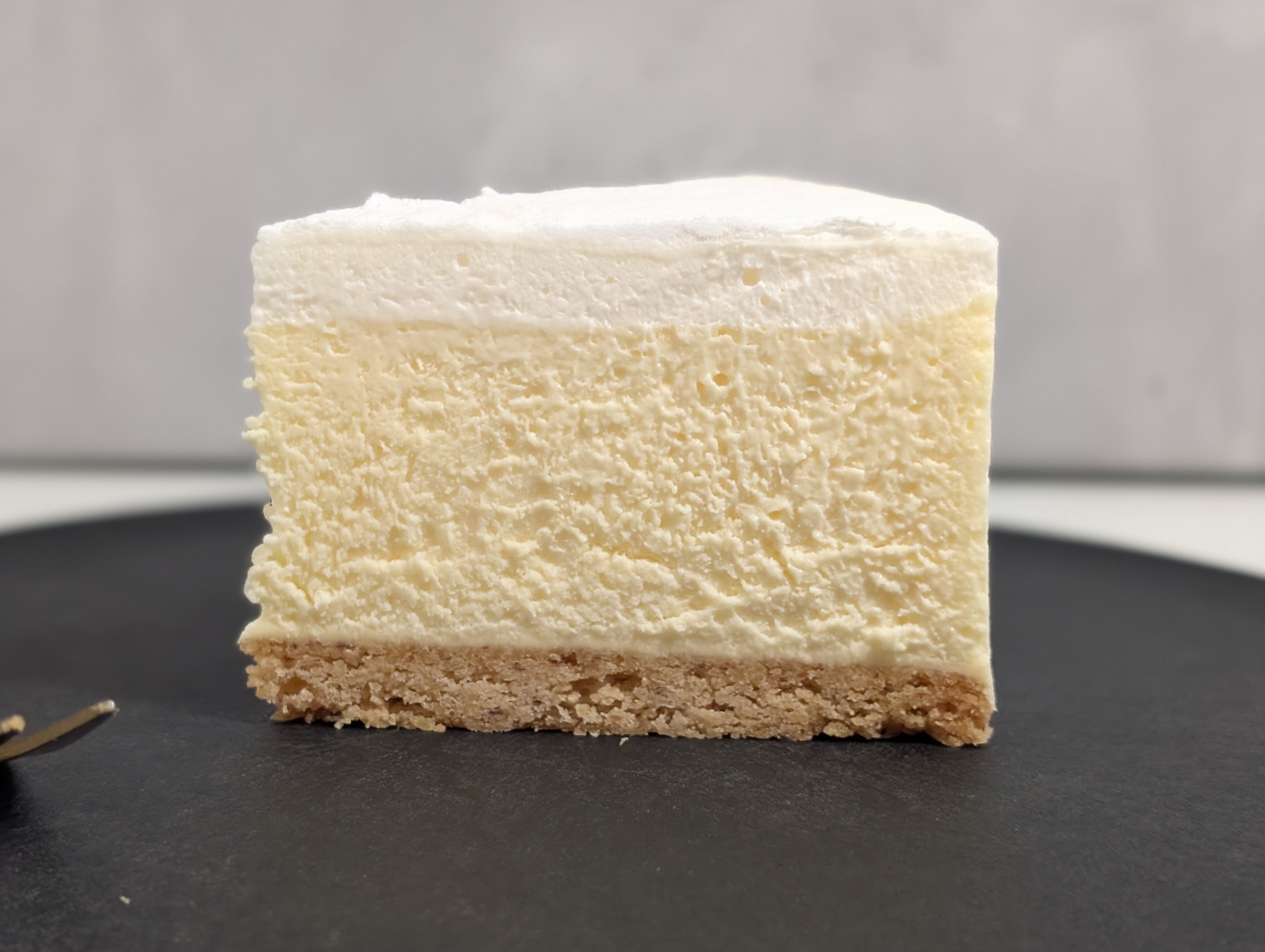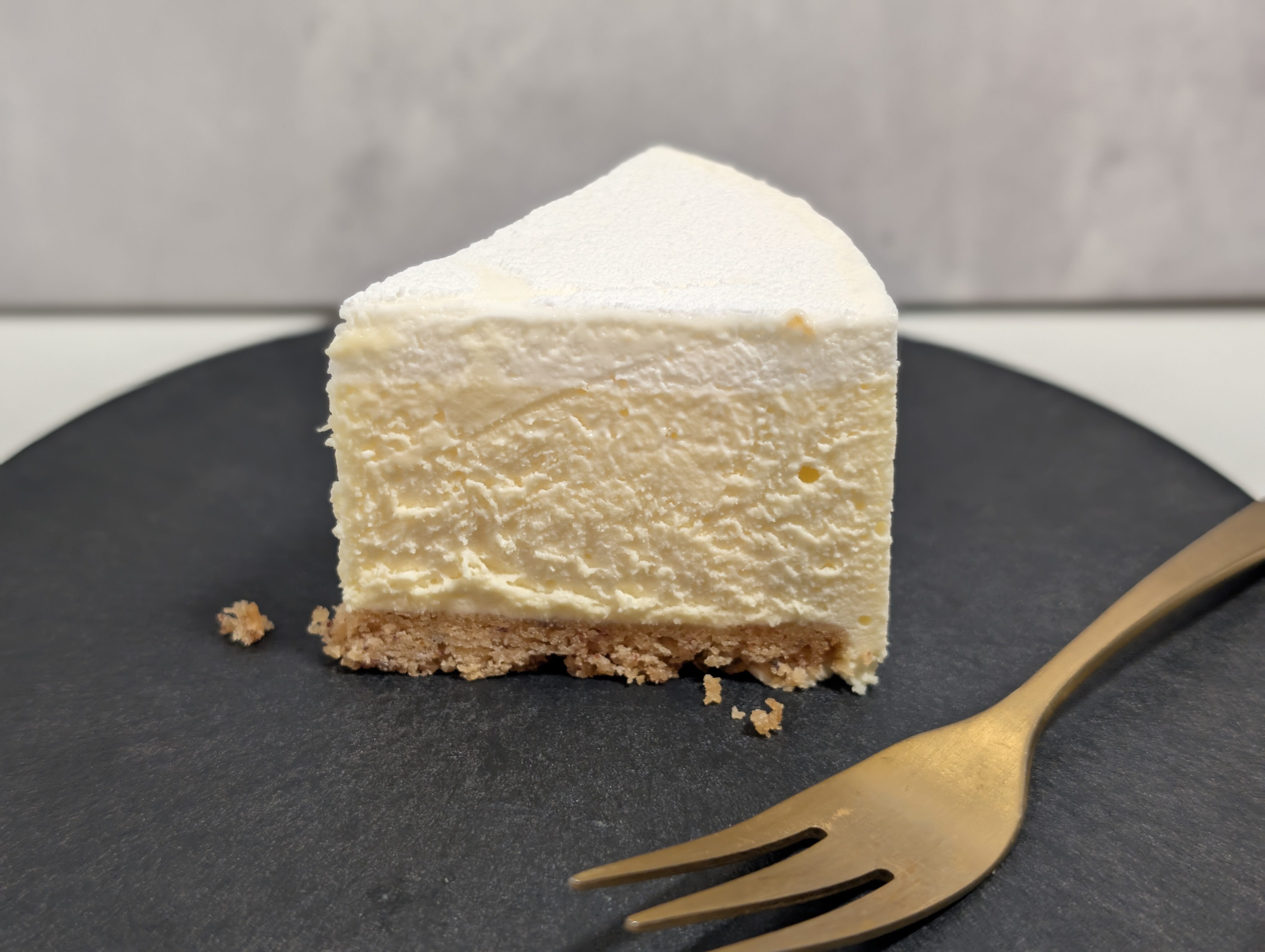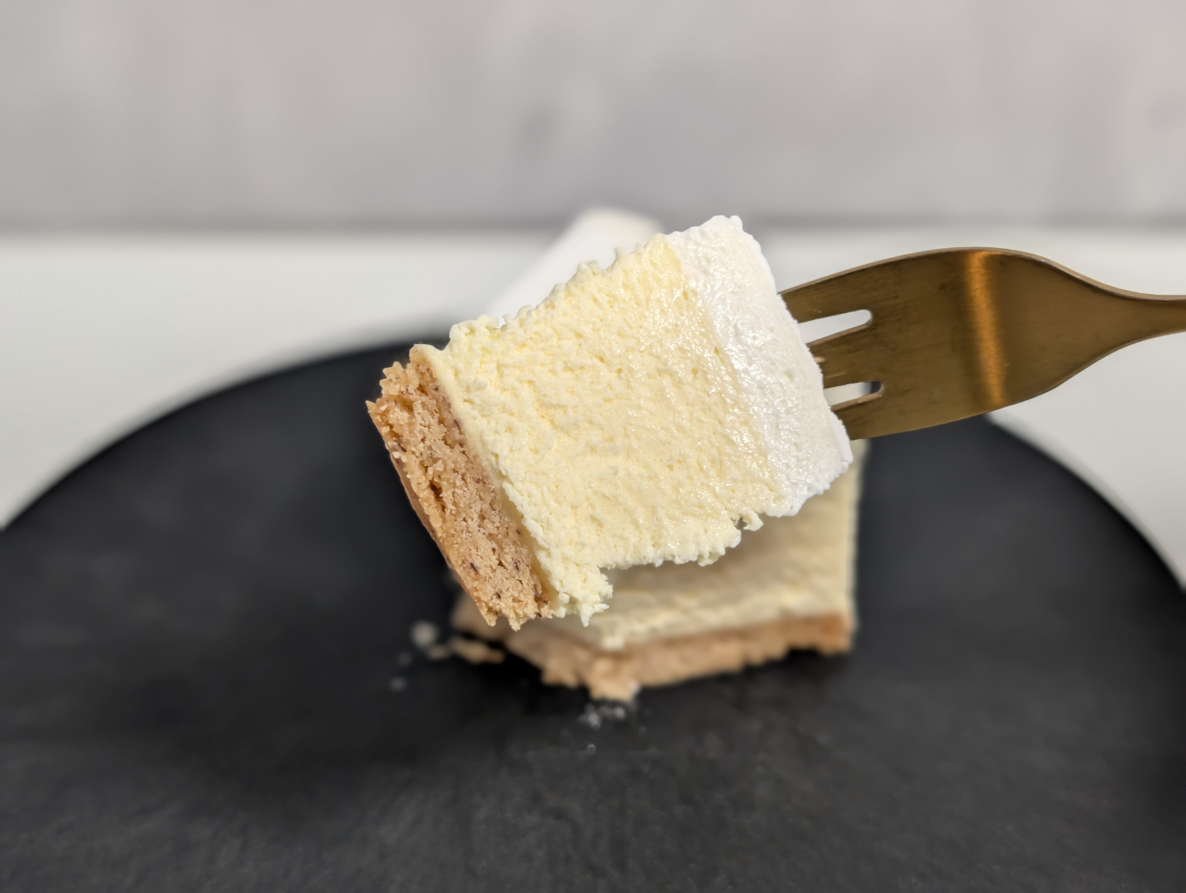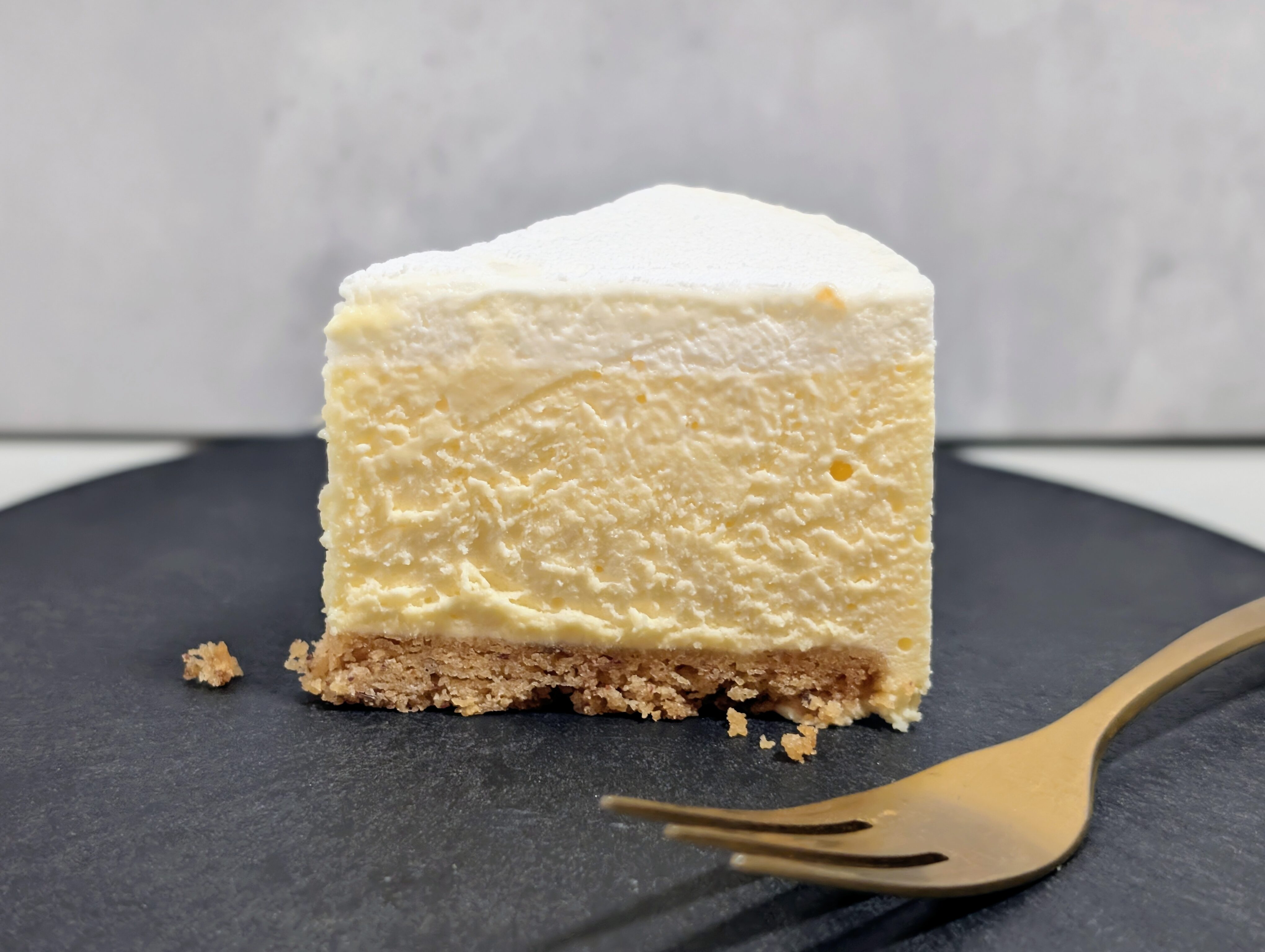 味わいは、軽やかなミルキーさの奥に、カスタードを思わせるまったりとした濃厚さがあります。一般的なレアチーズケーキよりも深みと食べ応えがあるのが大きな特徴といえます。ただしその分、さっぱり系のチーズケーキを期待すると「想像と違う」と感じるかもしれません。