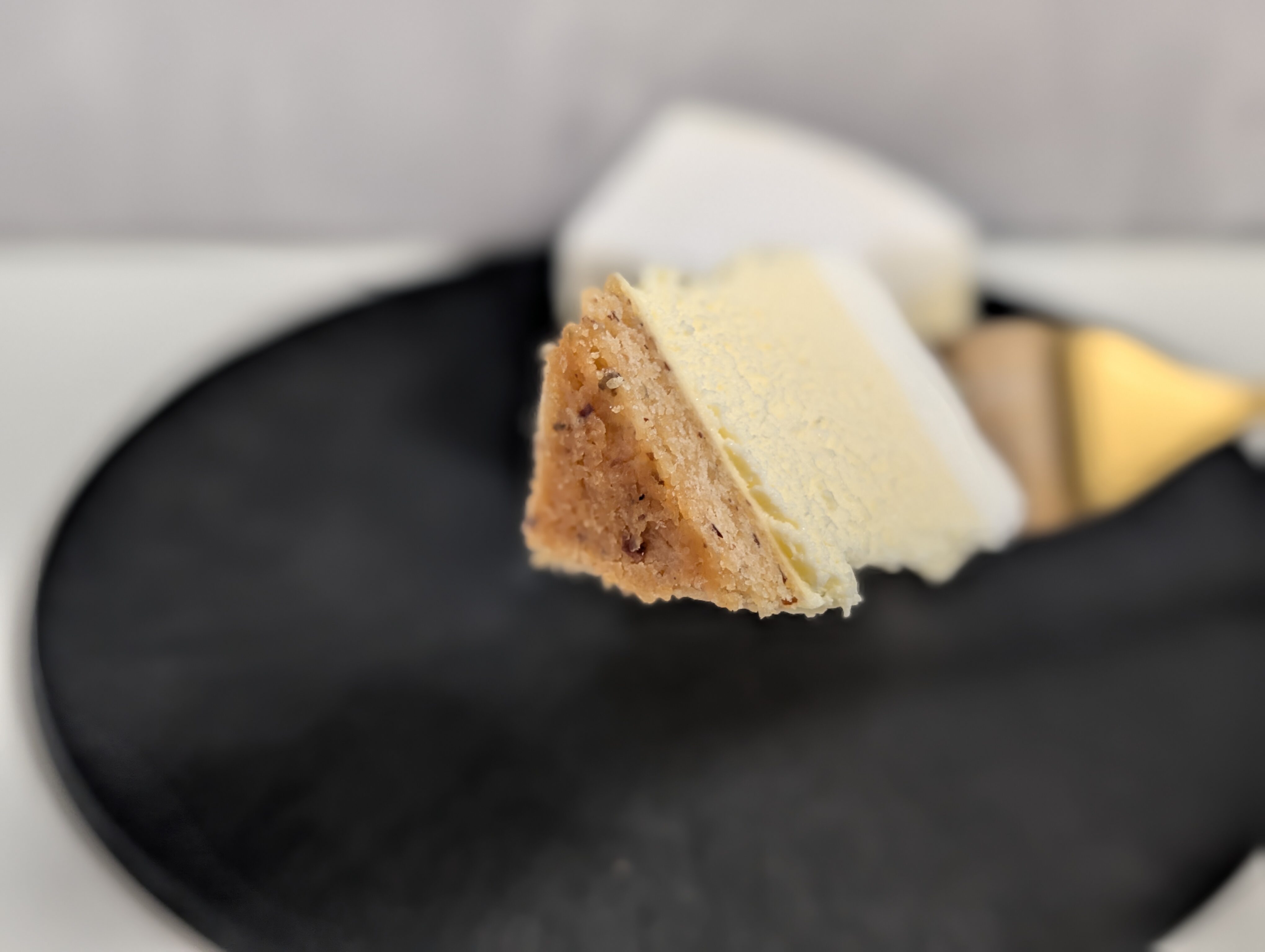 口に入れると、3つの食感が同時に楽しめます。表面のクリームはふわふわ、チーズ層はとろりと溶け、底のクッキーはザクザクとした歯ごたえがあります。