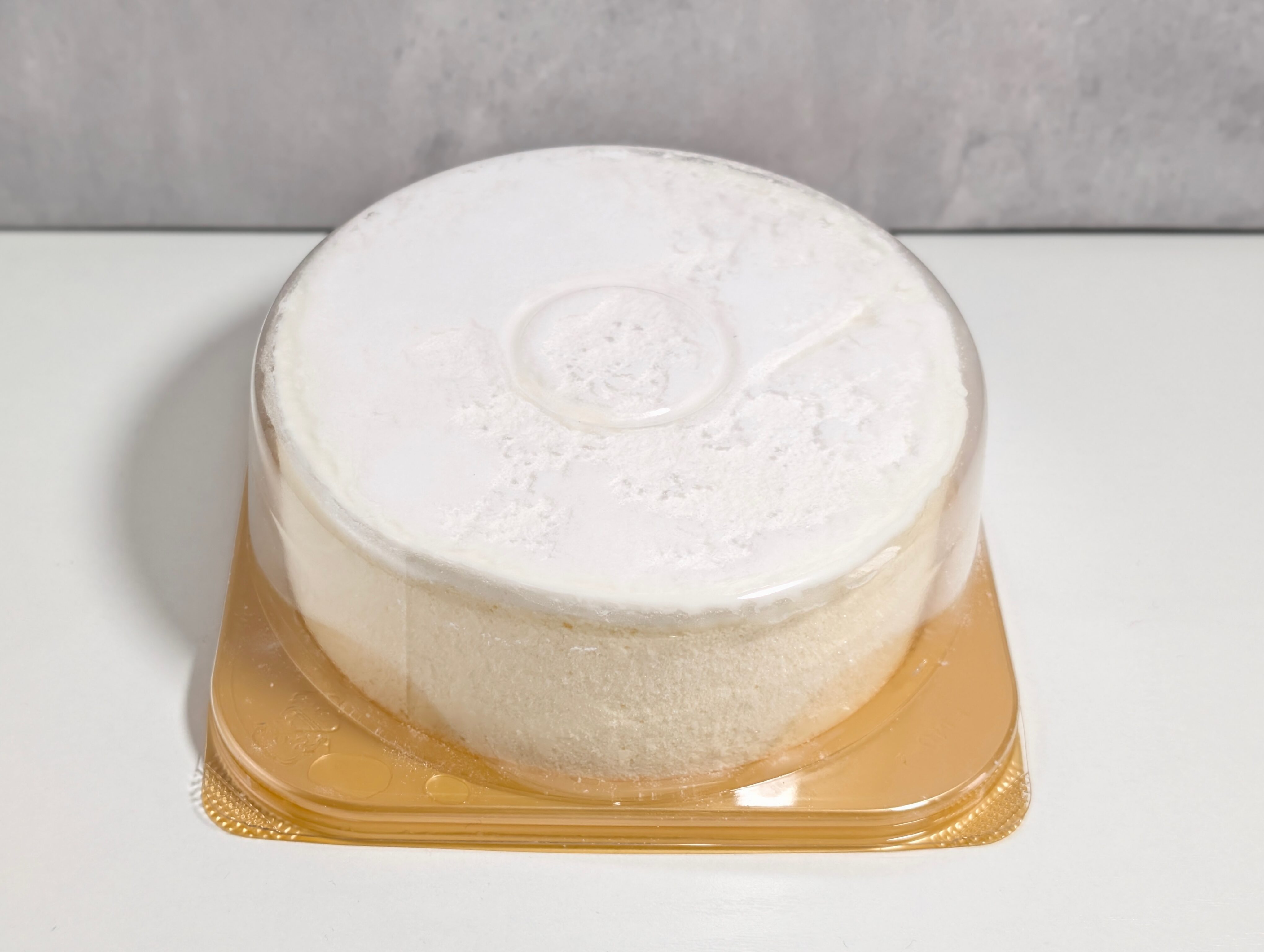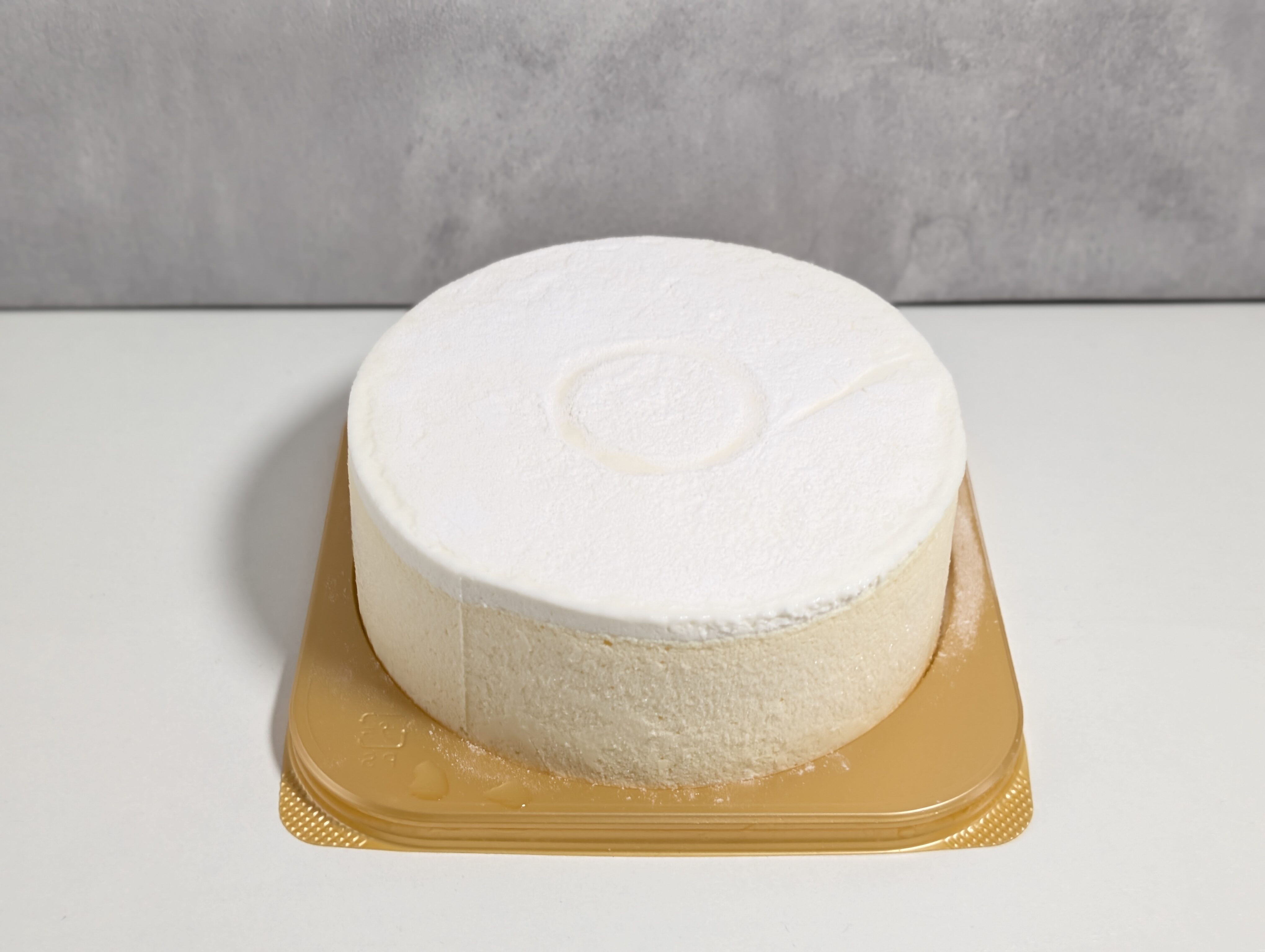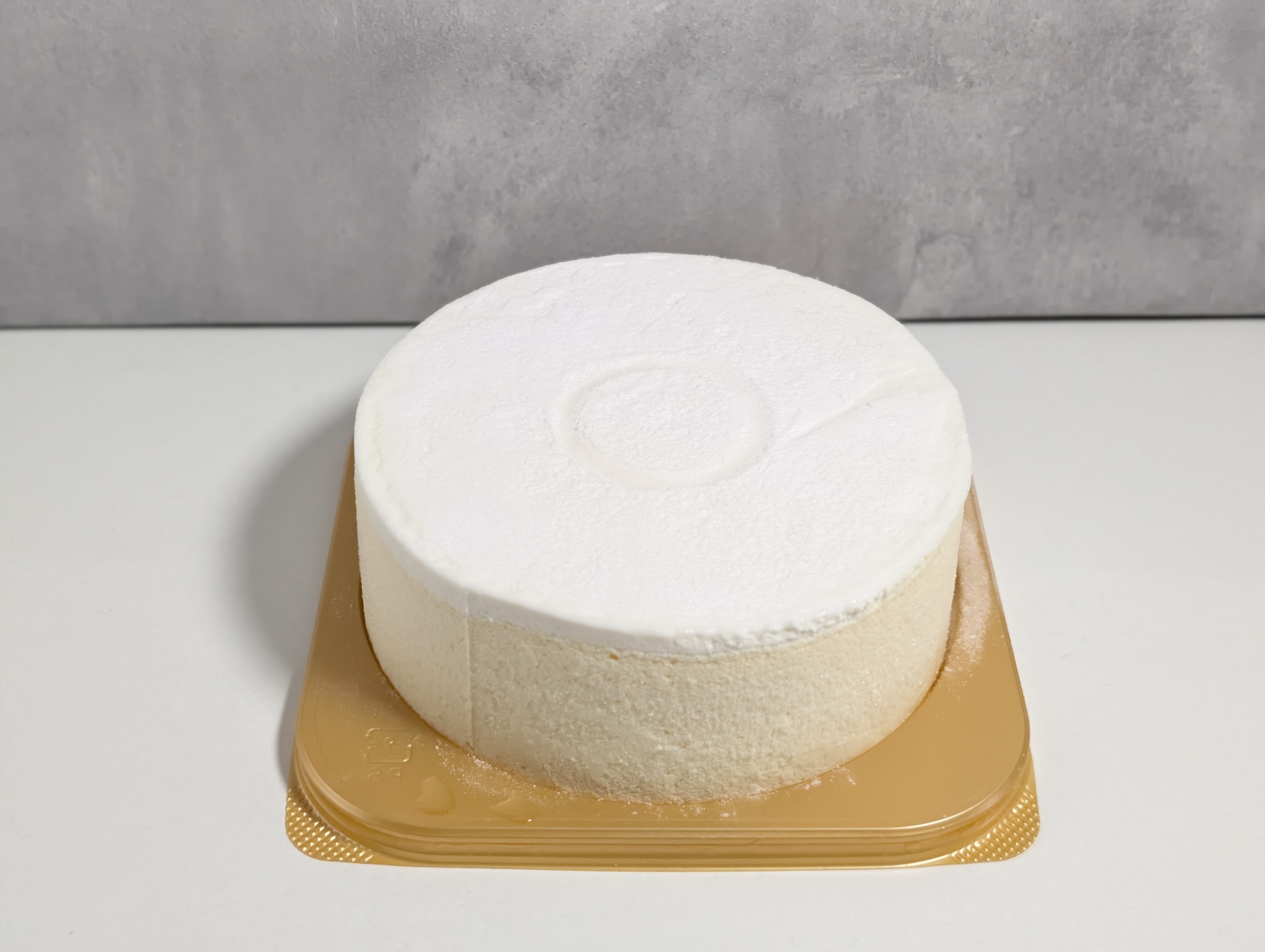 ケーキは円柱型で、表面は真っ白なクリームで覆われています。