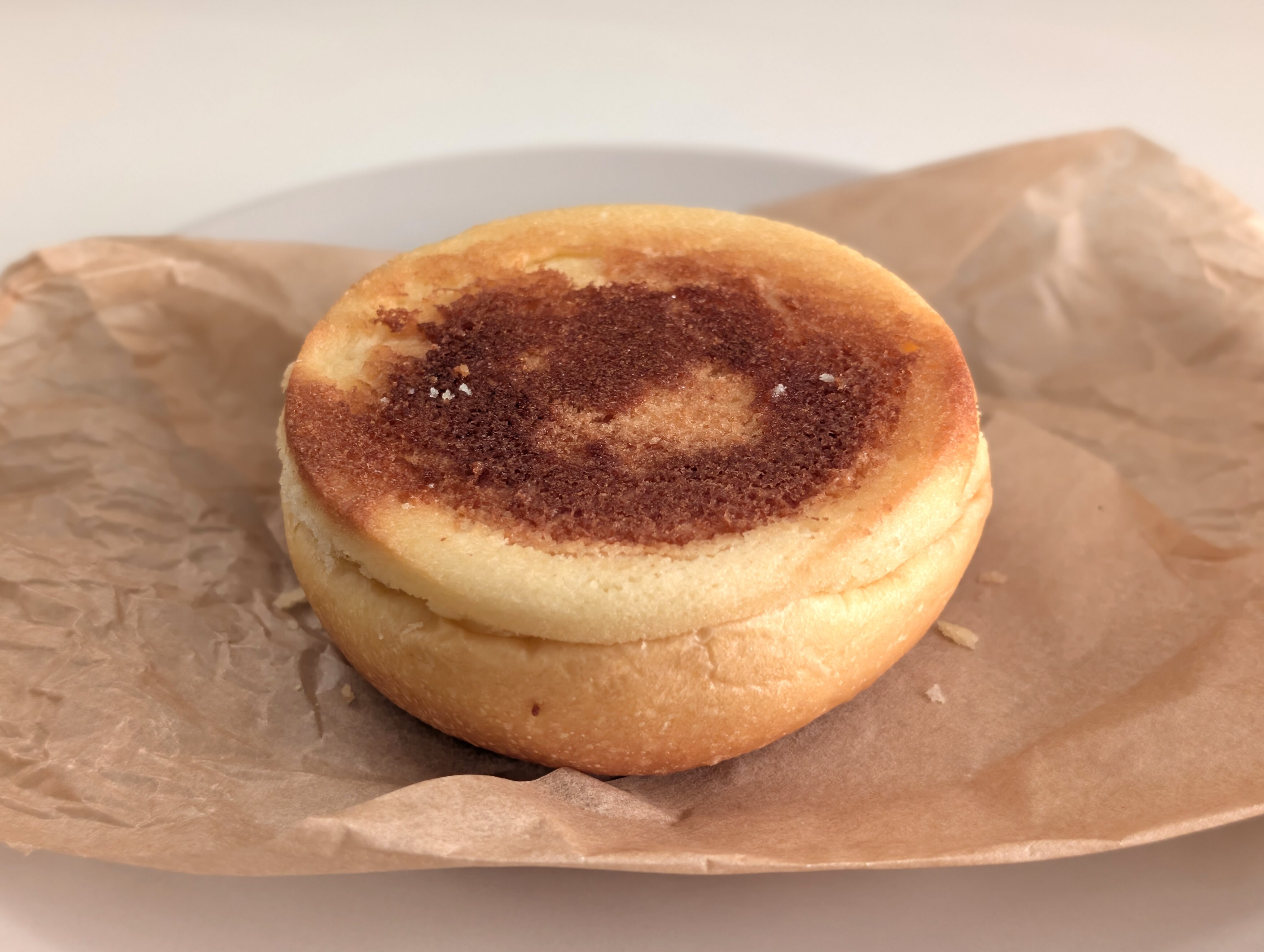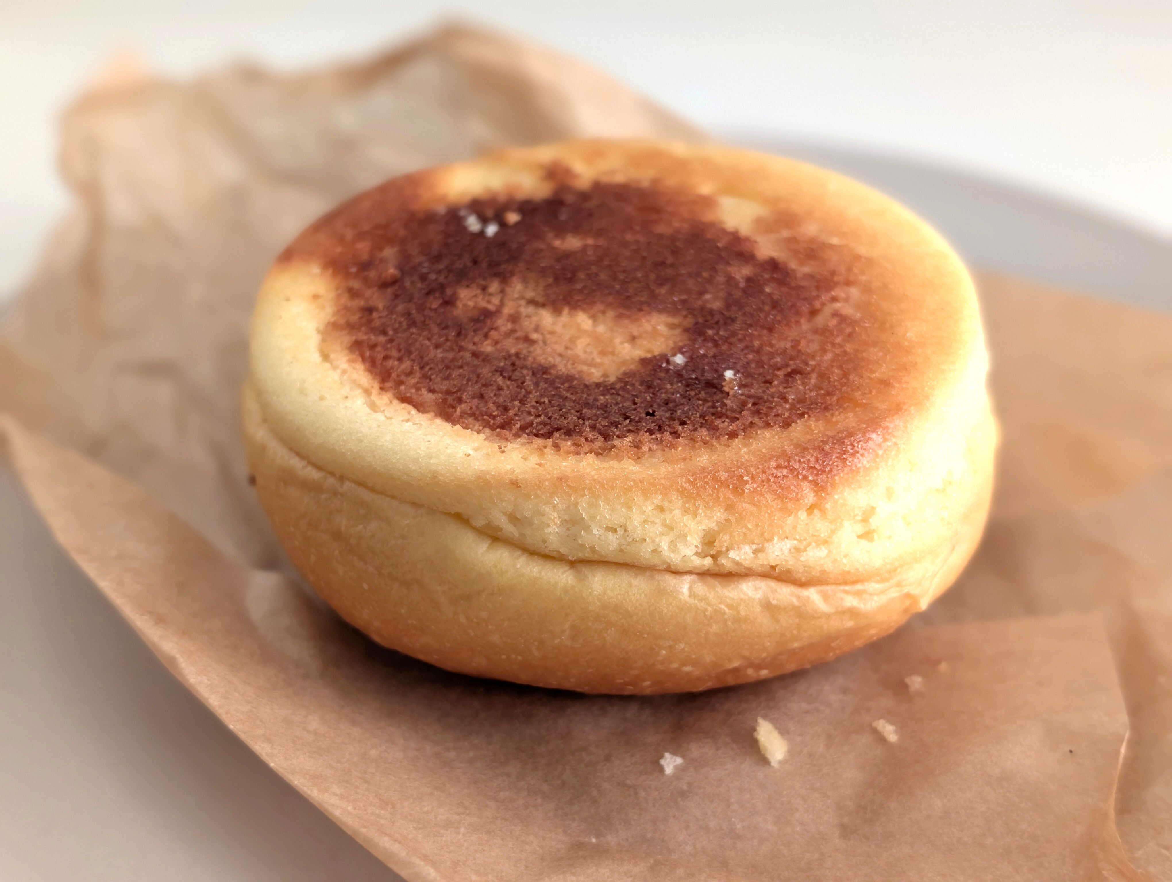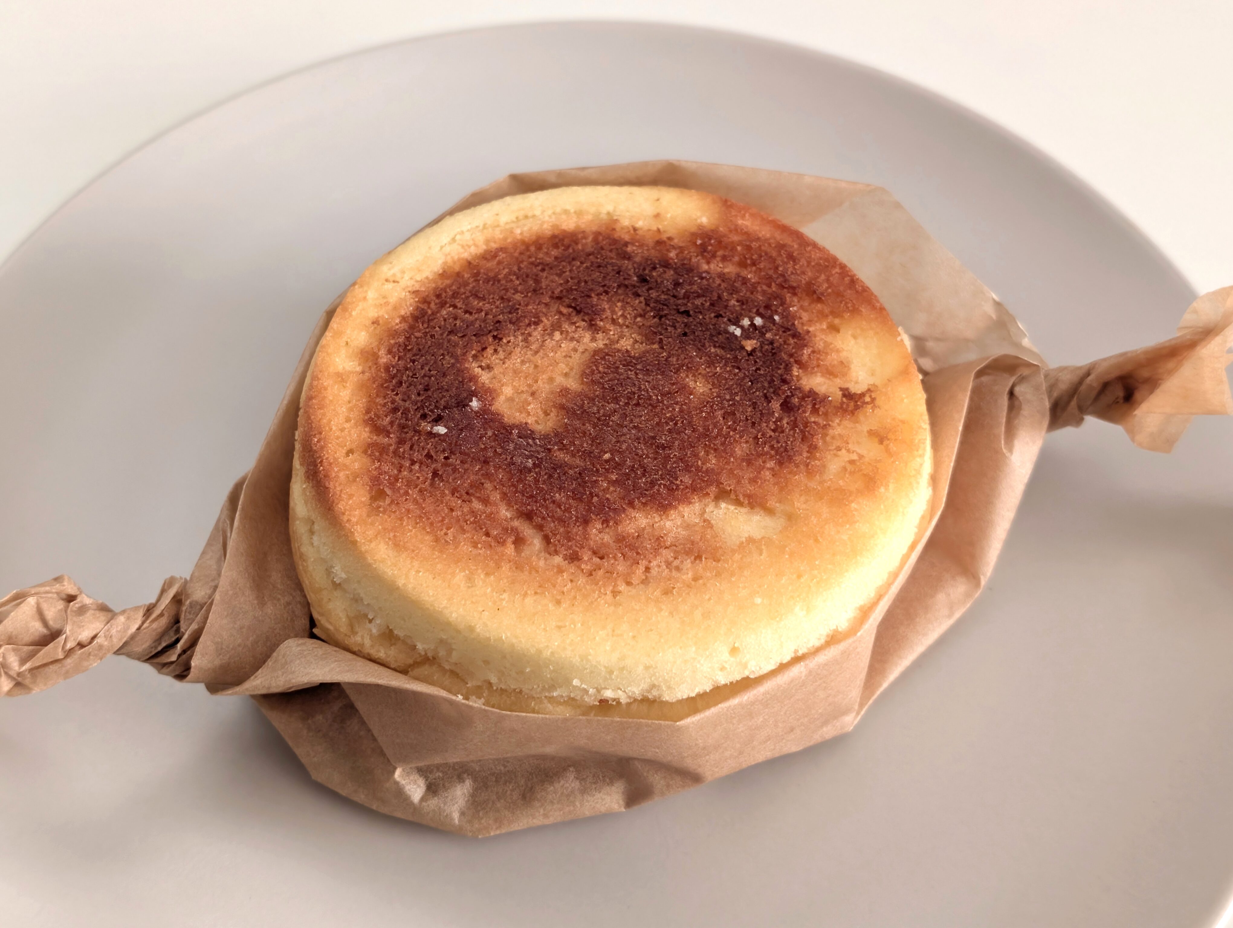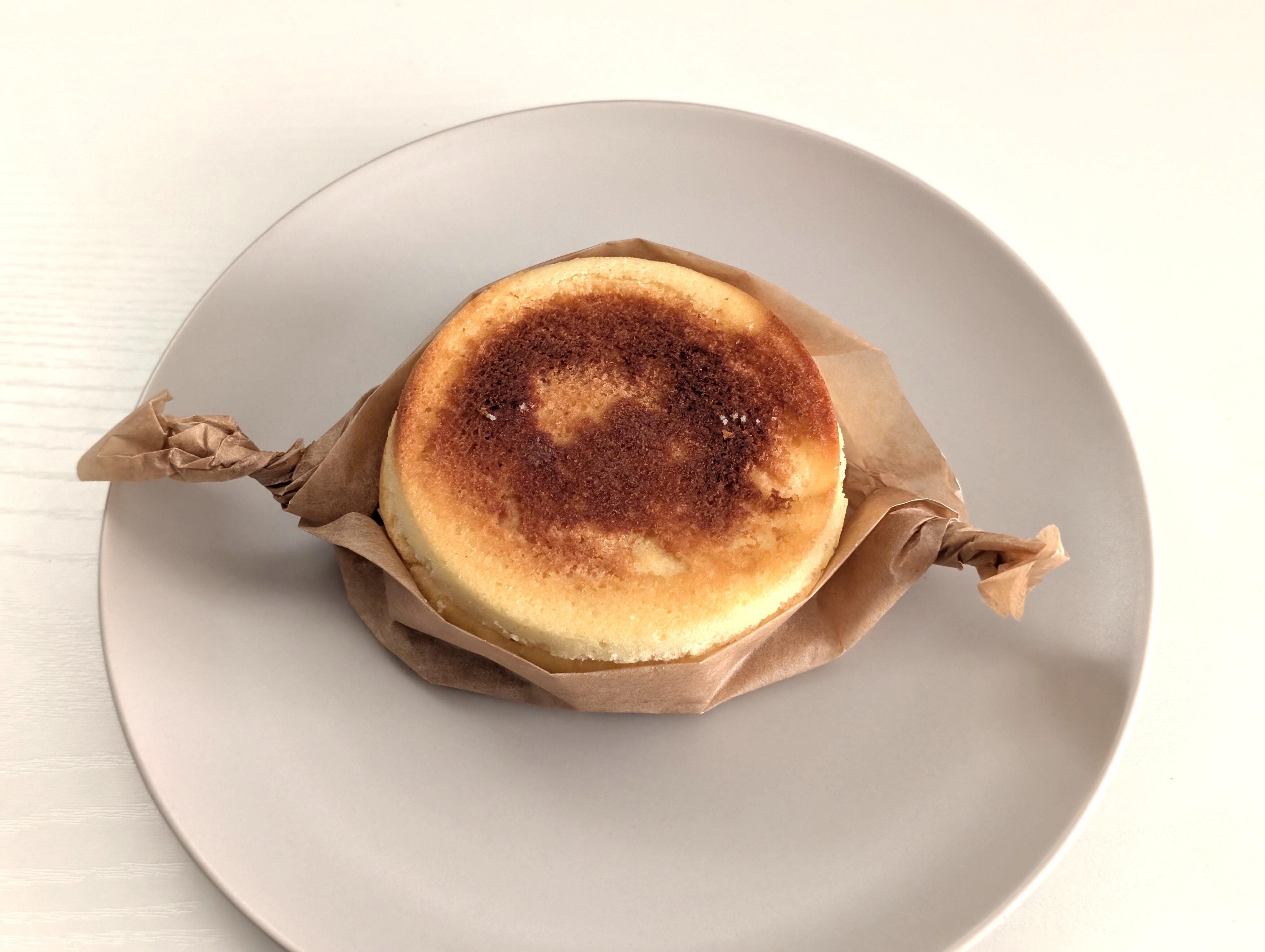 今回発売されたバスクチーズケーキ風パンは、丸い菓子パンで、表面にはクッキー生地のようなものをのせ、若干焦がすことでバスクチーズケーキの外見を再現しています。