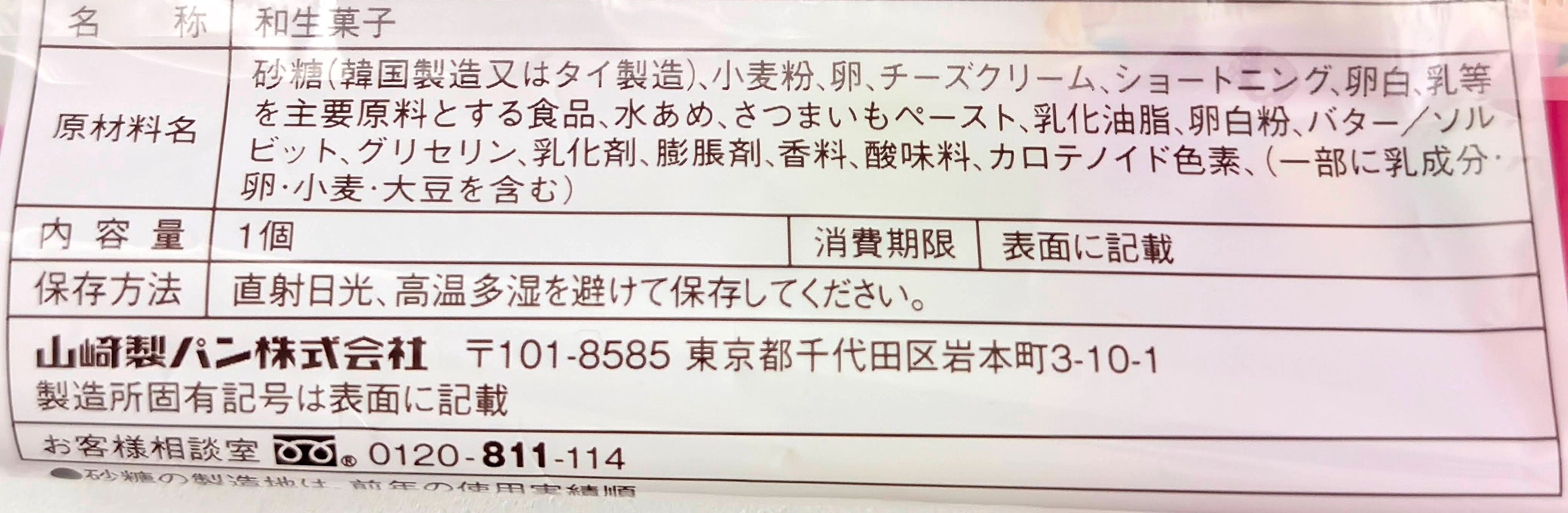 原材料名砂糖(韓国製造又はタイ製造)、小麦粉、卵、チーズクリーム、ショートニング、卵白、乳等を主要原料とする食品、水あめ、さつまいもペースト、乳化油脂、卵白粉、バター/ソルビット、グリセリン、乳化剤、膨脹剤、香料、酸味料、カロテノイド色素、(一部に乳成分・卵・小麦・大豆を含む)